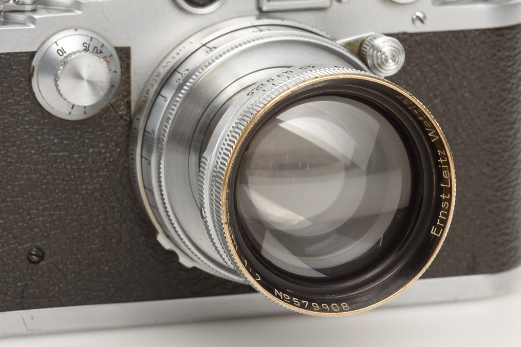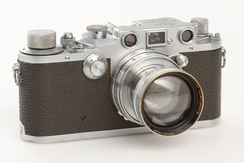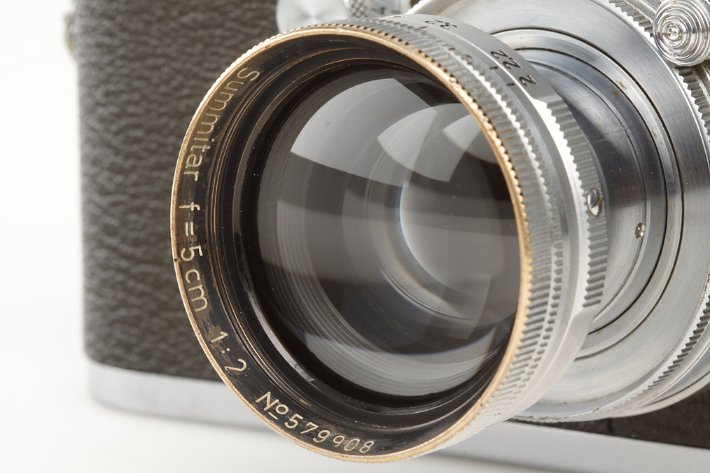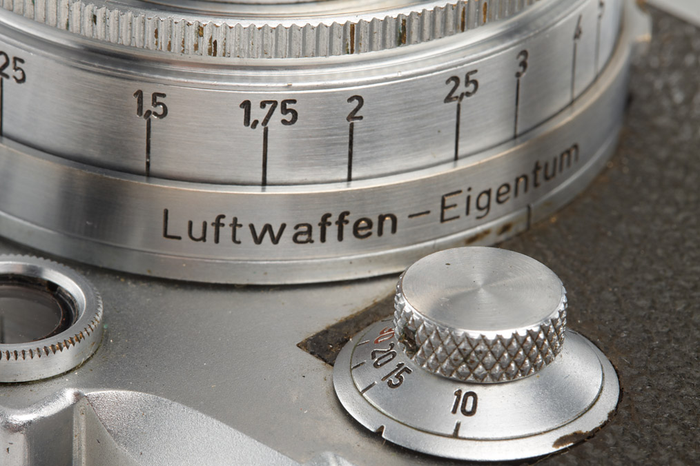 rare and fully original chrome Luftwaffen camera, top plate engraved: FL.no.38079 + 'Luftwaffen-Eigentum', grey leather covering (partly broken), red shutter blind, delivered on January 16th, 1941 to BLN Berlin, delivery number 19787, Summitar 2/5cm no.579908 engraved: 'Luftwaffen-Eigentum', delivered on September 16th, 1942 to BLN Berlin, delivery number 9113