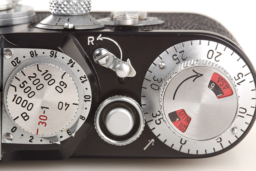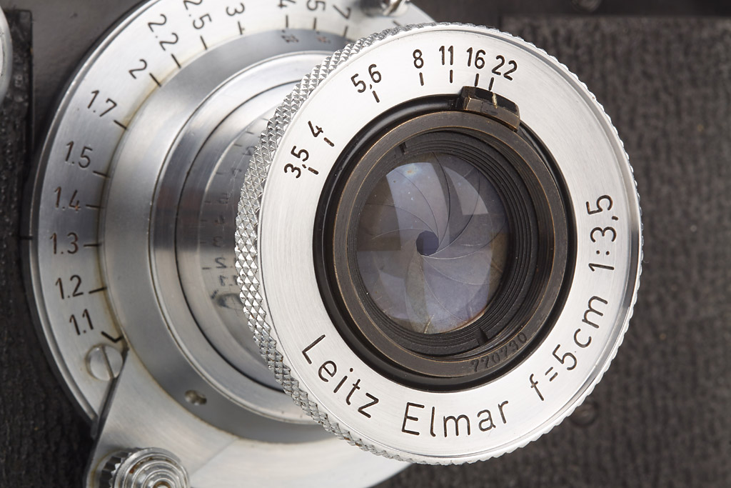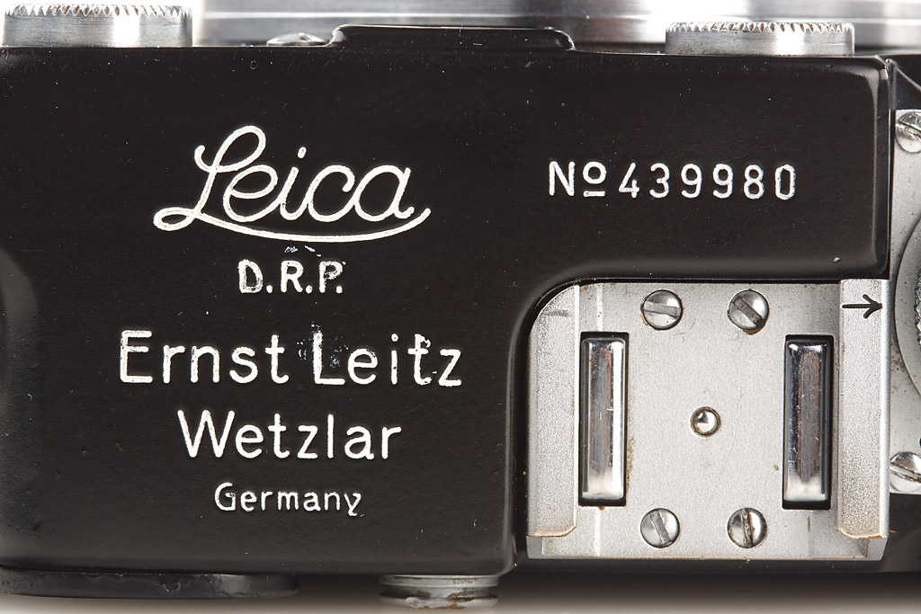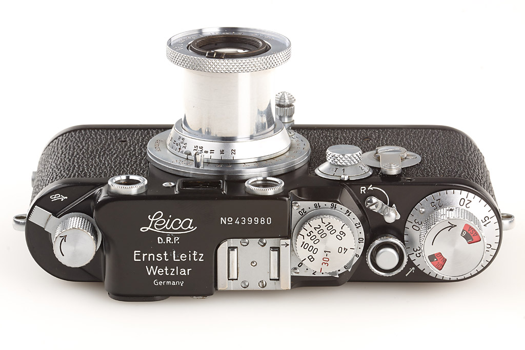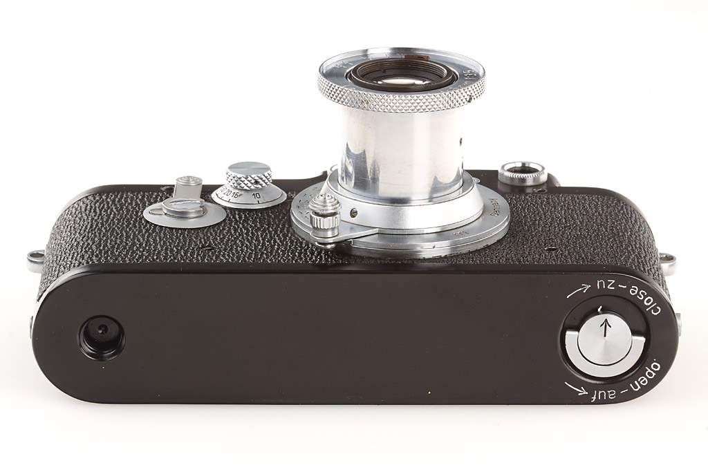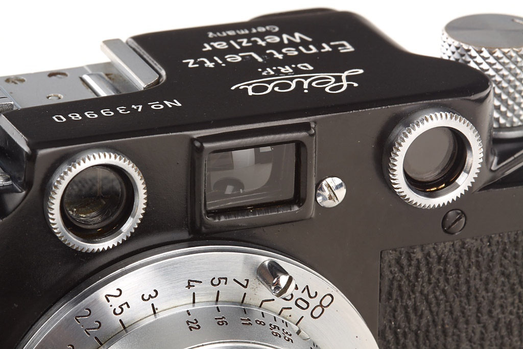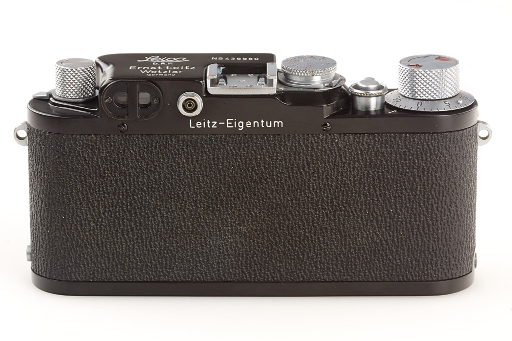 interesting black painted post-war IIIc, engraved 'Leitz-Eigentum' on rear of top plate, synchronised and restored by Leitz in early 50th, with sharkskin covering, Elmar 3.5/5cm no.770730