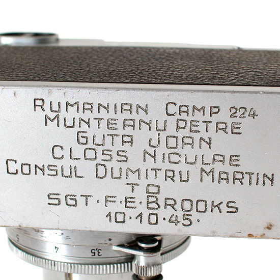 completely original IIId with red shutter, perfecttechnical condition, matching Summitar no. 522450, interesting engravings on the baseplate (see photo),the camera was delivered (code LAQOO) on 5 September 1944 to the German army (Bln. 15734)