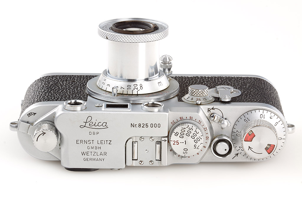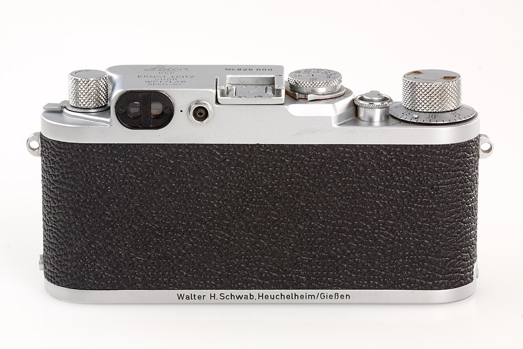 the very last IIIf (made in Wetzlar) presented to Walter H. Schwab (head of shipping department at Leitz), base plate engraved 'Walter H.Schwab, Heuchelheim/Gießen', with red scale Elmar 3.5/5cm no.1372294 (cap)