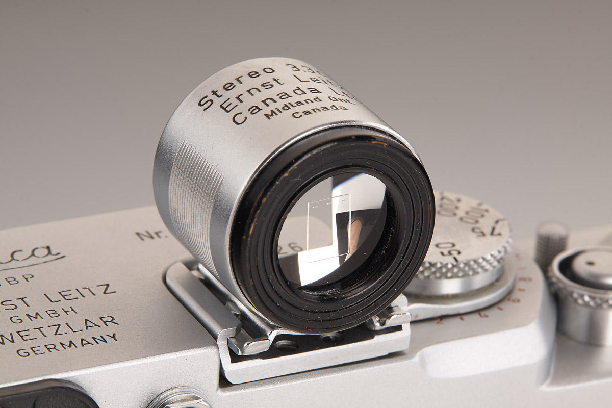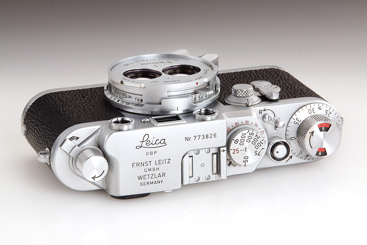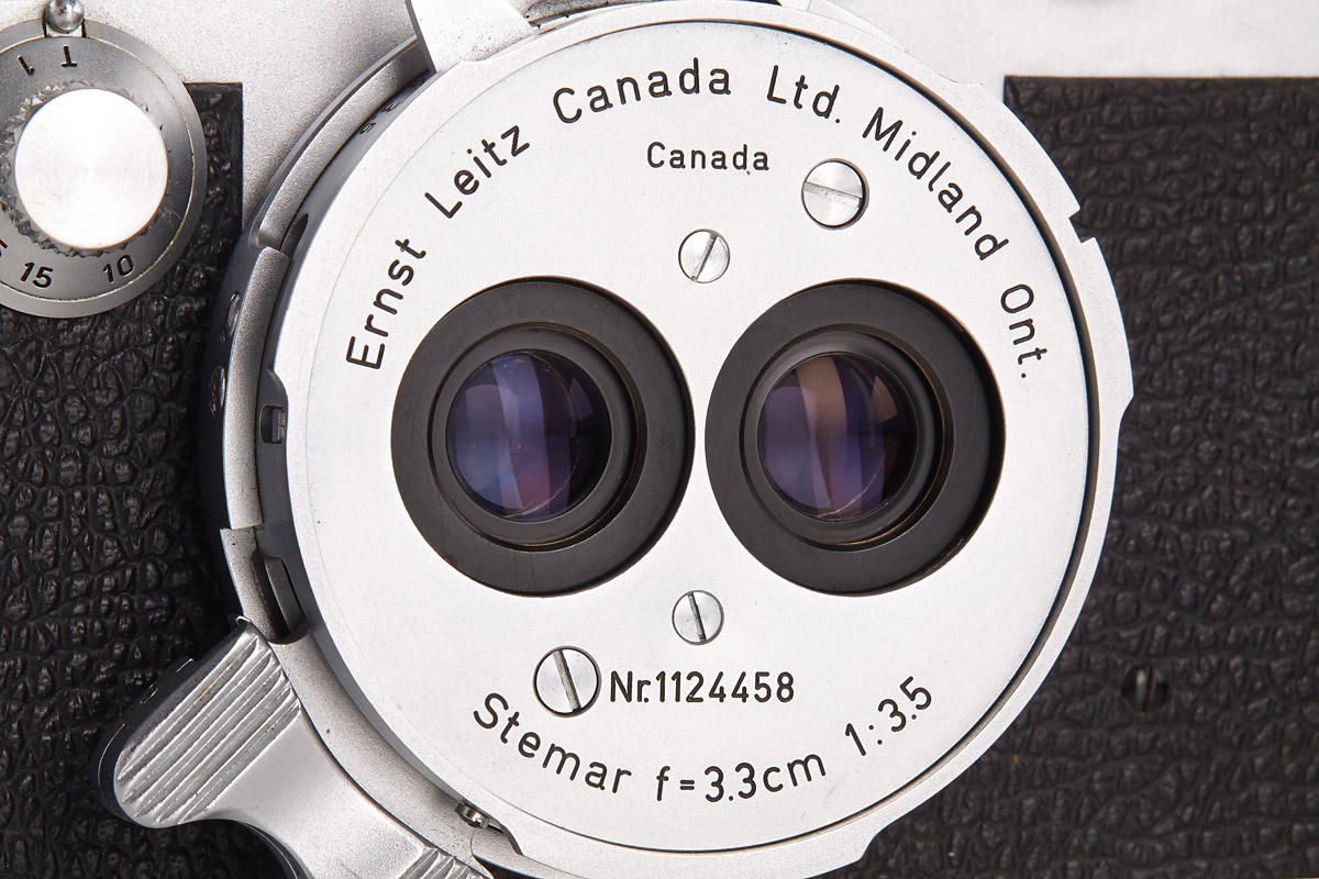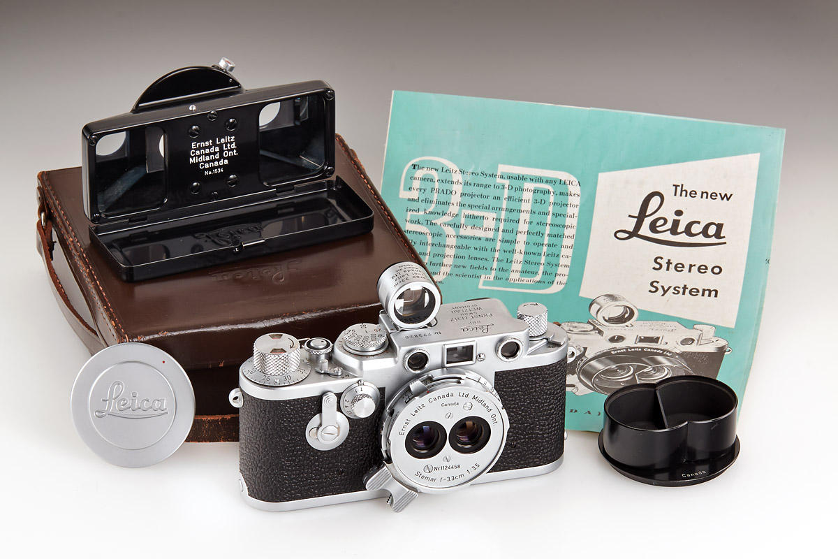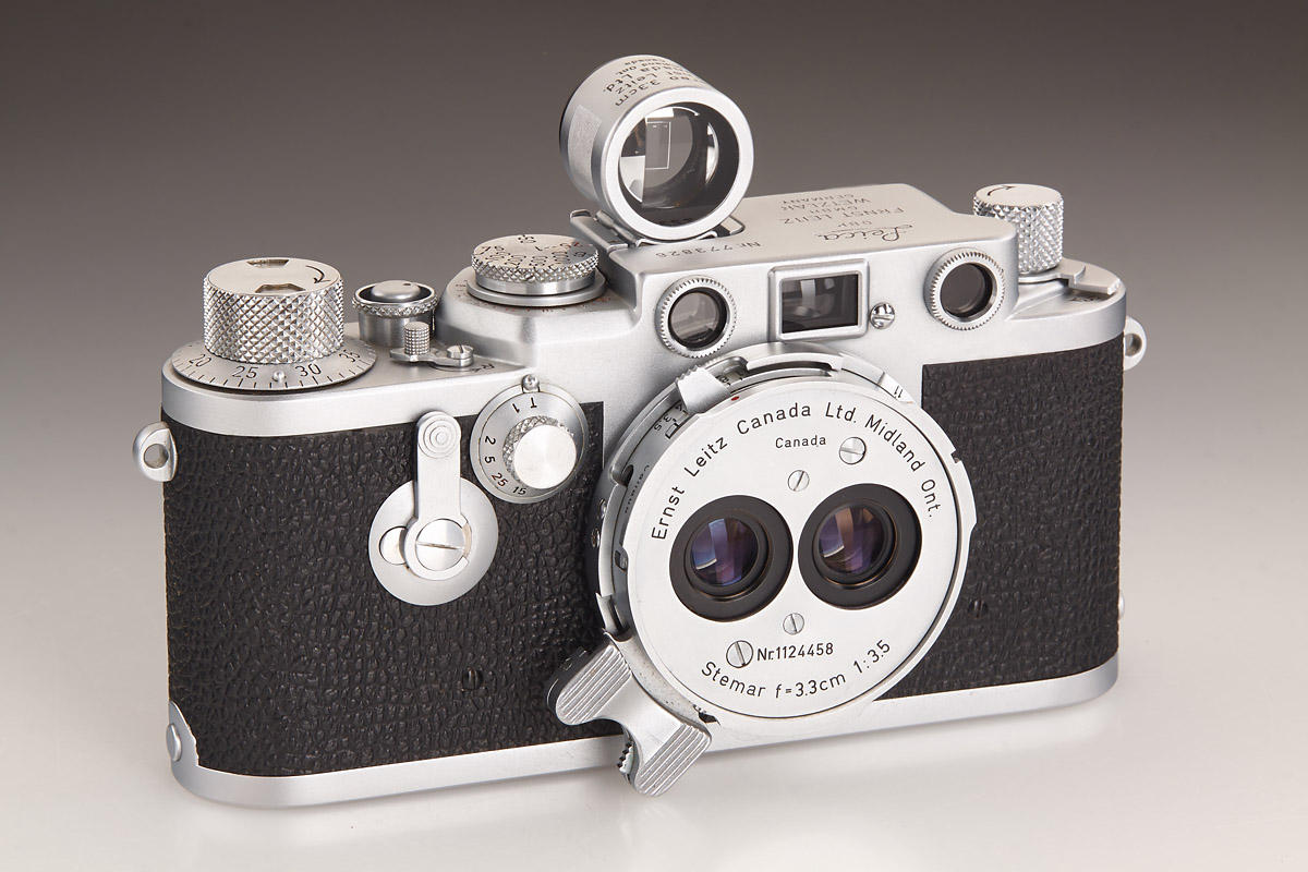 IIIf red dial with self-timer and near mint and rare stereo equipment OIRZO, Stemar lens no. 1124458, both caps, beam splitter OIMPO no. 11534, cap, finder, hood, in original leather case OIBUO, instructions. In 1953 the pre-war Stereo Elmar reappeared with a very small number of 3.5/3.3 cm Stemar lenses under the codeword OISBO, made in Wetzlar. The outfit included a stereo prism OIMPO, hood OIGEO and stereo finder OIDYO. One year later Leitz Canada, Midland started the production of the Stemar outfit to meet the renewed interest in stereo photography in the United States. It was available in both screw-mount and bayonet-mount versions. The Stemar, Leitz’s finest contribution to stereo photography, is a wonderful technical achievement, but it failed to attract a great mass of customers. Between 1954 and 1957 only about 500 units left the factory in Canada. Bei Leitz in Wetzlar erschien 1953 das Vorkriegs-Stereo Elmar wieder in einer sehr kleinen Anzahl von 3,5/3,3 cm Stemar Objektiven mit dem Kennwort OISBO. Die Ausrüstung bestand aus dem Stereo Prisma OIMPO, Sonnenblende OIGEO und Stereosucher OIDYO. Nur ein Jahr später begann Leitz Canada, Midland die Produktion der Stemar Ausrüstung, um dem steigenden Interesse an Stereo Fotografie in den USA Rechnung zu tragen. Das Objektiv war sowohl in Schraub- wie auch in M-Fassung erhältlich. Das Stemar, der wichtigster Beitrag von Leitz zur Stereo Fotografie, ist eine großartige technische Leistung, aber wurde kein großer Erfolg bei den Kunden. Zwischen 1954 und 1957 wurden nur etwa 500 Einheiten in Kanada gefertigt.