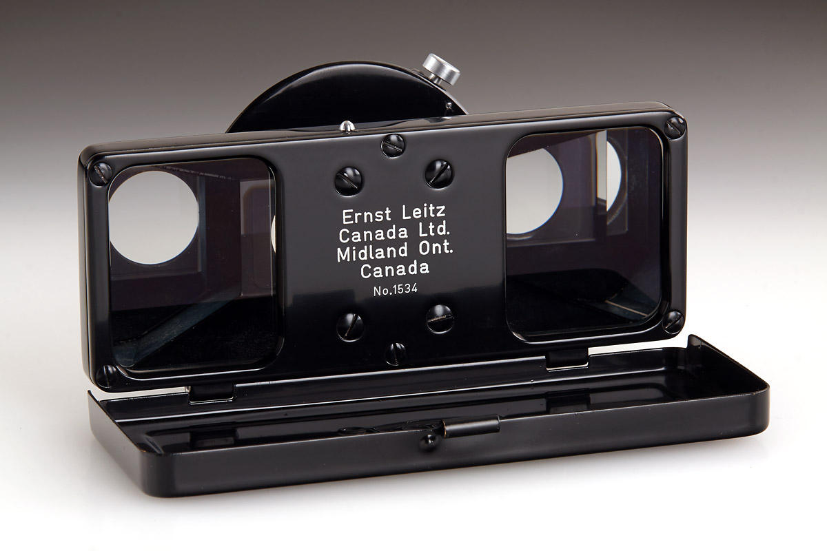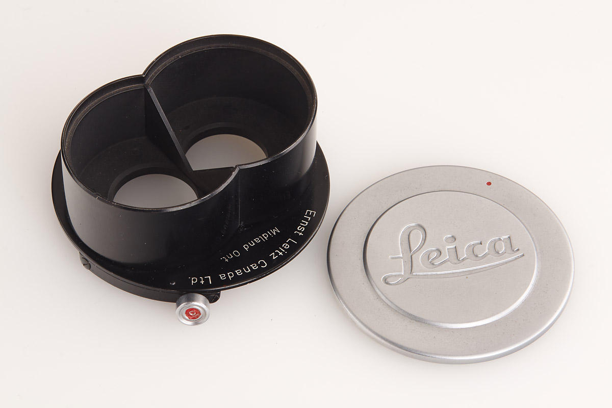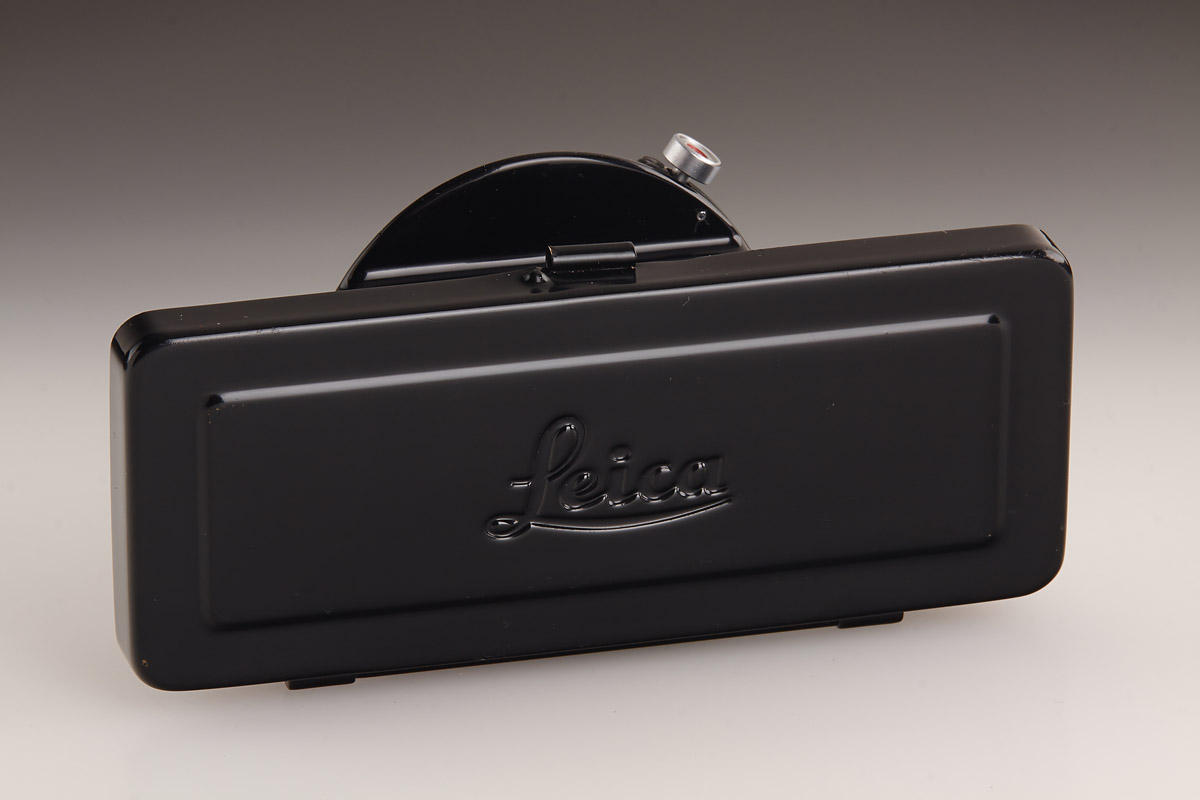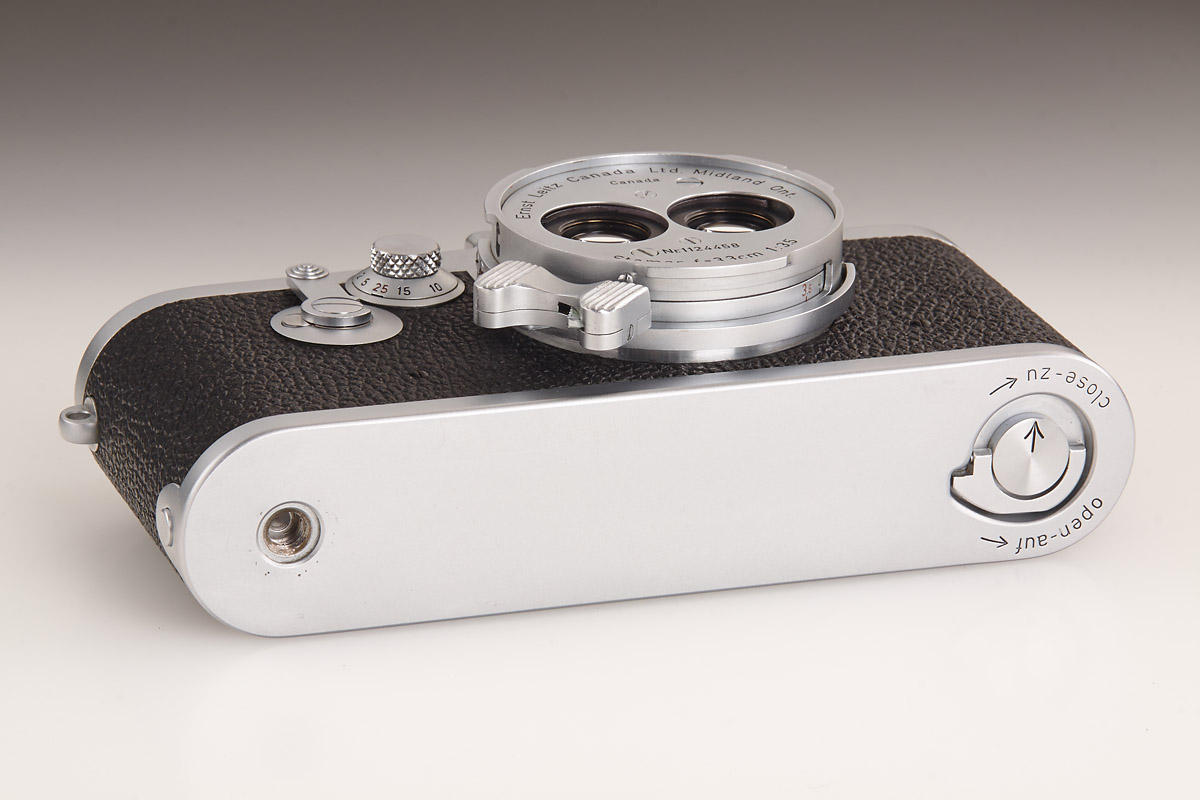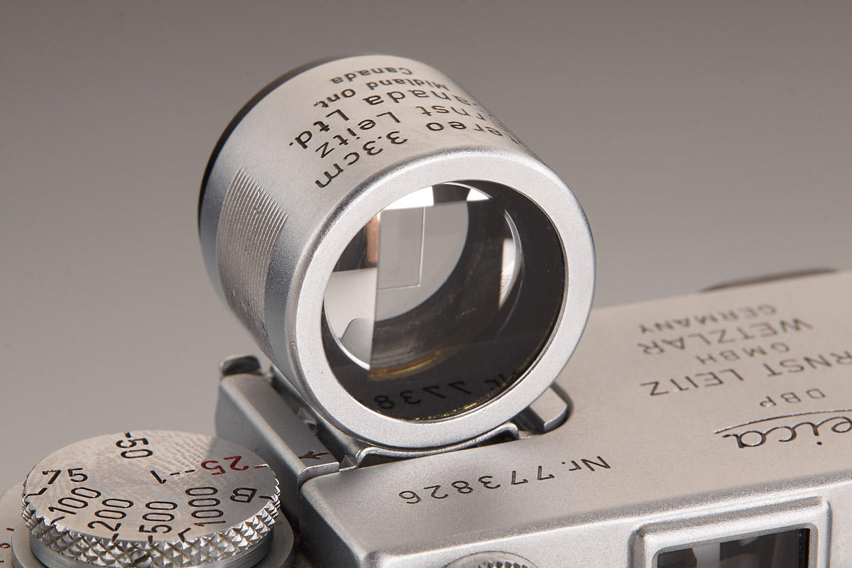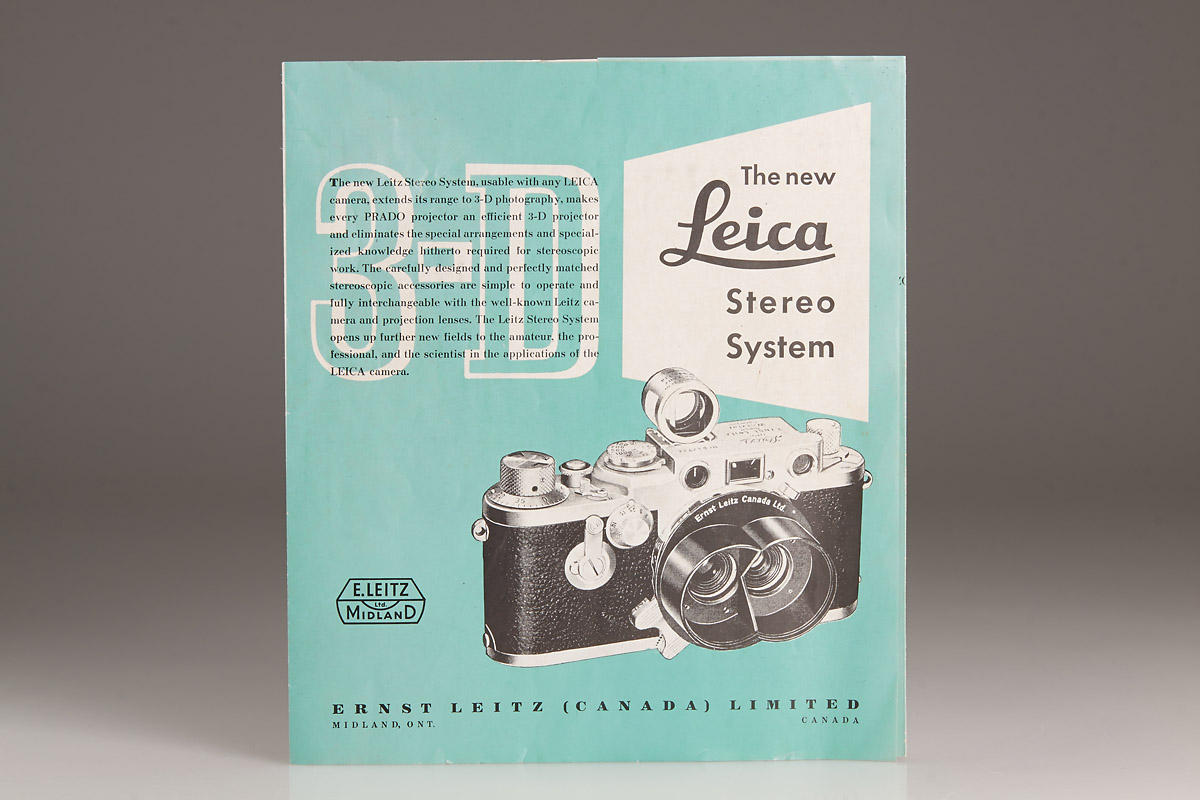 IIIf red dial with self-timer and near mint and rare stereo equipment OIRZO, Stemar lens no. 1124458, both caps, beam splitter OIMPO no. 11534, cap, finder, hood, in original leather case OIBUO, instructions. In 1953 the pre-war Stereo Elmar reappeared with a very small number of 3.5/3.3 cm Stemar lenses under the codeword OISBO, made in Wetzlar. The outfit included a stereo prism OIMPO, hood OIGEO and stereo finder OIDYO. One year later Leitz Canada, Midland started the production of the Stemar outfit to meet the renewed interest in stereo photography in the United States. It was available in both screw-mount and bayonet-mount versions. The Stemar, Leitz’s finest contribution to stereo photography, is a wonderful technical achievement, but it failed to attract a great mass of customers. Between 1954 and 1957 only about 500 units left the factory in Canada. Bei Leitz in Wetzlar erschien 1953 das Vorkriegs-Stereo Elmar wieder in einer sehr kleinen Anzahl von 3,5/3,3 cm Stemar Objektiven mit dem Kennwort OISBO. Die Ausrüstung bestand aus dem Stereo Prisma OIMPO, Sonnenblende OIGEO und Stereosucher OIDYO. Nur ein Jahr später begann Leitz Canada, Midland die Produktion der Stemar Ausrüstung, um dem steigenden Interesse an Stereo Fotografie in den USA Rechnung zu tragen. Das Objektiv war sowohl in Schraub- wie auch in M-Fassung erhältlich. Das Stemar, der wichtigster Beitrag von Leitz zur Stereo Fotografie, ist eine großartige technische Leistung, aber wurde kein großer Erfolg bei den Kunden. Zwischen 1954 und 1957 wurden nur etwa 500 Einheiten in Kanada gefertigt.