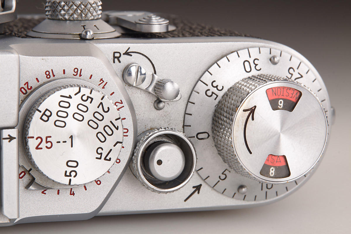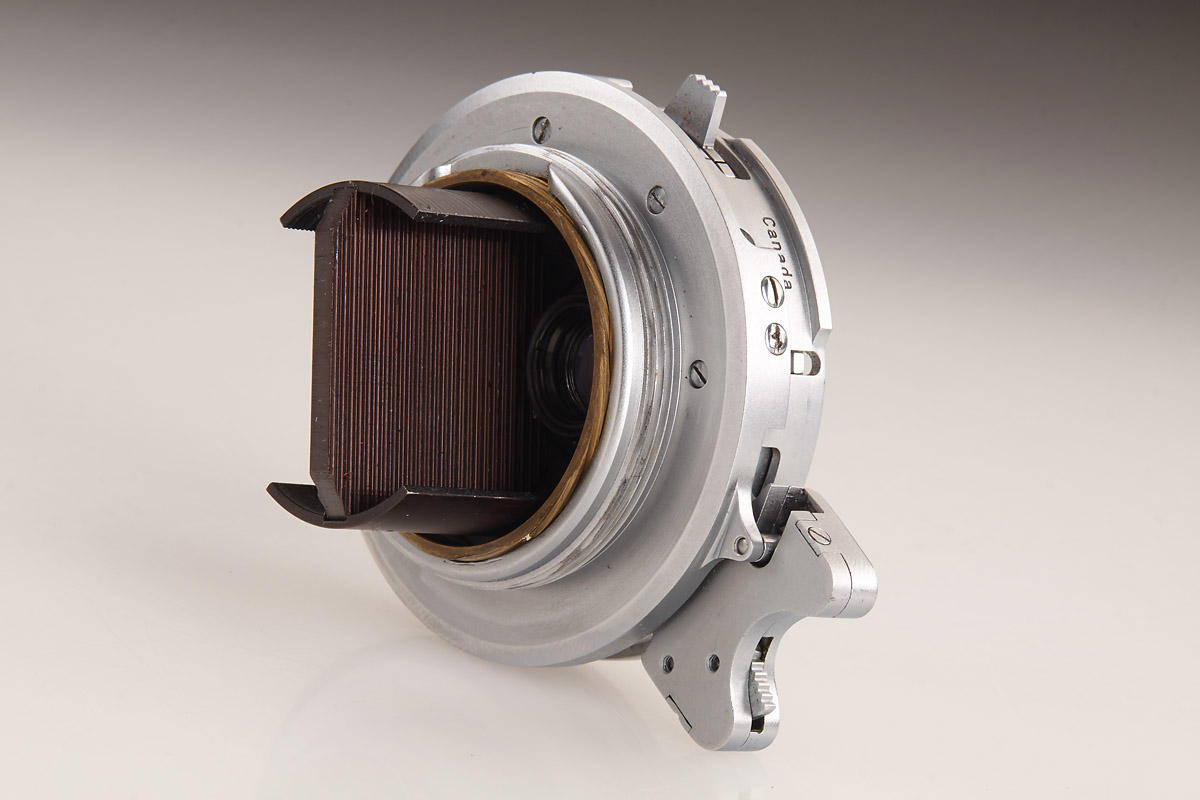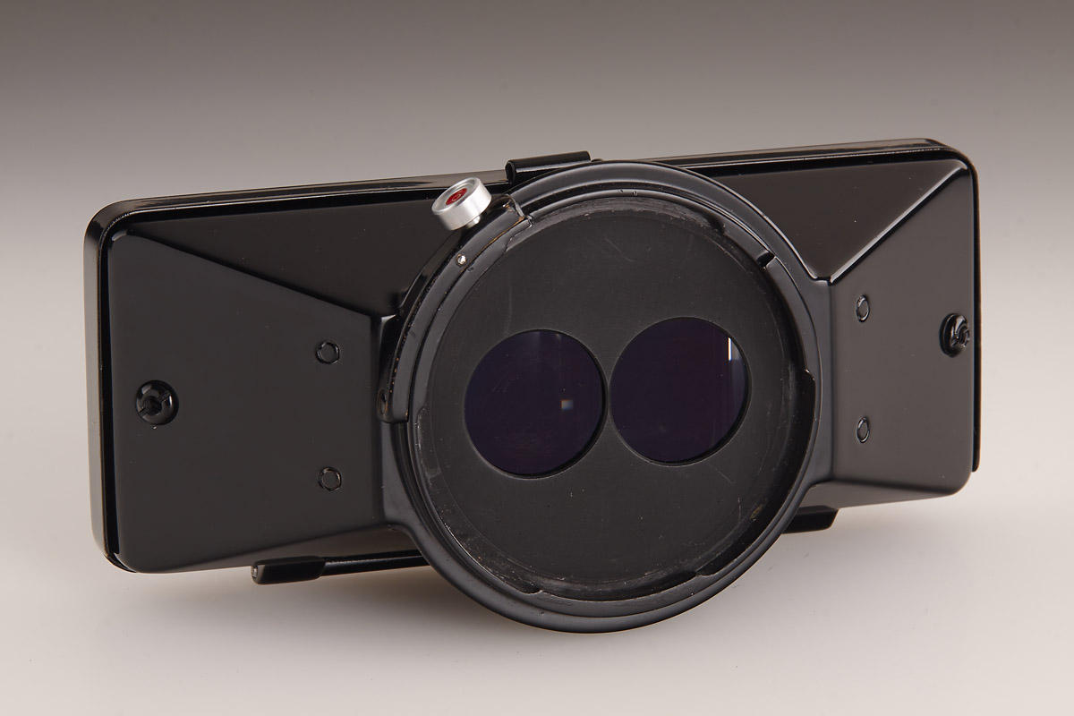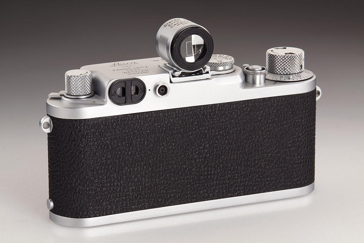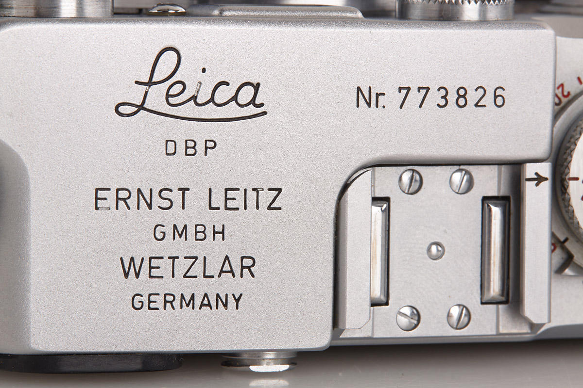 IIIf red dial with self-timer and near mint and rare stereo equipment OIRZO, Stemar lens no. 1124458, both caps, beam splitter OIMPO no. 11534, cap, finder, hood, in original leather case OIBUO, instructions. In 1953 the pre-war Stereo Elmar reappeared with a very small number of 3.5/3.3 cm Stemar lenses under the codeword OISBO, made in Wetzlar. The outfit included a stereo prism OIMPO, hood OIGEO and stereo finder OIDYO. One year later Leitz Canada, Midland started the production of the Stemar outfit to meet the renewed interest in stereo photography in the United States. It was available in both screw-mount and bayonet-mount versions. The Stemar, Leitz’s finest contribution to stereo photography, is a wonderful technical achievement, but it failed to attract a great mass of customers. Between 1954 and 1957 only about 500 units left the factory in Canada. Bei Leitz in Wetzlar erschien 1953 das Vorkriegs-Stereo Elmar wieder in einer sehr kleinen Anzahl von 3,5/3,3 cm Stemar Objektiven mit dem Kennwort OISBO. Die Ausrüstung bestand aus dem Stereo Prisma OIMPO, Sonnenblende OIGEO und Stereosucher OIDYO. Nur ein Jahr später begann Leitz Canada, Midland die Produktion der Stemar Ausrüstung, um dem steigenden Interesse an Stereo Fotografie in den USA Rechnung zu tragen. Das Objektiv war sowohl in Schraub- wie auch in M-Fassung erhältlich. Das Stemar, der wichtigster Beitrag von Leitz zur Stereo Fotografie, ist eine großartige technische Leistung, aber wurde kein großer Erfolg bei den Kunden. Zwischen 1954 und 1957 wurden nur etwa 500 Einheiten in Kanada gefertigt.