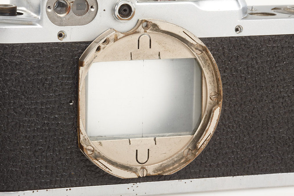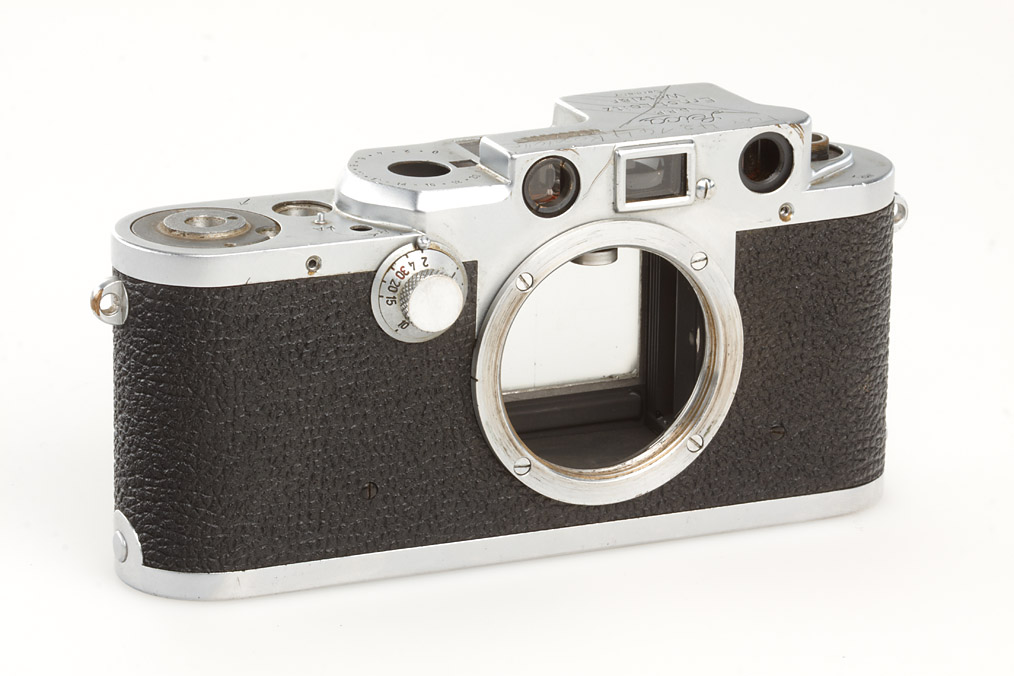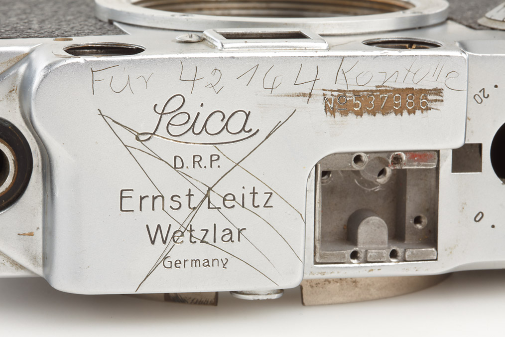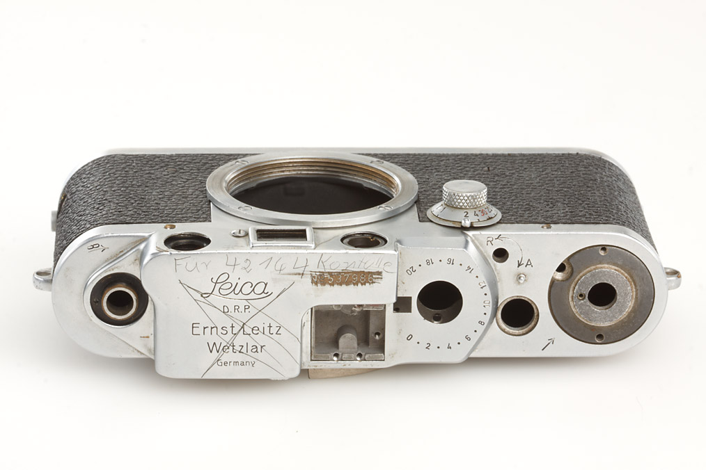 test camera for internal use, focusing screen with adapter for magnifier built in back, hand engraved on top: Für 42164 Kontrolle (for 42164 control), rangefinder working, probably to adjust lenses