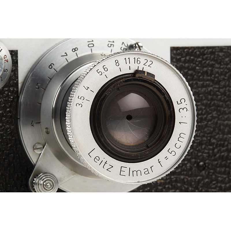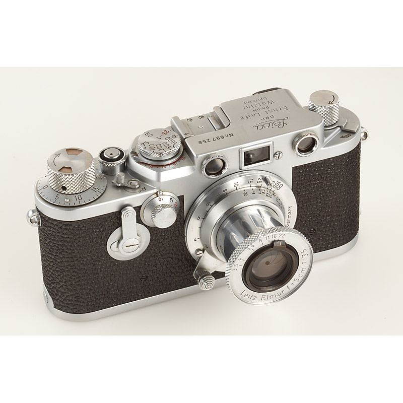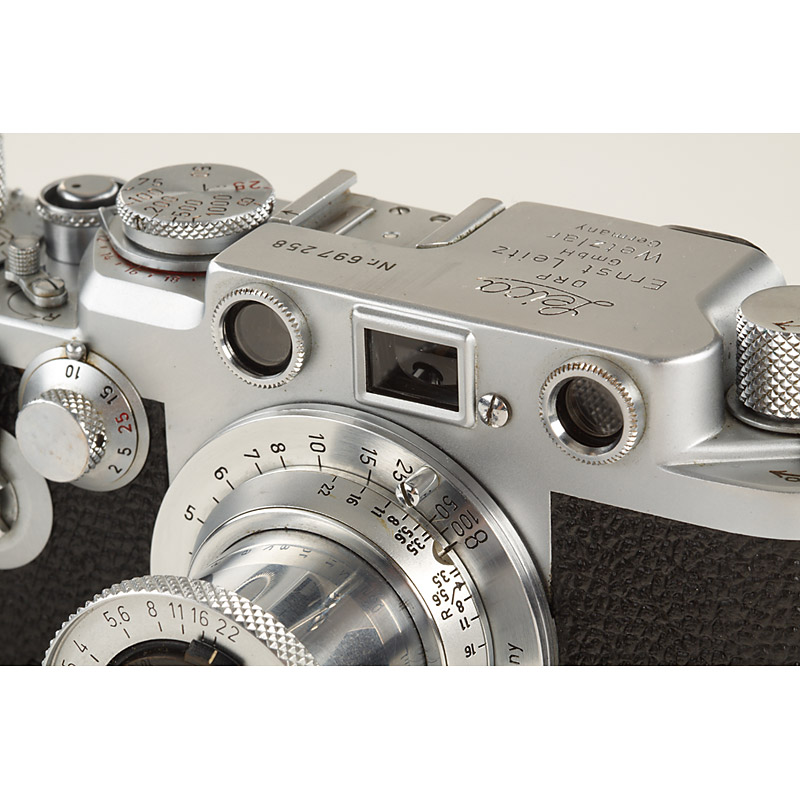 body (red dial) with selftimer and four matching lenses: Elmar 3.5/5cm no.1014505, A36 Summaron 3.5/3.5cm no.1108937 (cap, keeper), Elmar 4/9cm no.1080863 (cap, keeper), Telyt 4.5/20cm no.1366617 (scratches on rear element, filter, hood), 14023A extension tube, SFTOO 20cm finder, VIOOH universal finder no.58975 with straight sides, WINTU right angle finder, Synchroblitzer, Visoflex I with 45° prism finder and bellows I