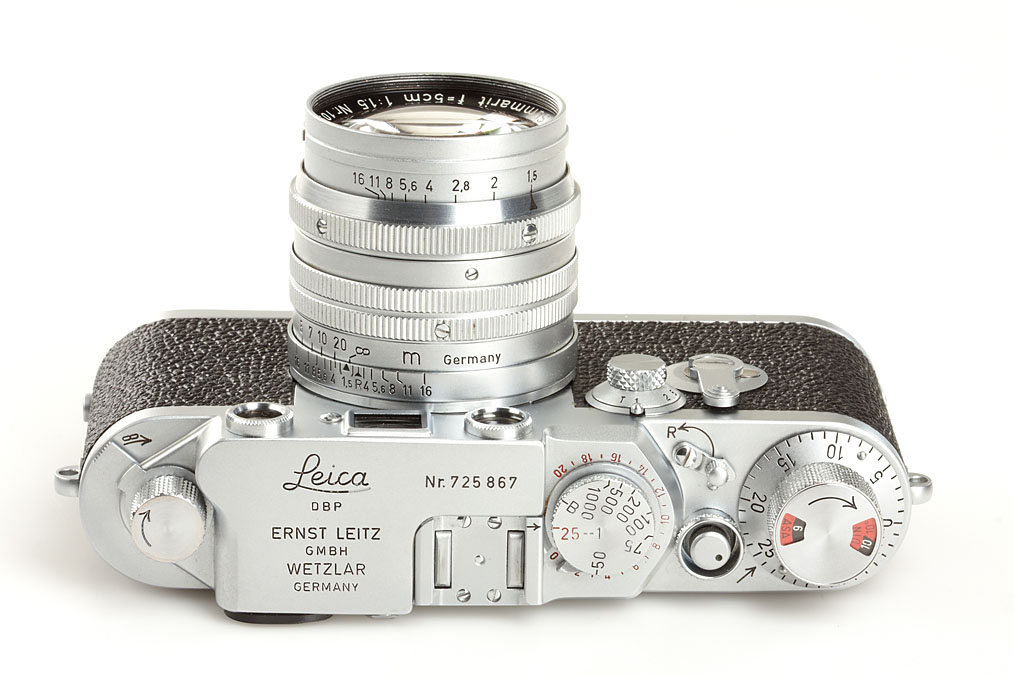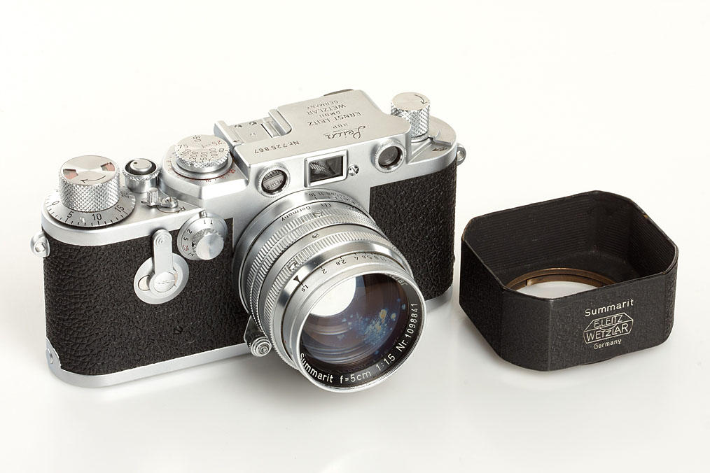 red dial body with self-timer in good working order with matching Summarit 1.5/5cm no.1098841 (hazy, meter scale), XOONS hood (some repaint) - all Germany engraved