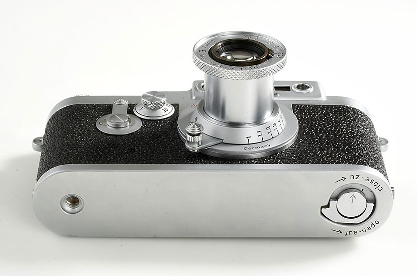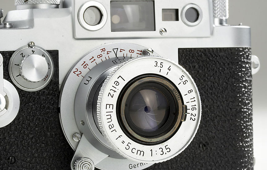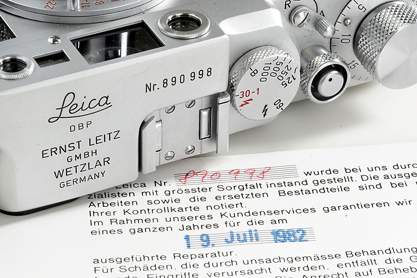 like new body in overhauled condition, mint red scale Elmar 3.5/5cm no.1321305, cap, Leitz guarantee card from 1982