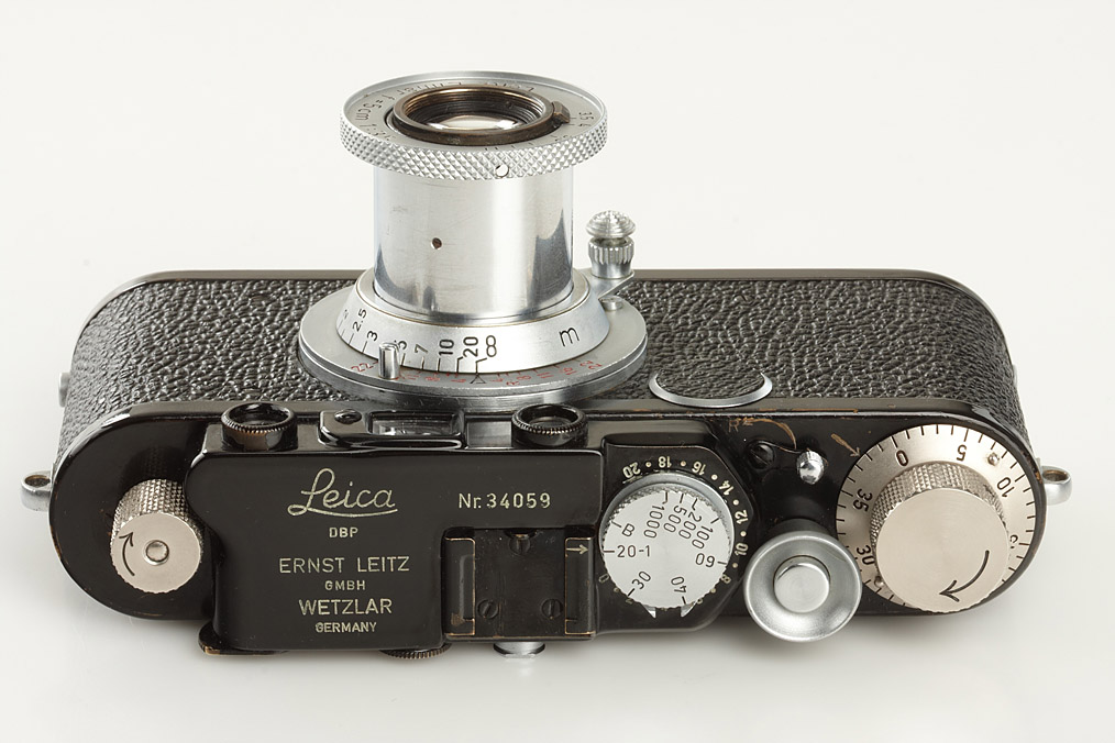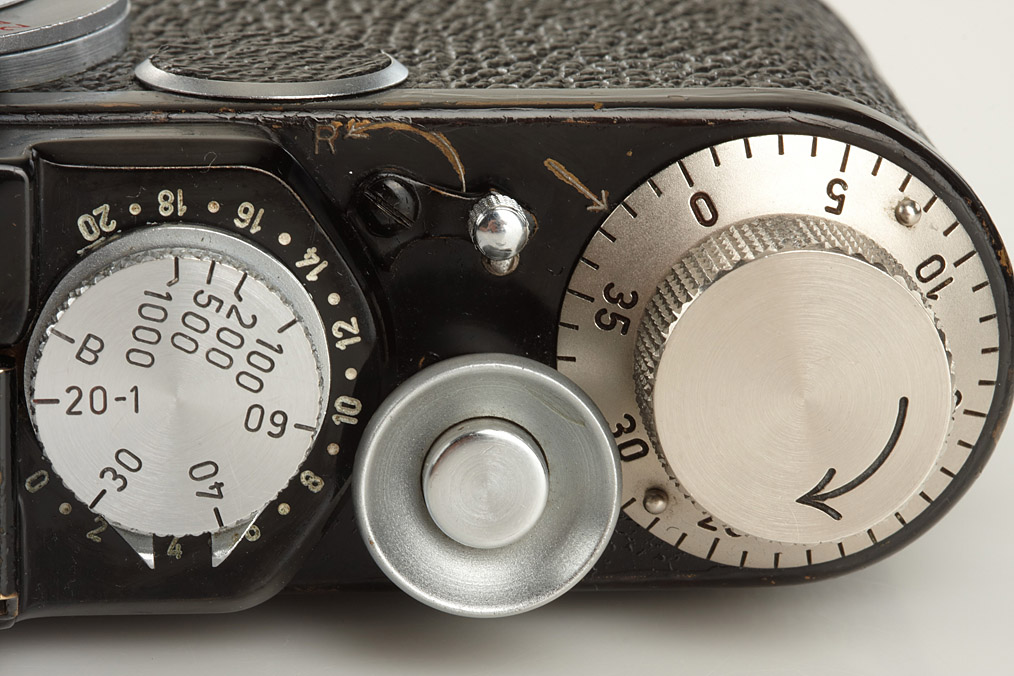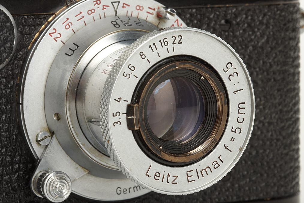 uncommon conversion of I Mod.A Elmar into IIf, nickel and chrome knobs, red scale Elmar 3.5/5cm no.1320936, black/chrome FIKUS hood