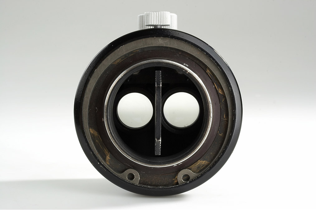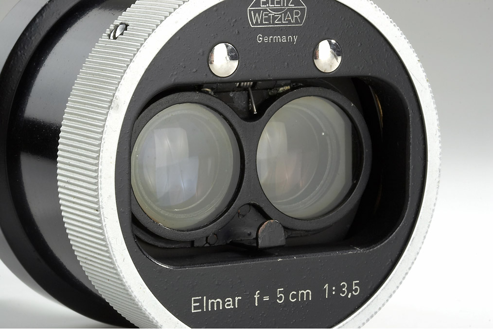 prototype stereo projection lens made by E.Leitz Wetzlar with twin 3.5/5cm Elmar lenses, attached Polaroid filter, with original deep M39 rear cap