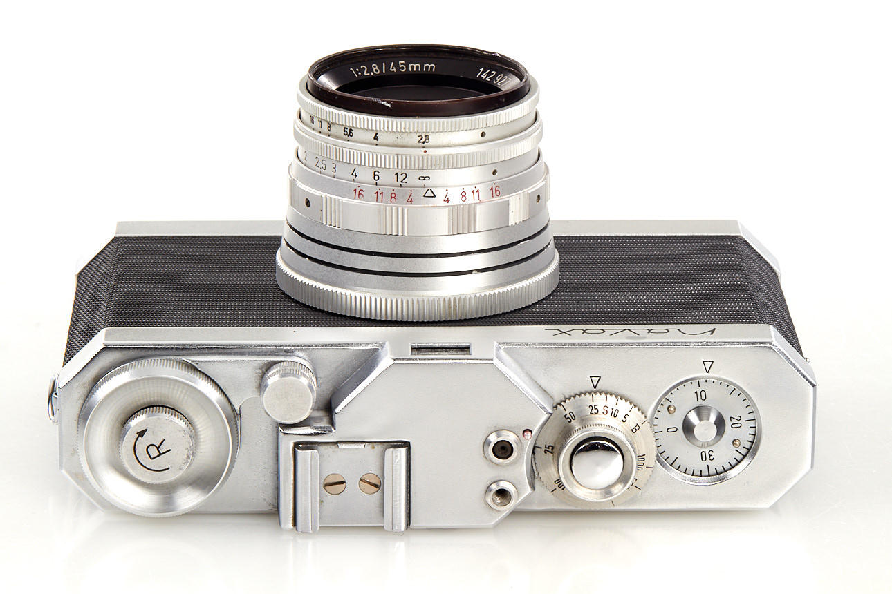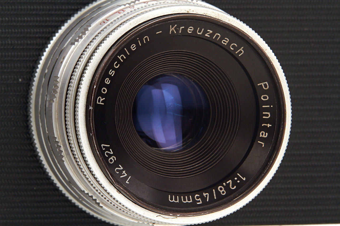 very rare German 35mm viewfinder camera, vertically moving focal plane shutter, with matching Pointar 2.8/45mm no.142927 (cap) in special M39 mount, camera and lens in excellent condition