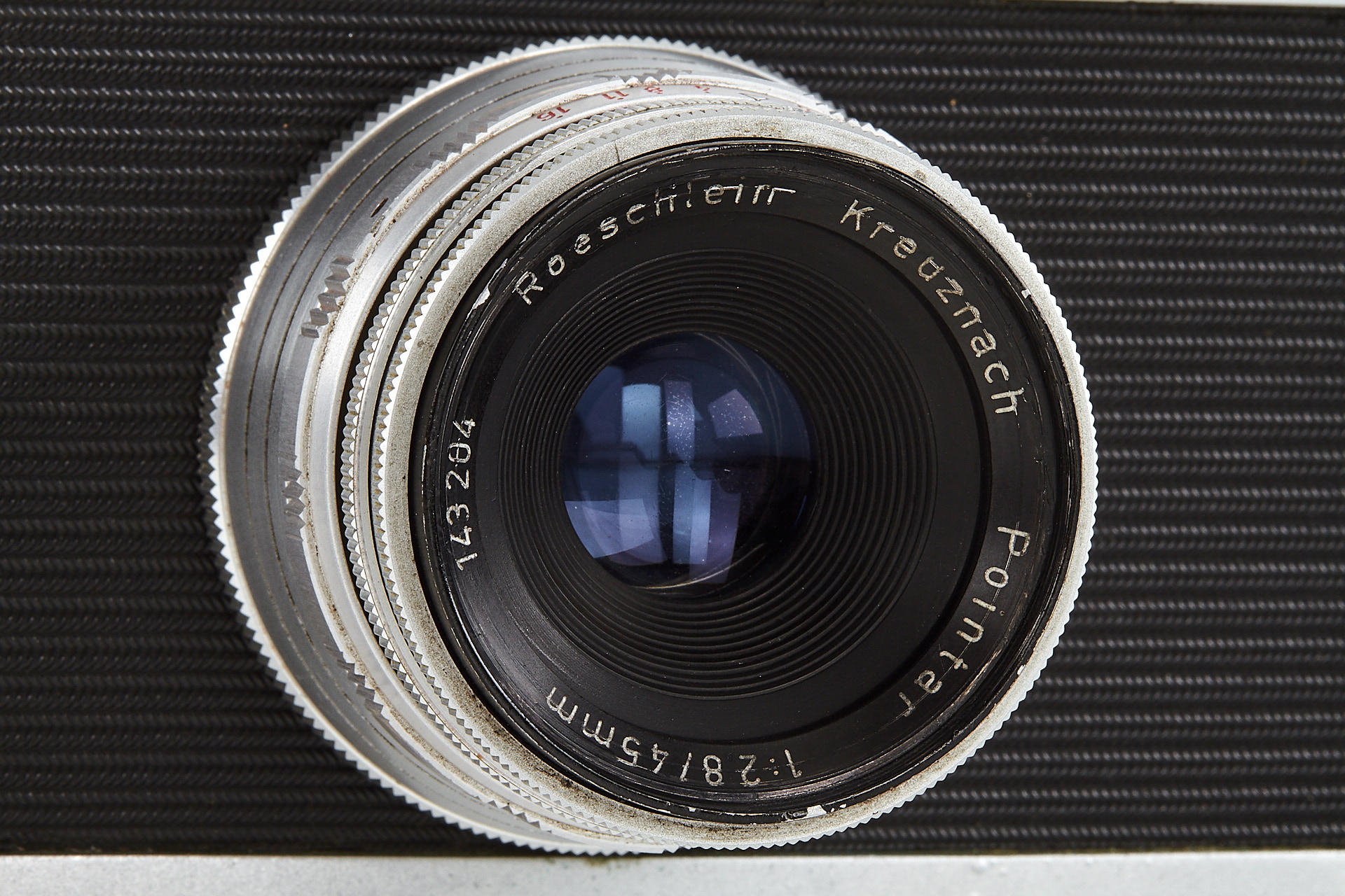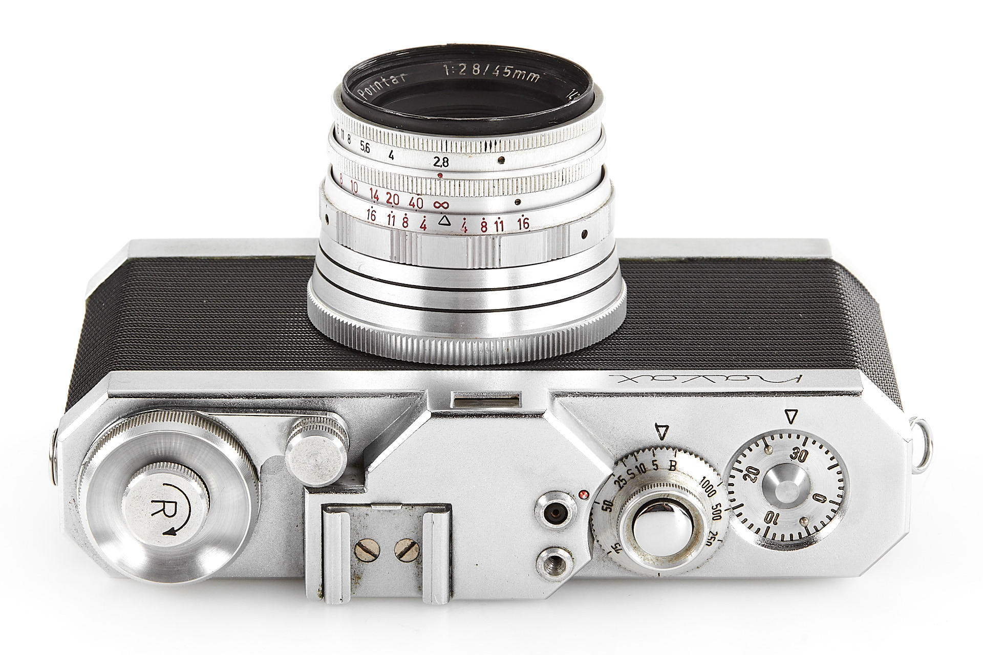 very rare German 35mm viewfinder camera in excellent condition, vertically moving focal plane shutter, with matching Pointar 2.8/45mm no.143204 in special M39 mount (cond. B), leather case