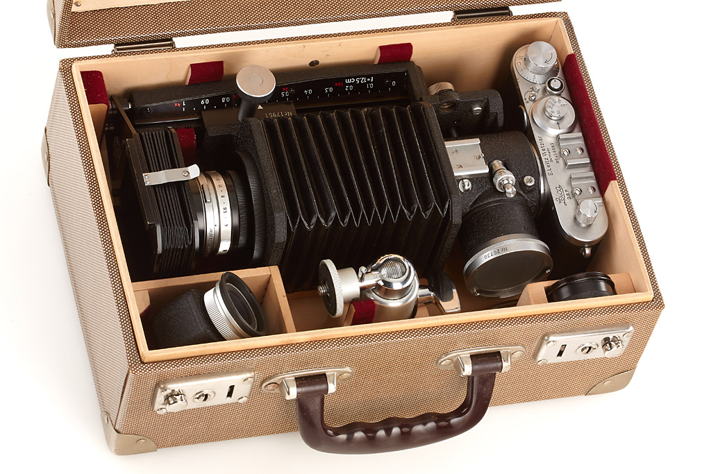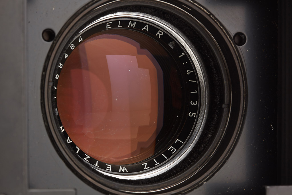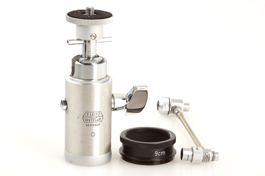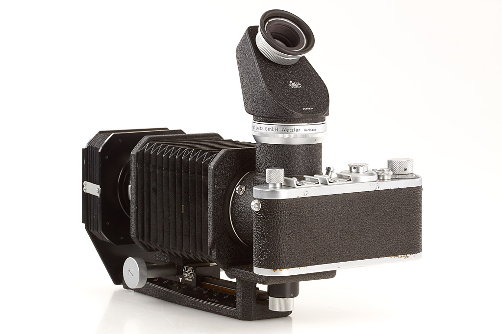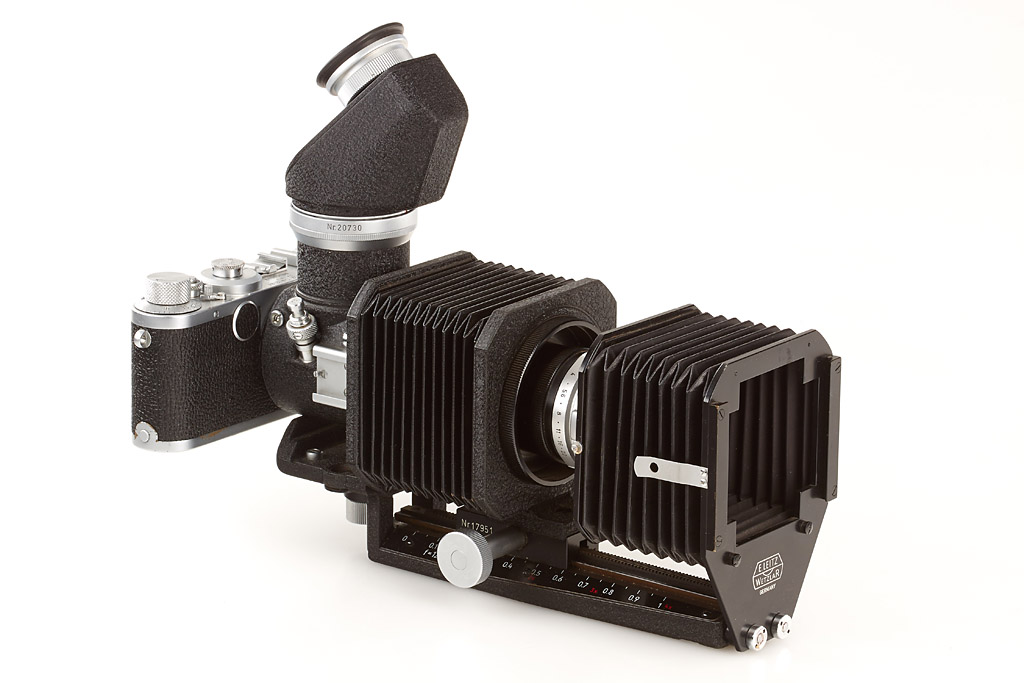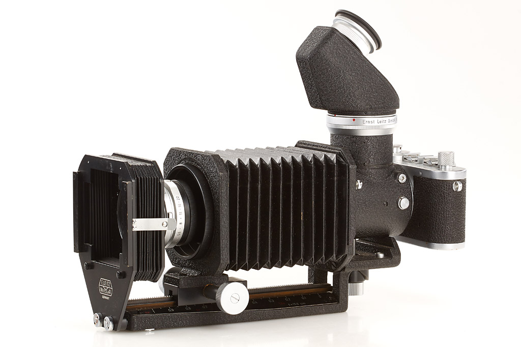 clean macro outfit including body in good working order (cond. B+), Visfolex I with PEGOO prism, Bellows I, Elmar 4/135mm lens head no.1768484, extension tube, KGOON ball head, cable release, all in fitted outfit case UYOOQ
