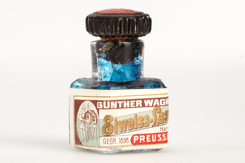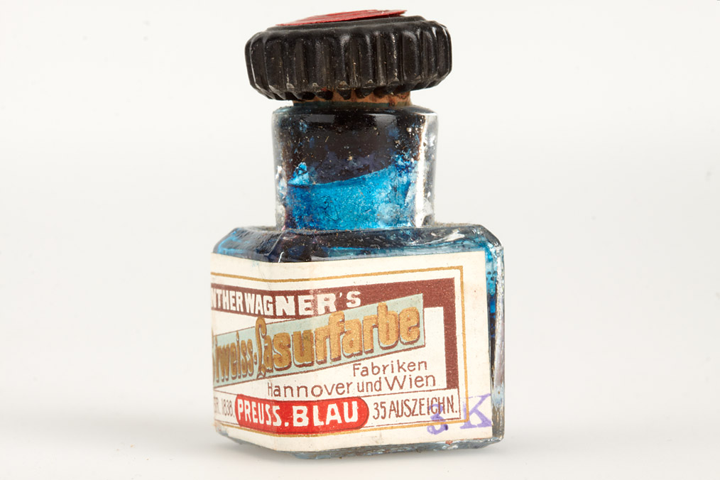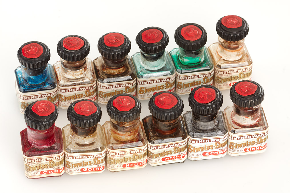 early set with 12 glass bottles, 3 pencils and instruction book in maker's box