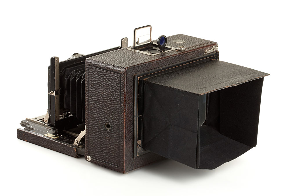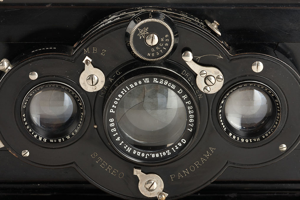 10x15cm, rare three-lens version stereo camera in good original condition, with Protarlinse VII 29cm no.141286 and 2x Tessar IIb 12cm nos.155131&155132 in Compound shutter, focusing screen adapter