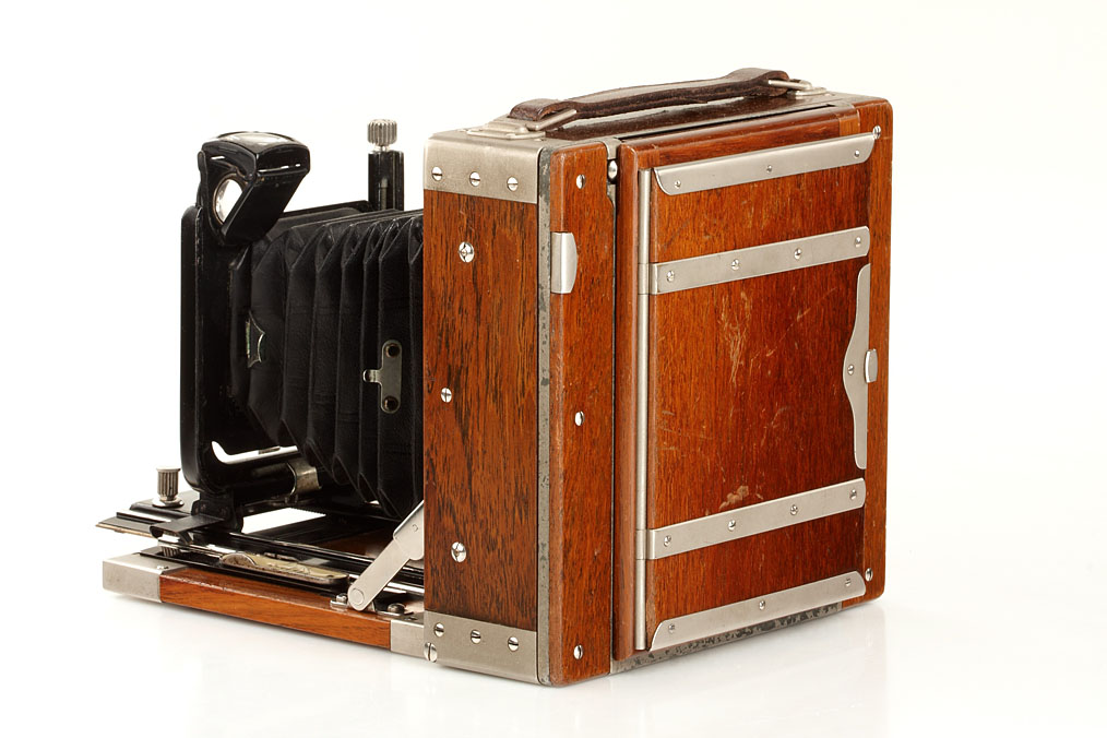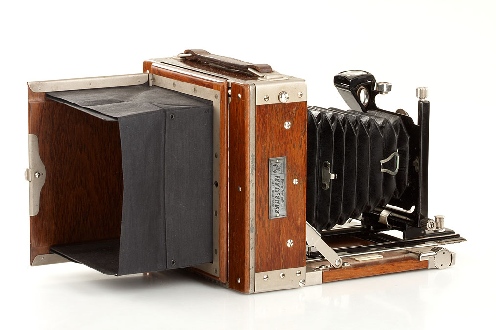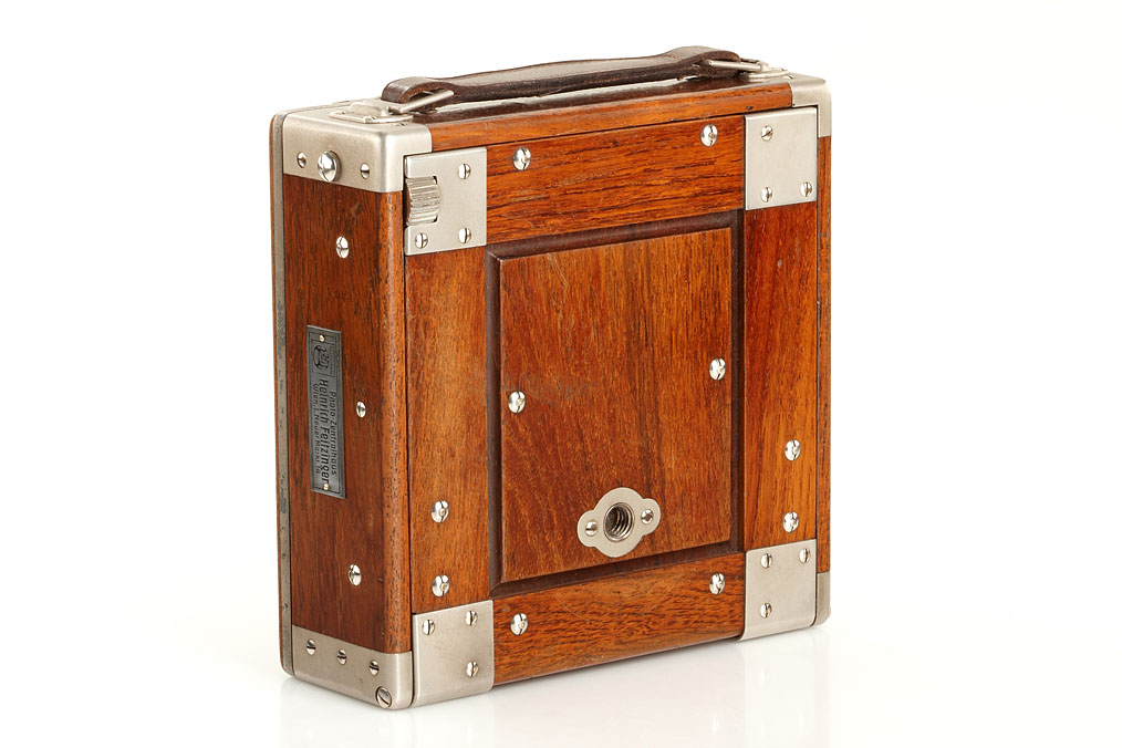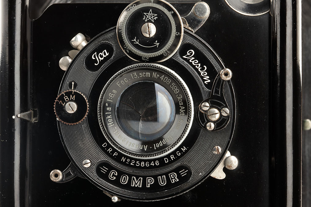 rare 9x12cm folding bed camera with nickel fittings, black leather bellows, in good original condition with Doppel-Anastigmat "Hekla" 6.8/13.5cm no.408599 in Compur shutter, a plaque on the side mounted, written: Photo-Zentralhaus Heinrich Feitzinger Wien, I. Neuer Markt 14, filmpack holder, 2 plateholders