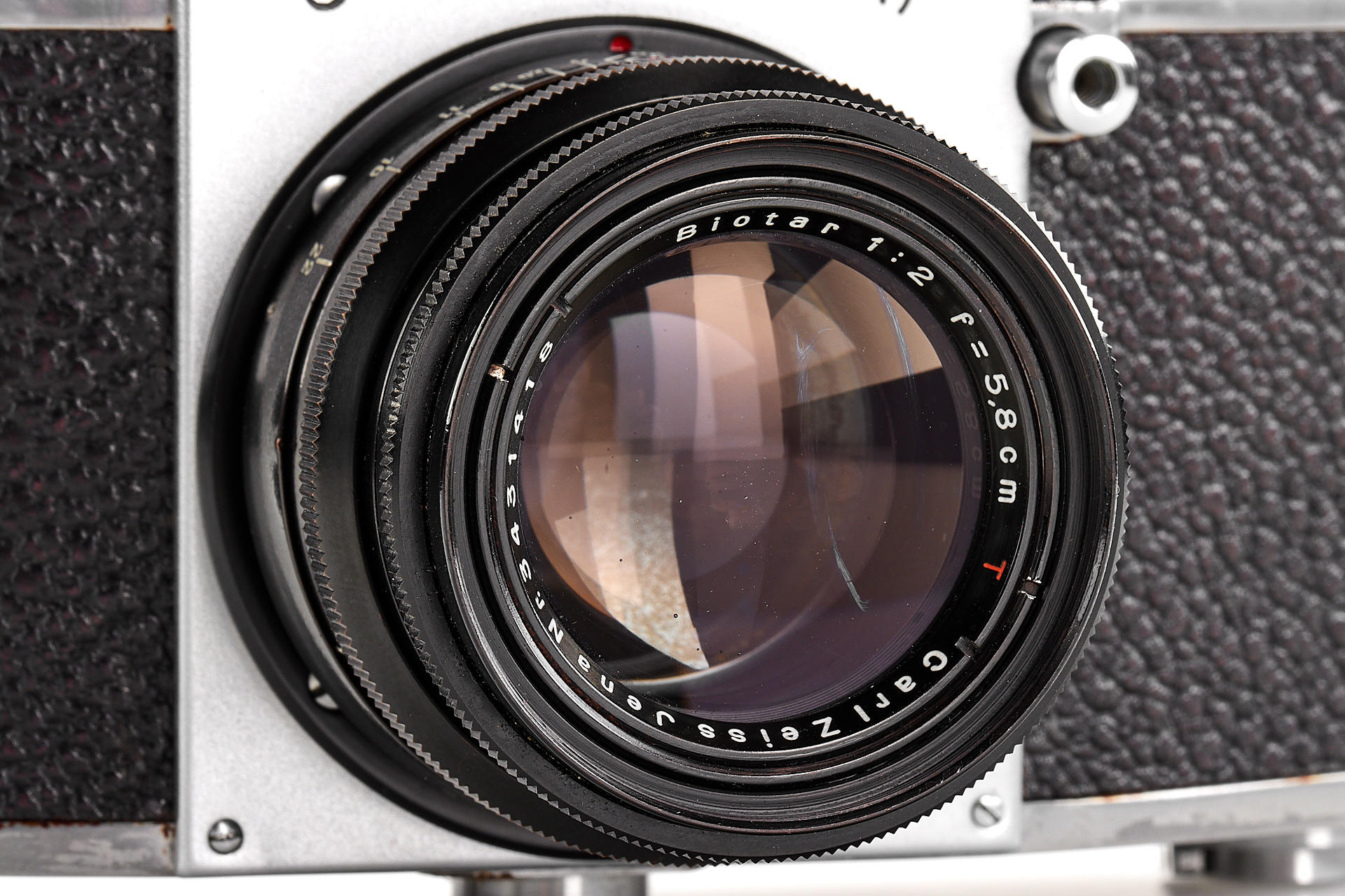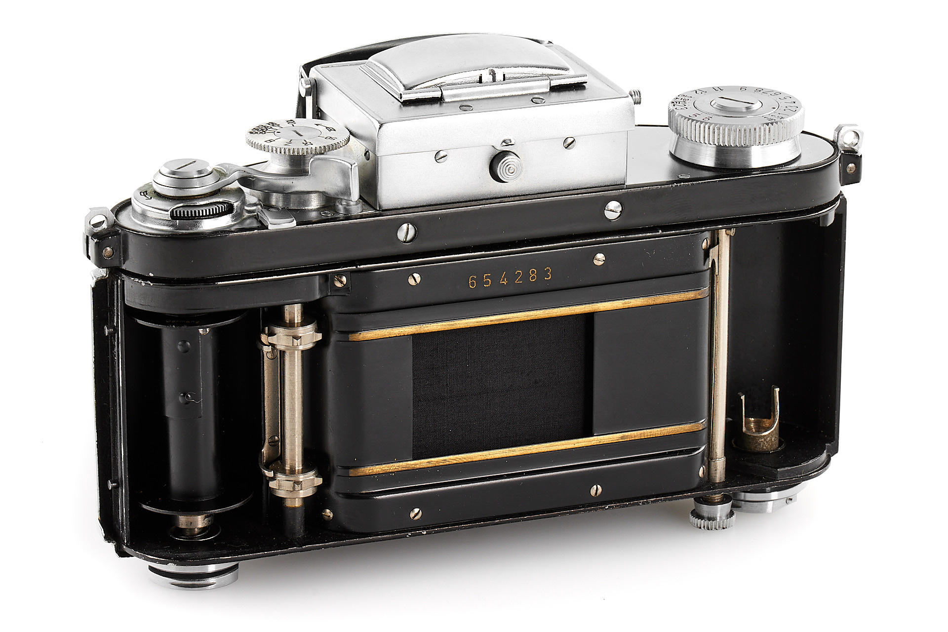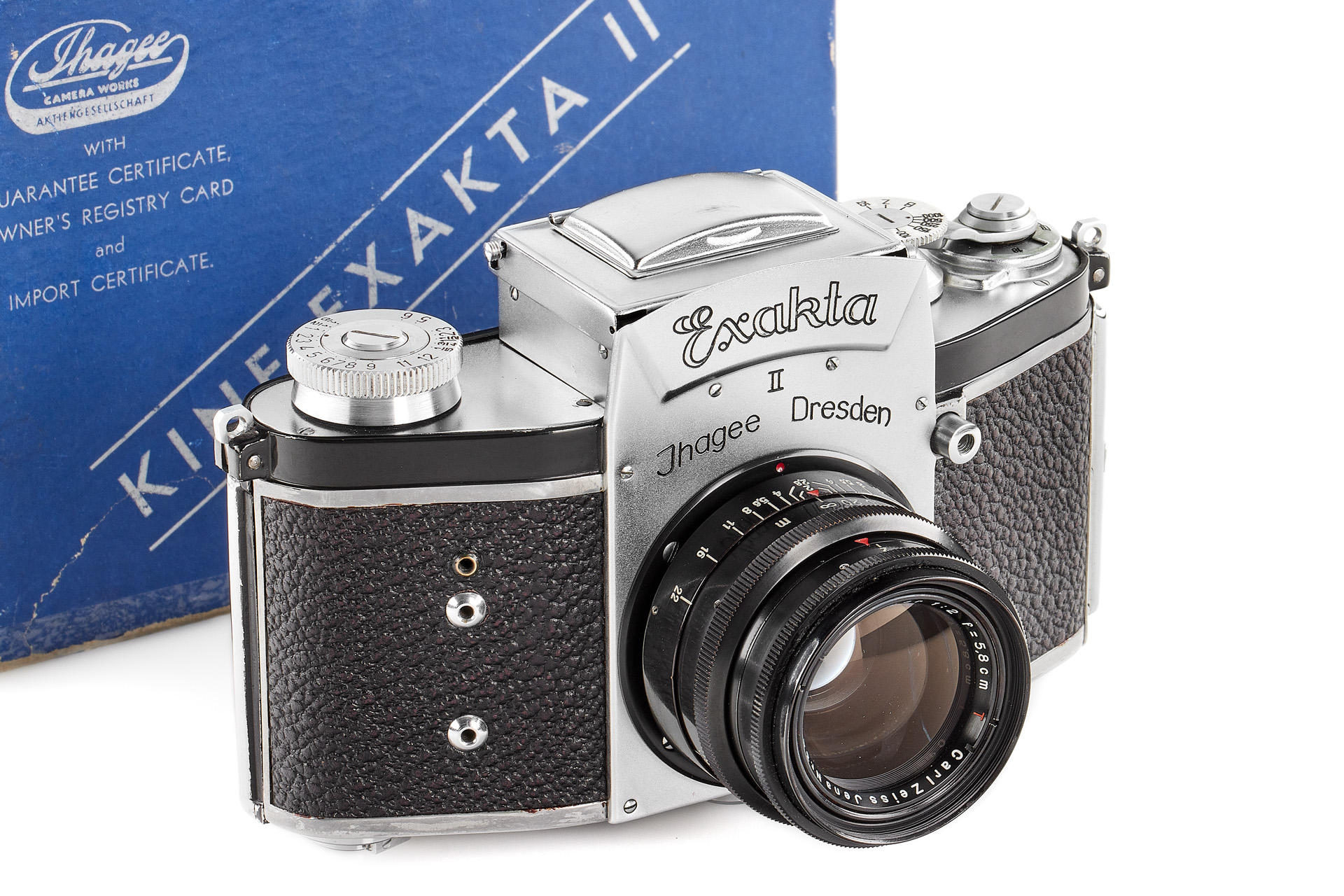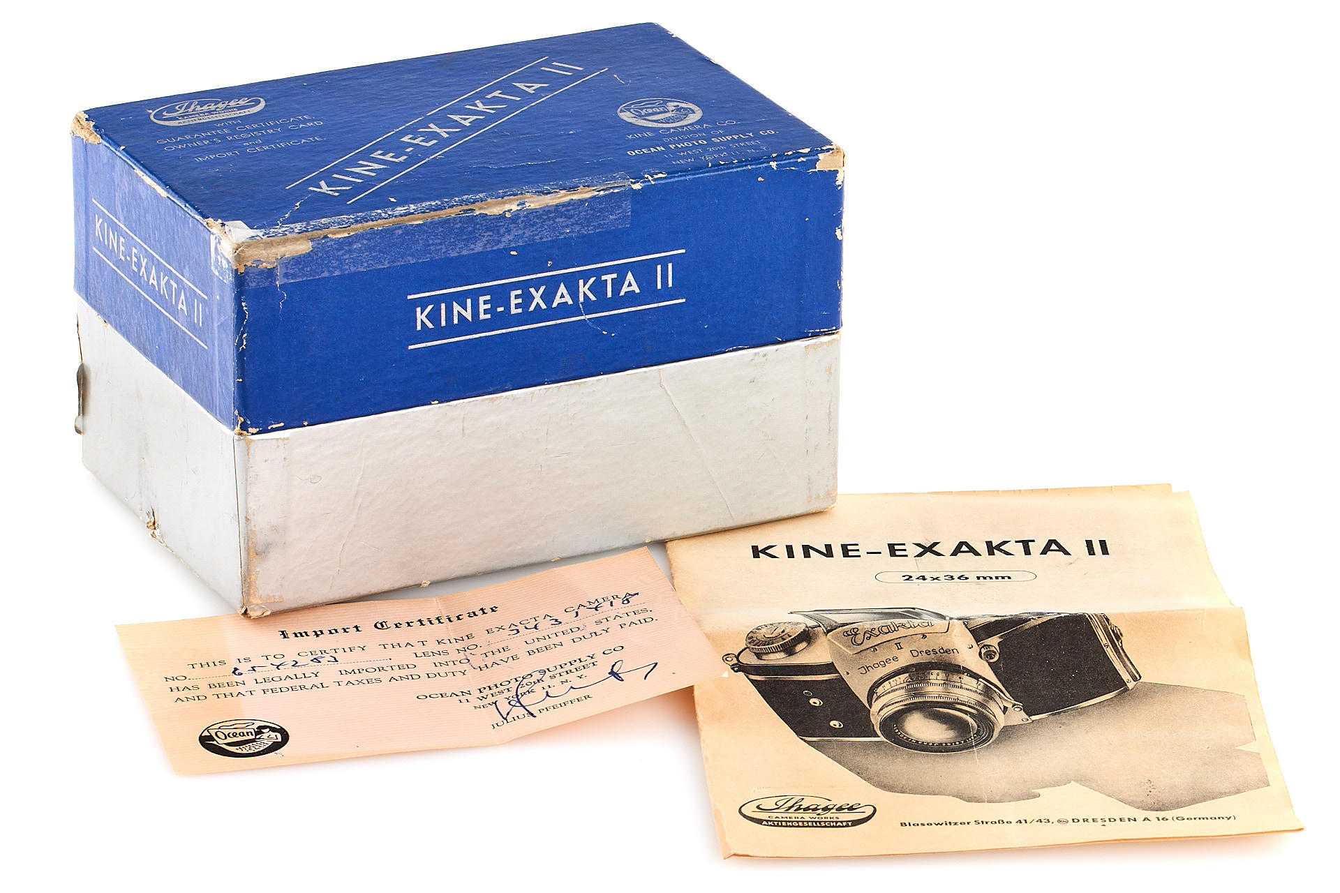 Very rare first type, here an export version, in mint condition, the last known exemplar of this version (649331 - 654283), together with black paint Biotar 2/5.8cm no.3431418 showing some haze and light cleaning marks, with papers, warranty cards wearing both serial numbers (!), and original maker's box, interesting to note the unusual name 'Kine-Exakta II' on the box and papers