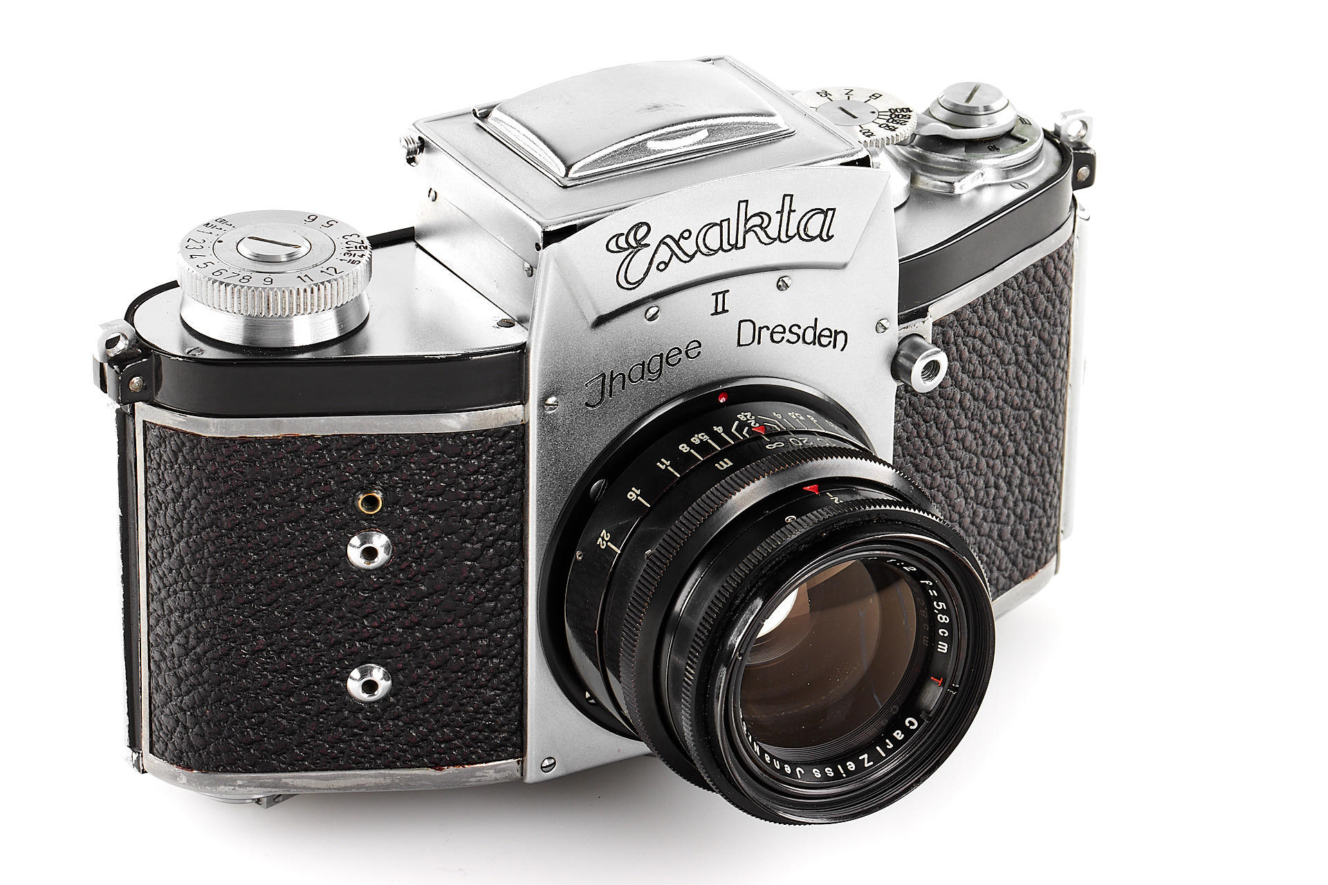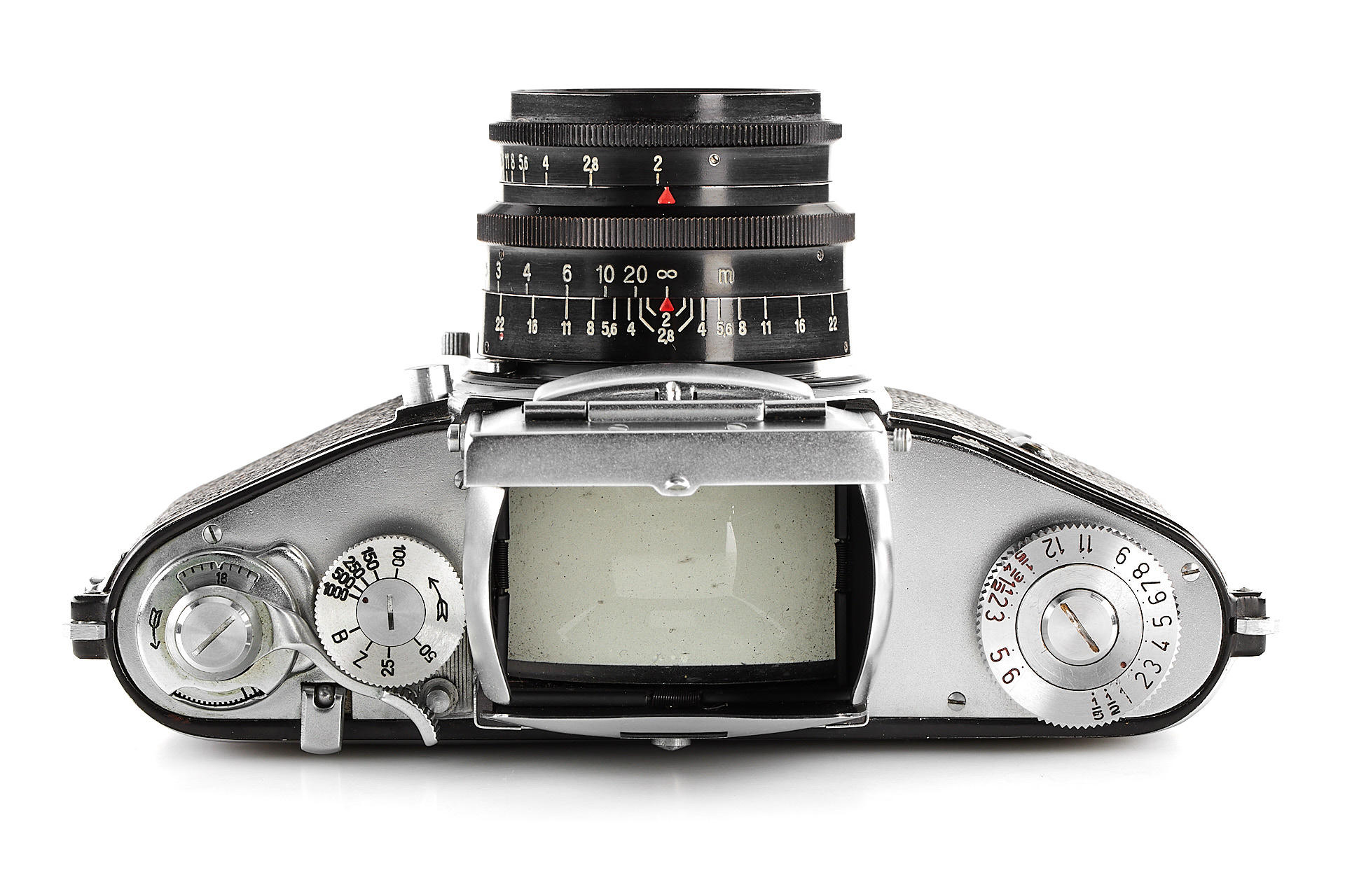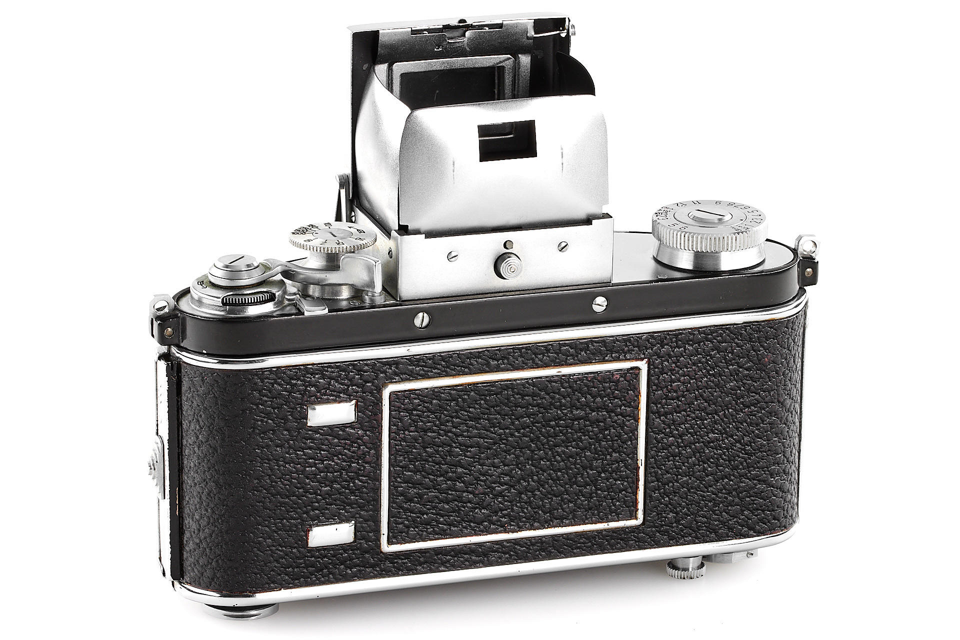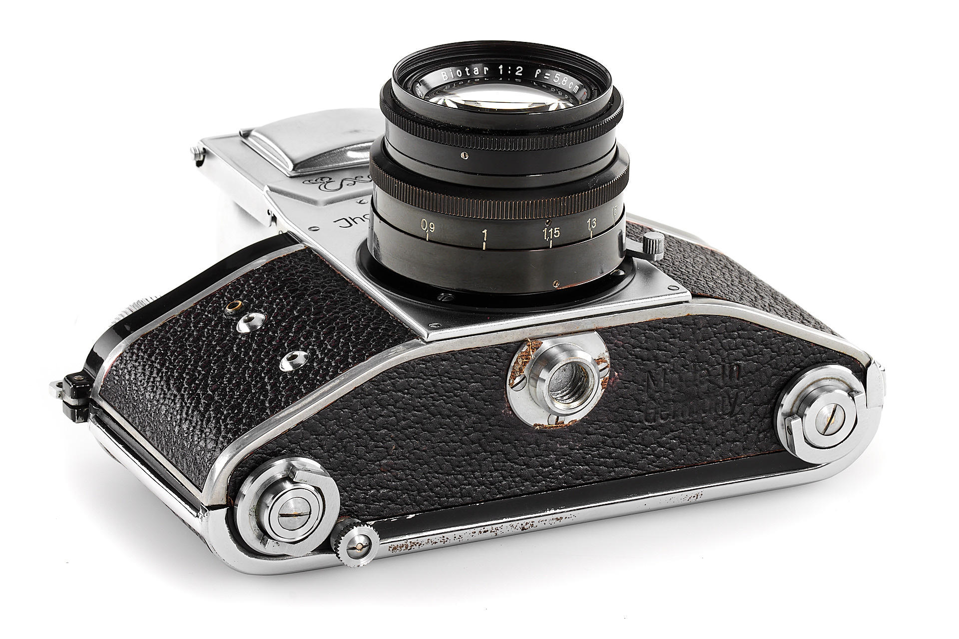 Very rare first type, here an export version, in mint condition, the last known exemplar of this version (649331 - 654283), together with black paint Biotar 2/5.8cm no.3431418 showing some haze and light cleaning marks, with papers, warranty cards wearing both serial numbers (!), and original maker's box, interesting to note the unusual name 'Kine-Exakta II' on the box and papers