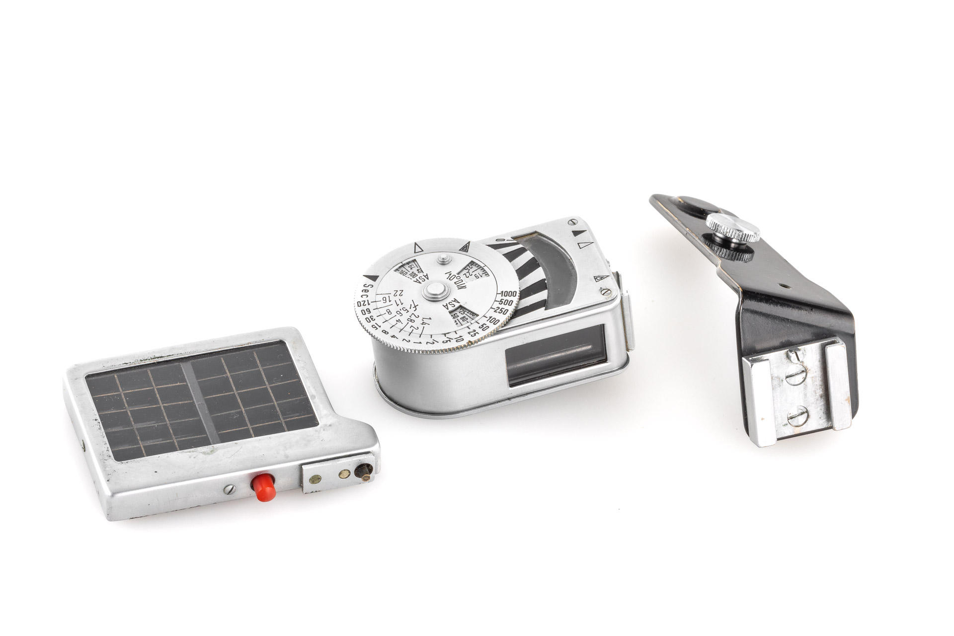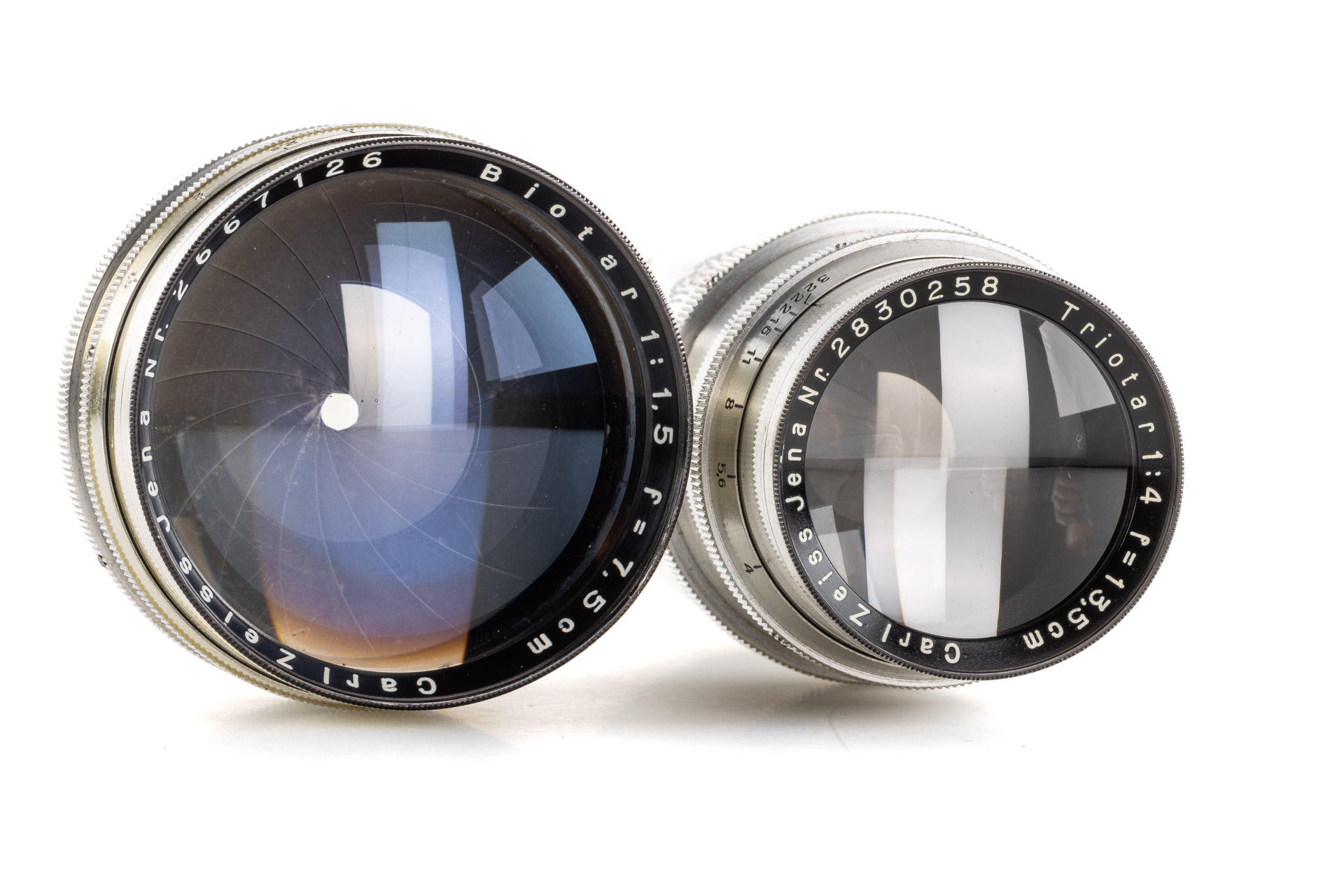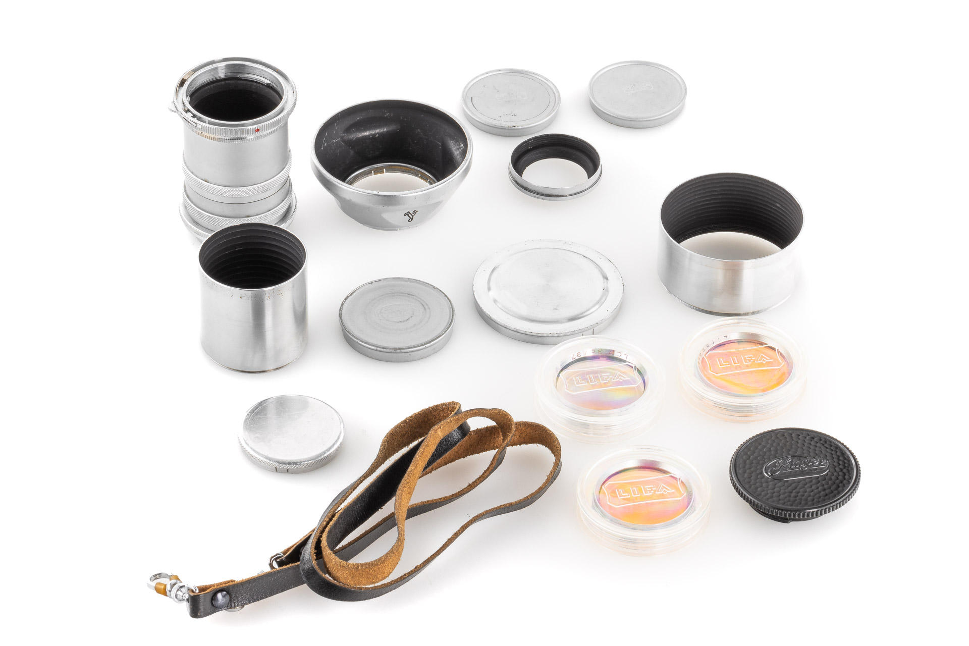 very early first version in near mint condition, with clean and clear Xenon 2/50mm no.2212920 (front lens cap and original hood), rare clean and clear Jsogon 4.5/40mm no.2472088 (rear cap), extremely early Biotar 1.5/7.5cm no.2667126 (hood + both caps) later coated, with almost perfect lenses, clean and clear Triotar 4/13.5cm no.2830258 (hood + both caps), body cap, leather strap, Metraphot with extender, 3x filters, macro extension tubes, Swedish instructions, in wooden outfit case (leather and canvas covered)