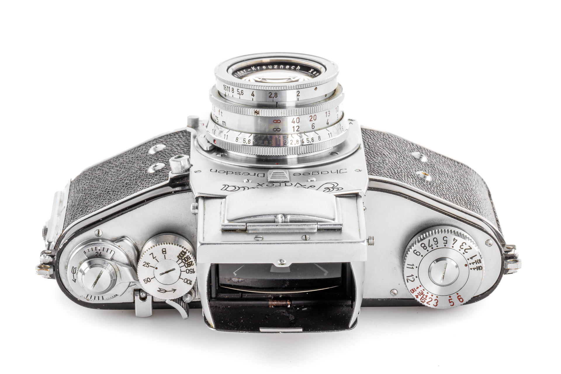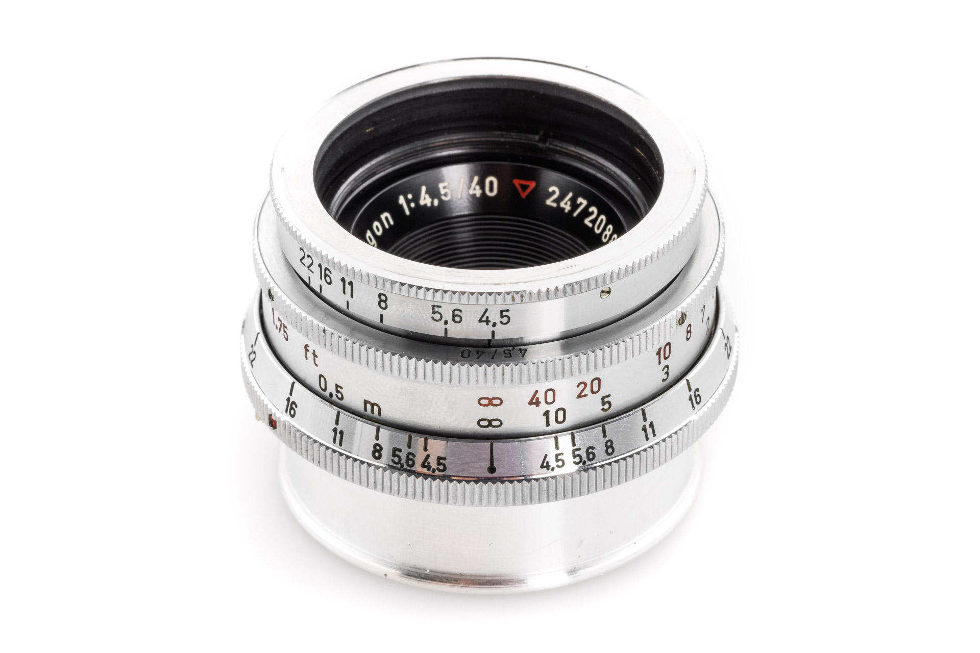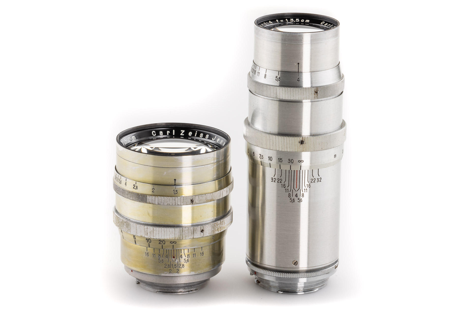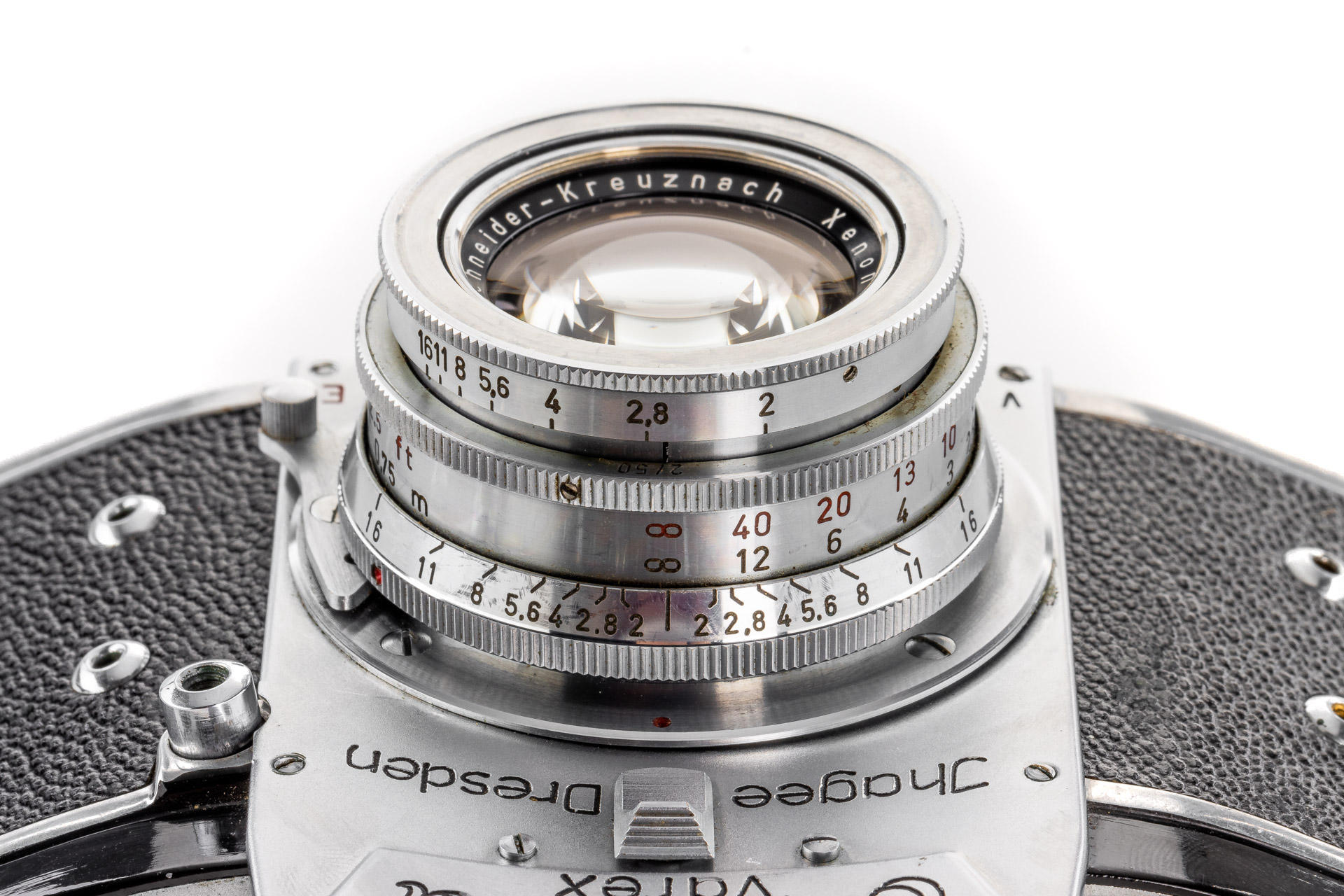 very early first version in near mint condition, with clean and clear Xenon 2/50mm no.2212920 (front lens cap and original hood), rare clean and clear Jsogon 4.5/40mm no.2472088 (rear cap), extremely early Biotar 1.5/7.5cm no.2667126 (hood + both caps) later coated, with almost perfect lenses, clean and clear Triotar 4/13.5cm no.2830258 (hood + both caps), body cap, leather strap, Metraphot with extender, 3x filters, macro extension tubes, Swedish instructions, in wooden outfit case (leather and canvas covered)