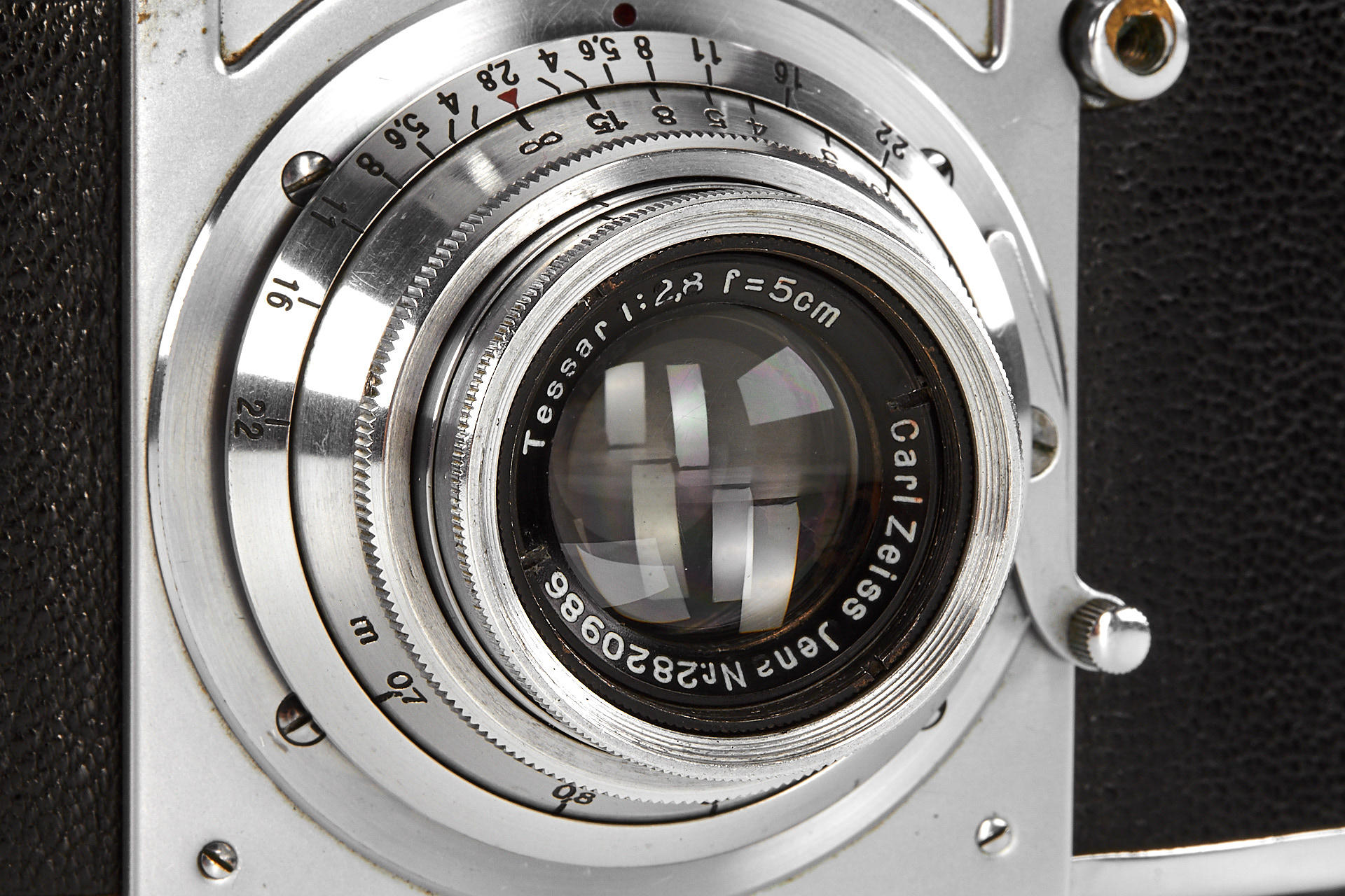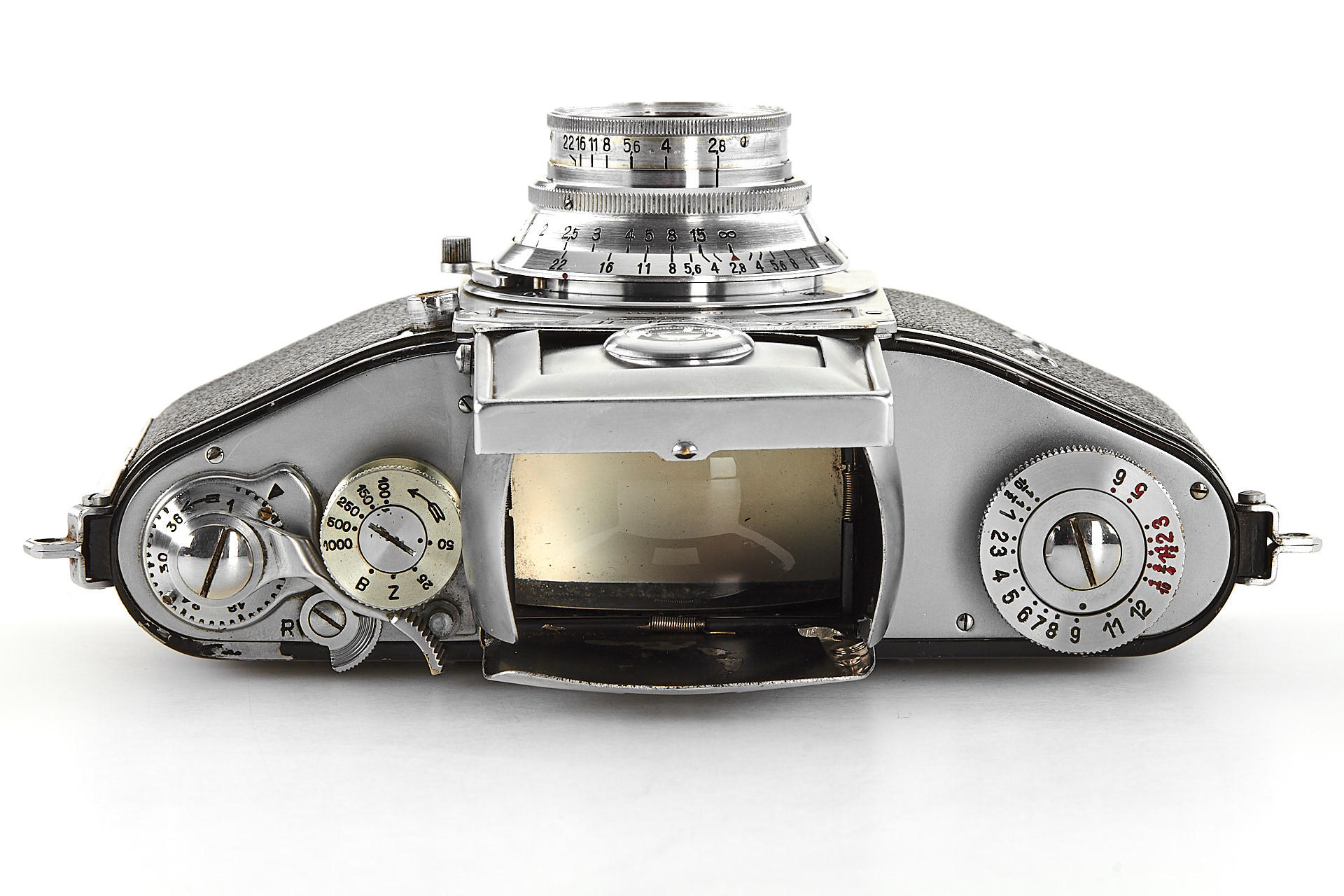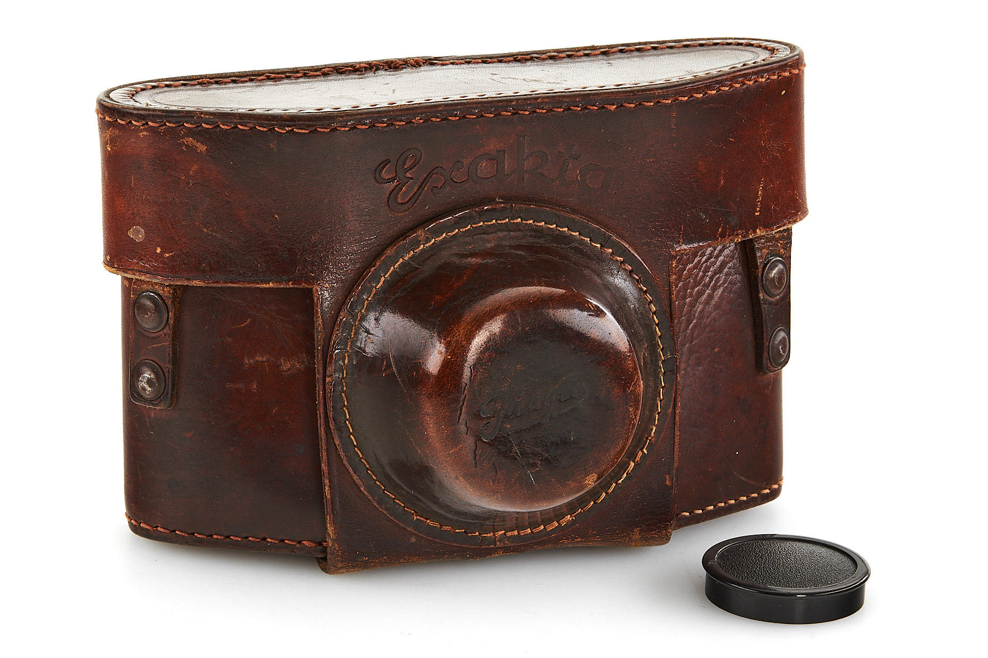 rare first version Kine Exakta SLR with a round magnifier in the non-removable viewing hood, in good original condition, with Tessar 2.8/5cm no.2820986, leather case