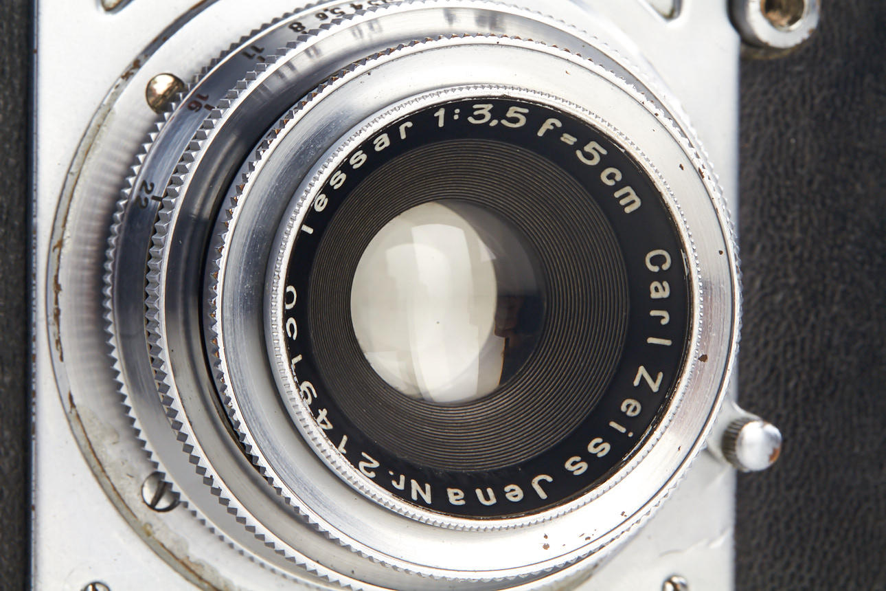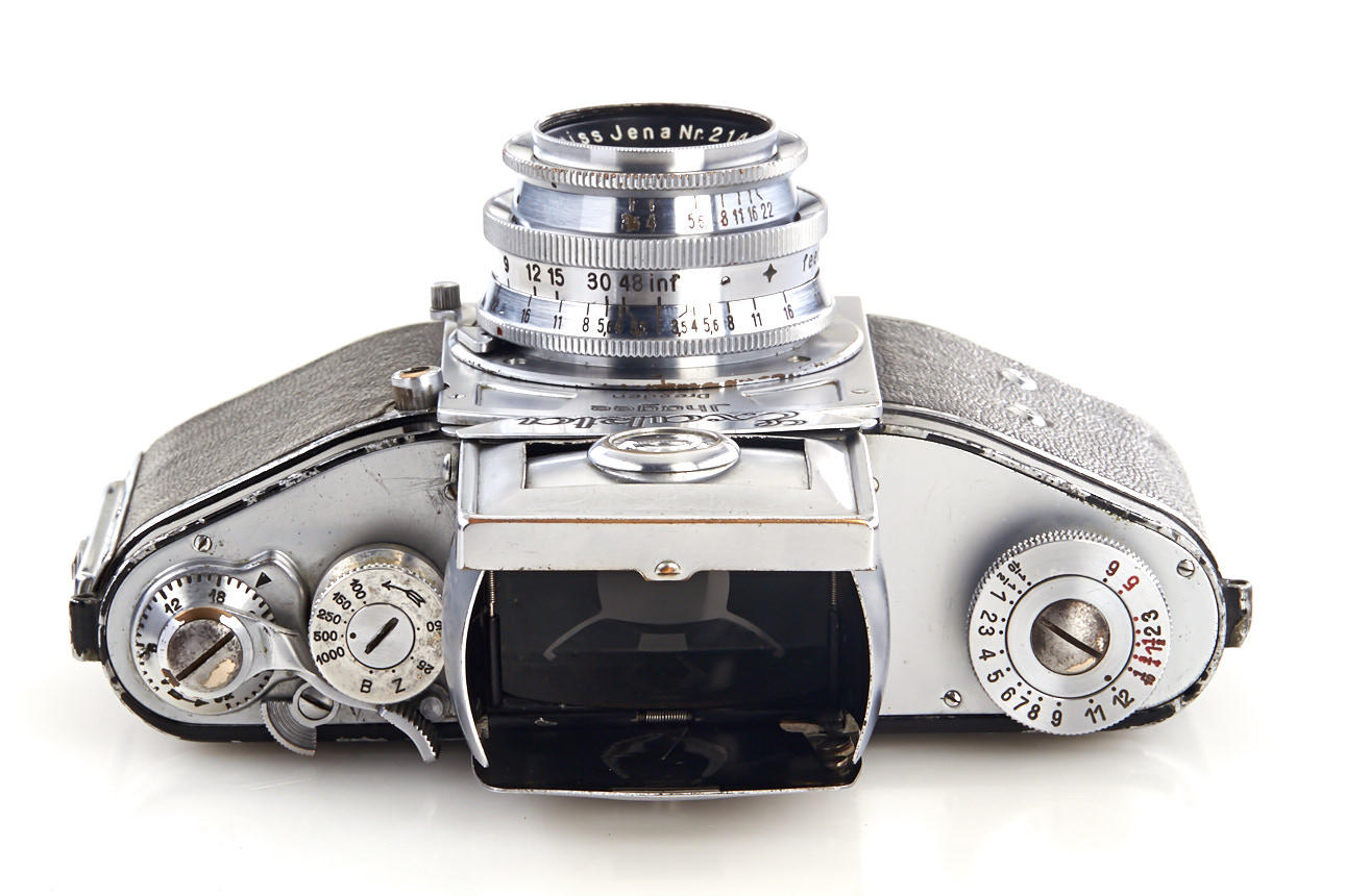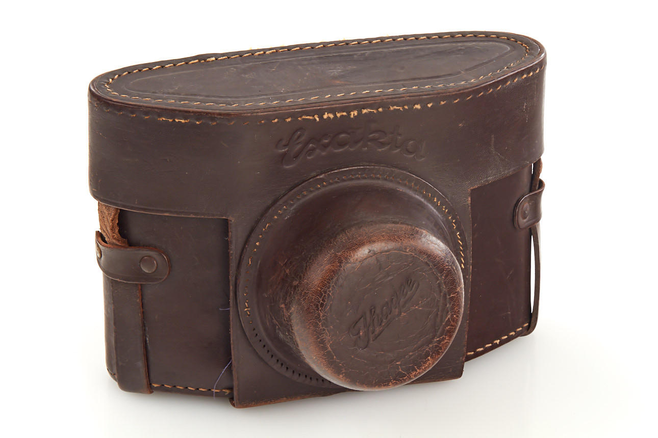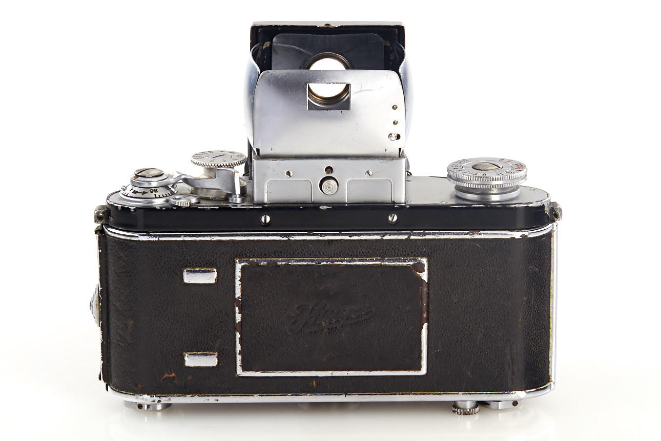 the world's first 24x36mm SLR camera in good original condition, with round magnifier, in perfect working condition, matching Tessar 3.5/5cm no.2149130, case
