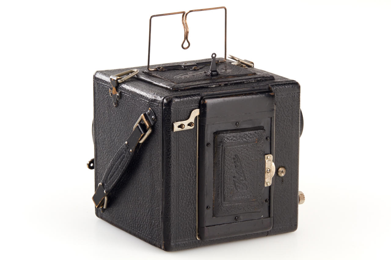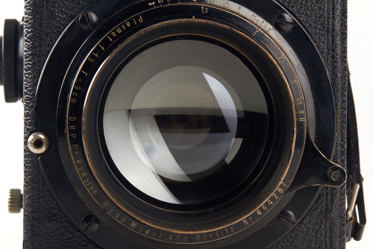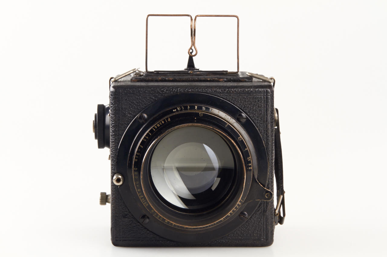 4.5x6 with Hugo Mayer Plasmat 1.5/9cm no.464287, focal-plane shutter 1/15-1/1000, extremely rare, the other known camera was sold at WestLicht in 2002. This beautifully made wooden leather covered reflex camera (Nachtreflex) is in fantastic original condition, the lens is clear and clean.