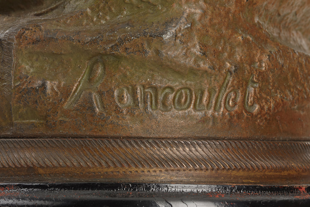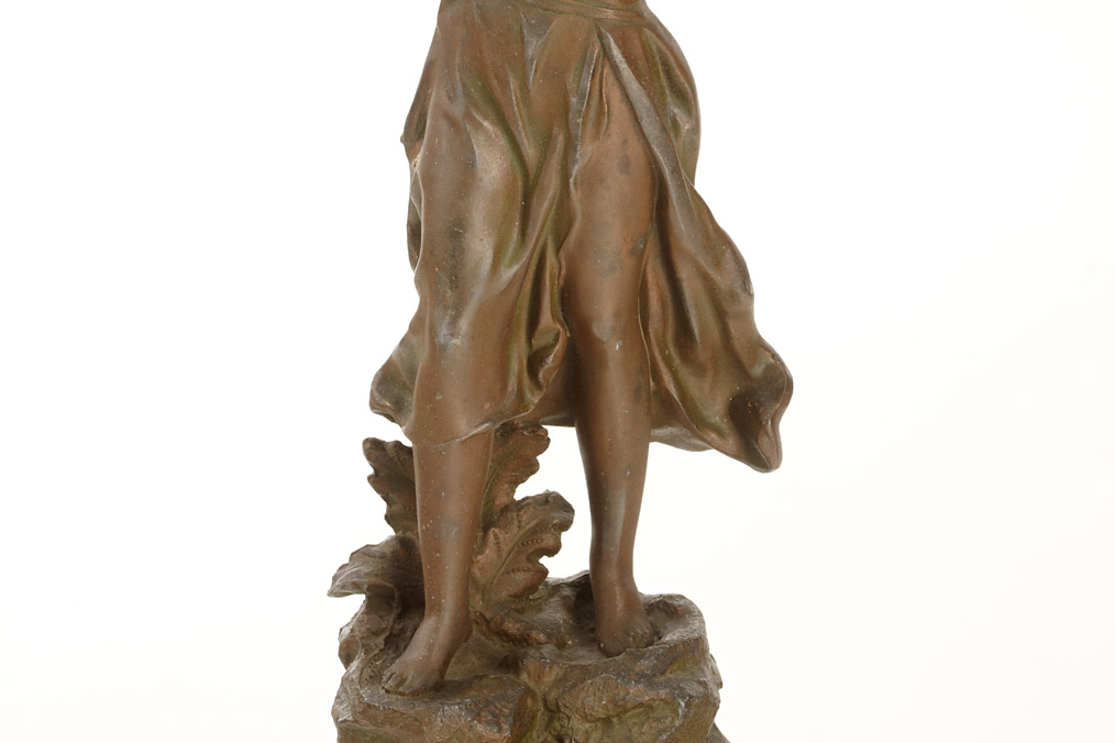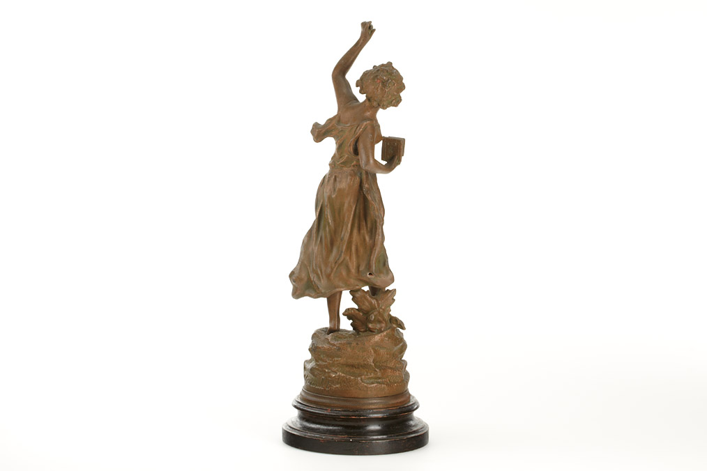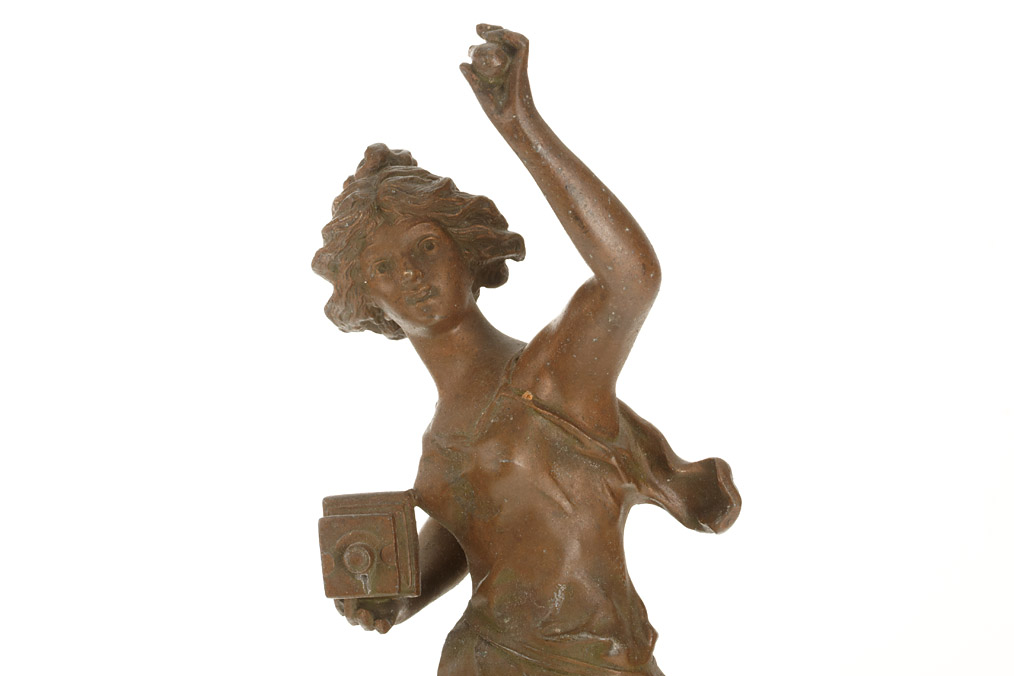 light weight metal statue of an elegant lady holding a folding camera, c.45cm height on a wooden stand, on plaque written: OFFERT PAR LA SUB on de SAPEURS POMPIERS de FLEURY S/ANDELLE au Sergent PEYRONNET POUR 30 ANS de SERVICES 14 JUILLET 1907