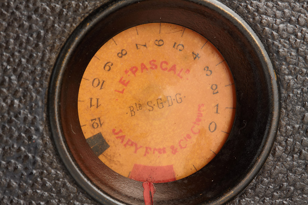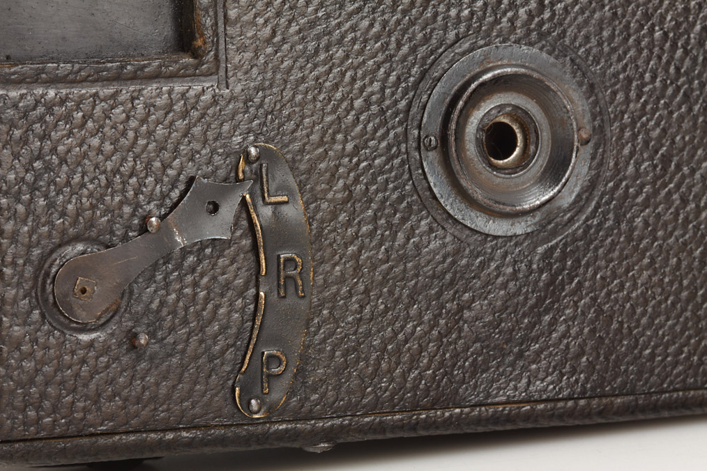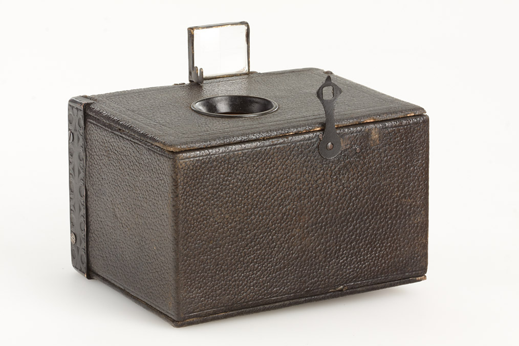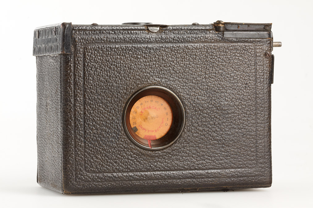 rare box camera with spring motor (not working) for 12 exposures 40x55mm on roll film, leather covered wood and metal body with brass trim, the first motorized roll film camera