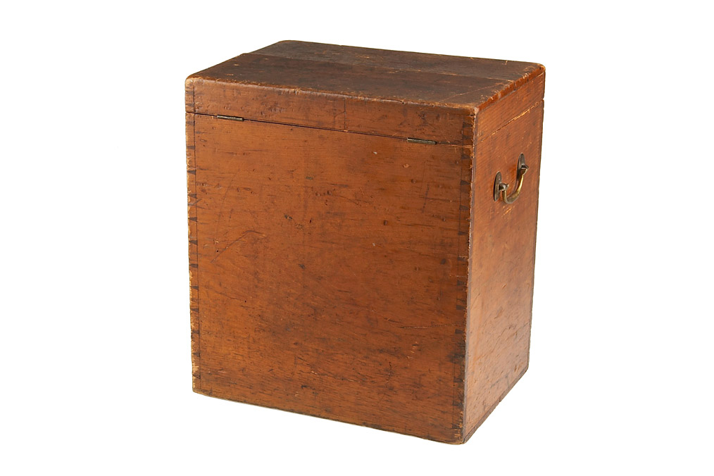 English, used by Julia Margaret Cameron, twin brass carrying handles, the interior fitted with slots for twenty-four 10 x 12' wet-plate negatives, hinged cover inscribed in ink in Mrs. Cameron's hand with list of contents, given below, 325 x 285 x 210mm 1. Julia Duckworth 3/4 as Saint (in an 1868 catalogue of Cameron photographs this is listed as 'La santa Julia') 2. Small Prospero and Miranda (the sitters are Sir Henry Taylor and Mary Ryan) 3. Mary Ryan as Lily of Padua 4. Philip Worsley (Poet) 5. The Anniversary (This is listed in the 1868 catalogue) 6. Philip 'Casar Borgia' 7. Juila Duckworth full face (Mrs. Herbert Duckworth neé Jackson) 8. Henry Taylor Apostle (Sir Henry Taylor 1800-1886, official at the Colonial Office, wrote poetry) 9. Mary Henry profile 10. Queen group 11. Mary Fisher (Mrs. Herbert Fisher neé Jackson, sister of Juila) 12. Mary Fisher 13. Julia Duckworth profile 14. Philip again as 'Casar Borgia' 15. King Cophetua Civy 16. A Vestal 17. The Dialogue again 18. My Charlie Hay with brush (son) 19. Maria Pears (Listed in the 1868 Colnaghi catalog) 20. Maria Pears again 21. Clio again 22. Portrait May Prinsep (Listed in the 1868 Colnaghi catalog) 23. Irish May with hat 24. Profile Christina Rossetti (no photograph by Cameron of Christina is known to exist) Literature: A photograph of this box appears in THE CAMERON COLLECTION, Colin Ford, p.15 Provenance: Spira Collection SOTHEBY'S BELGRAVIA, JUNE 17, 1981, Lot 398