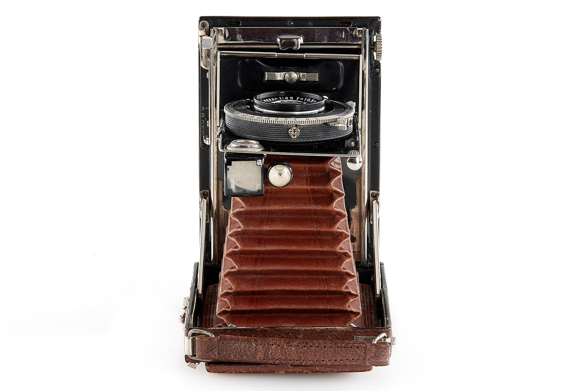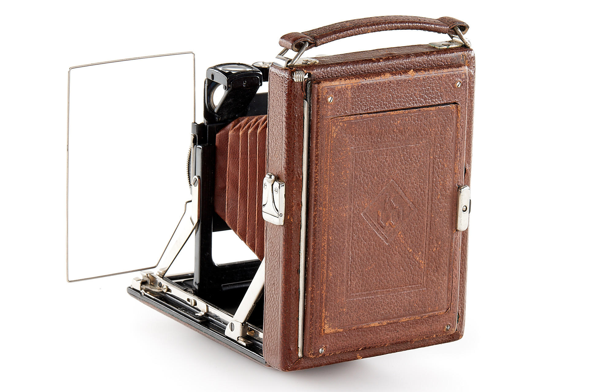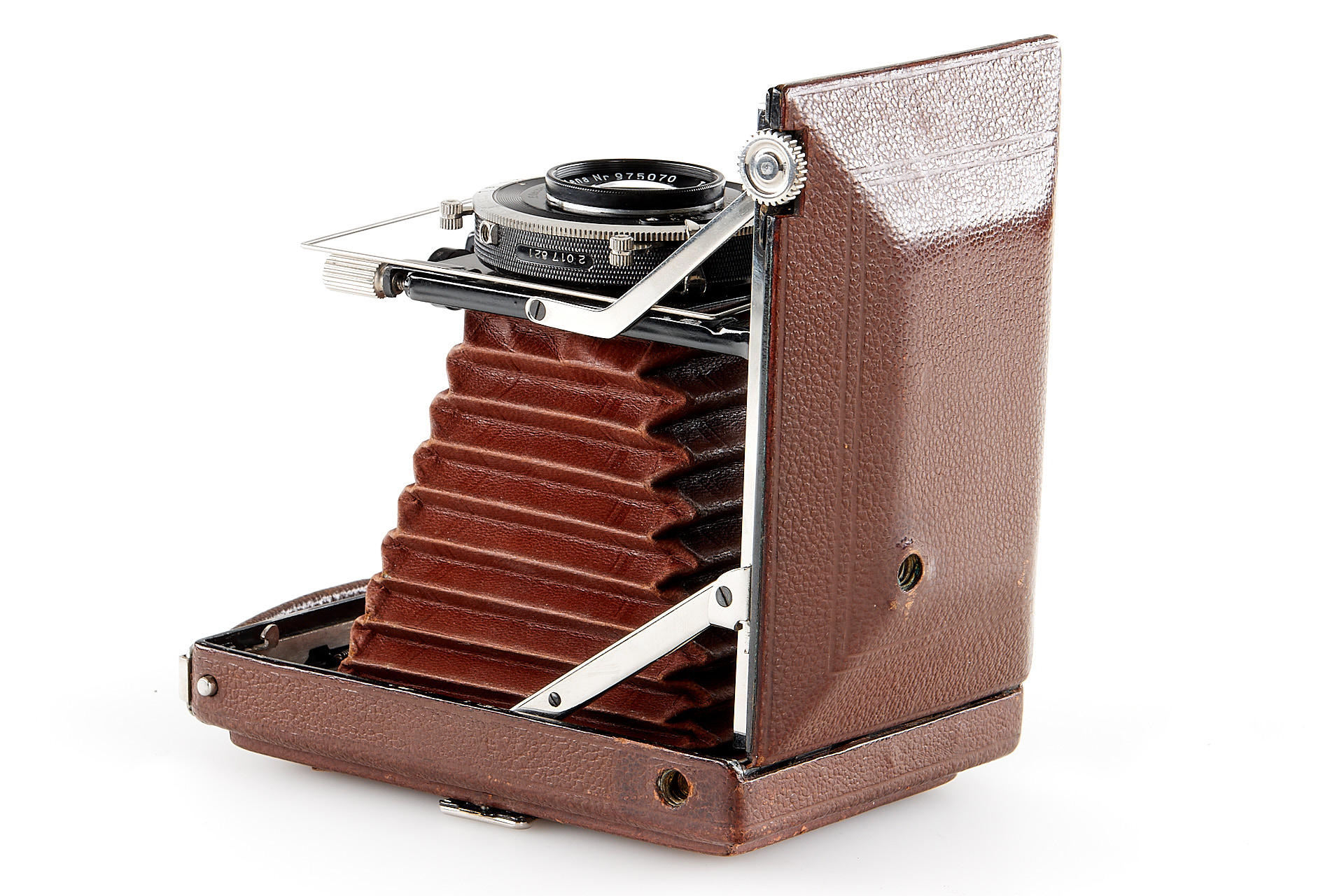 Uncommon brown leather version of this folding-bed plate camera for 6.5x9cm, in very good condition and working order, with Tessar 4.5/10.5cm no.975070 mounted in Compur, focusing screen, 2x film plate holders and leather case (with key)
