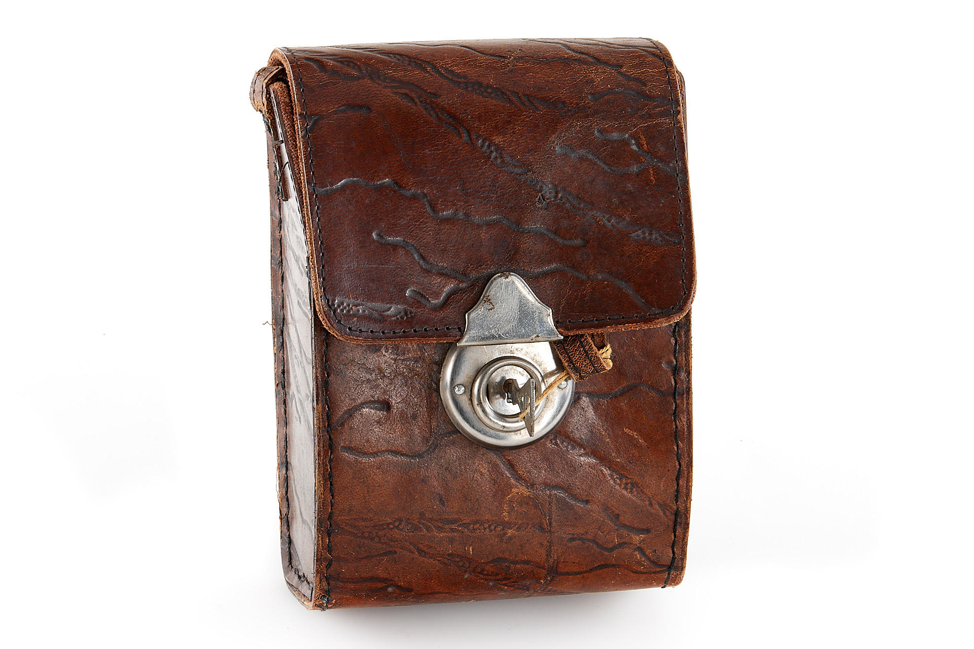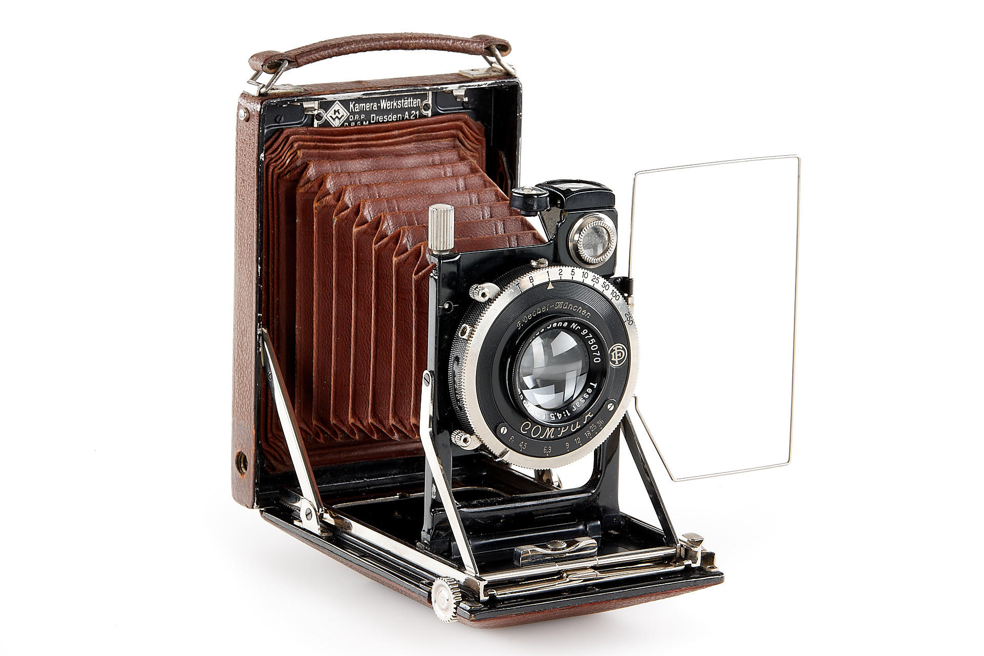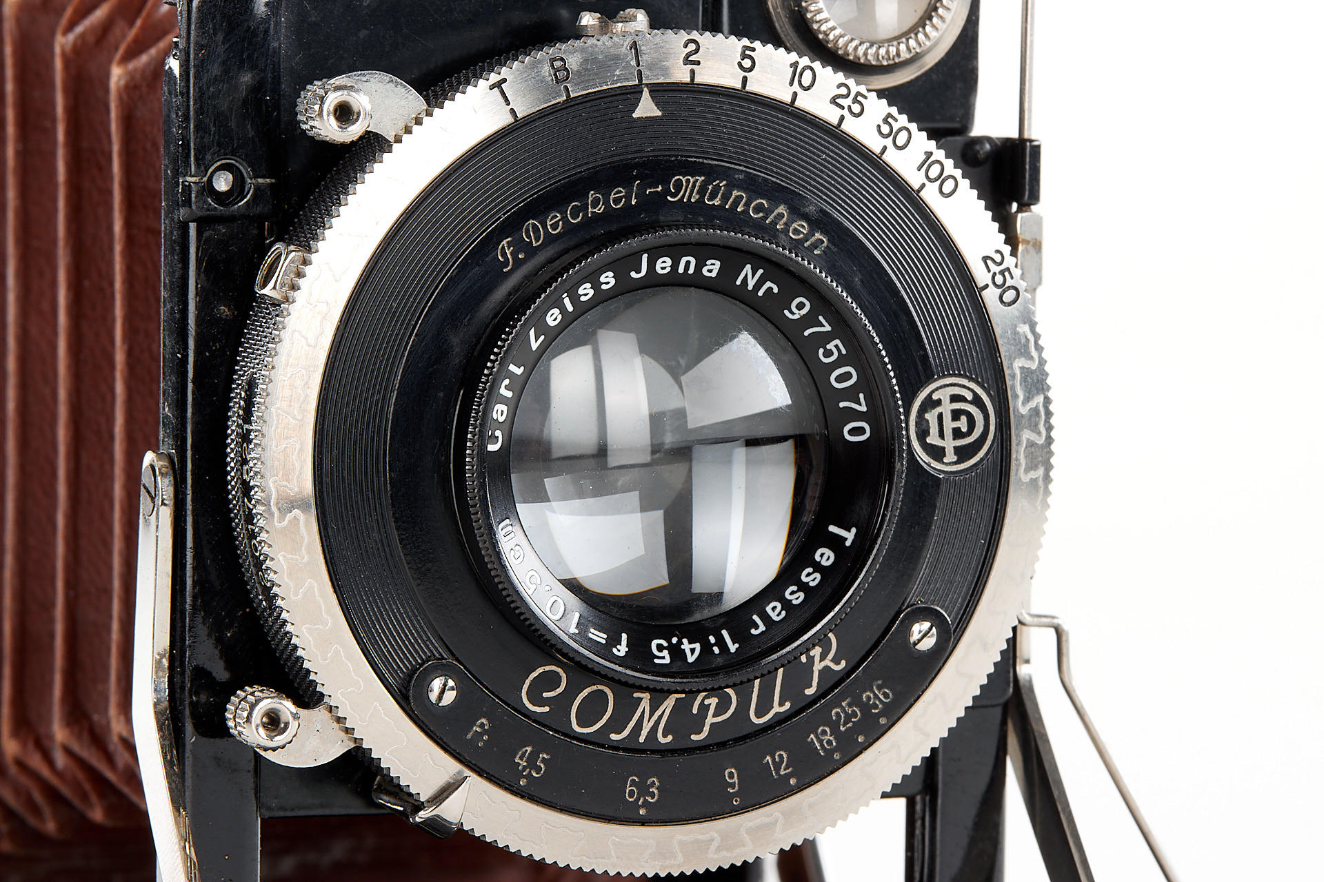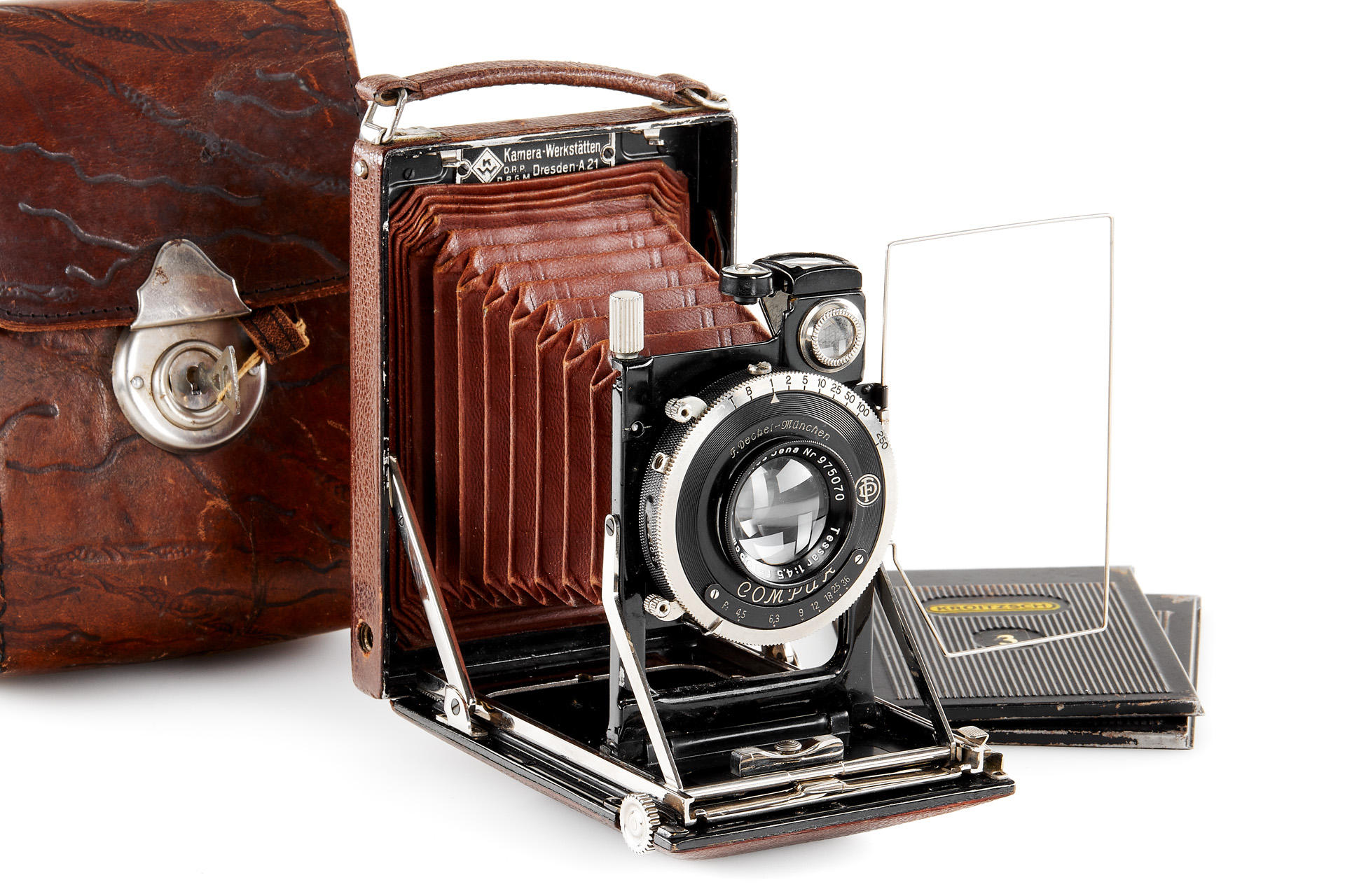 Uncommon brown leather version of this folding-bed plate camera for 6.5x9cm, in very good condition and working order, with Tessar 4.5/10.5cm no.975070 mounted in Compur, focusing screen, 2x film plate holders and leather case (with key)