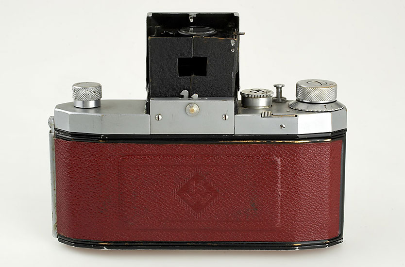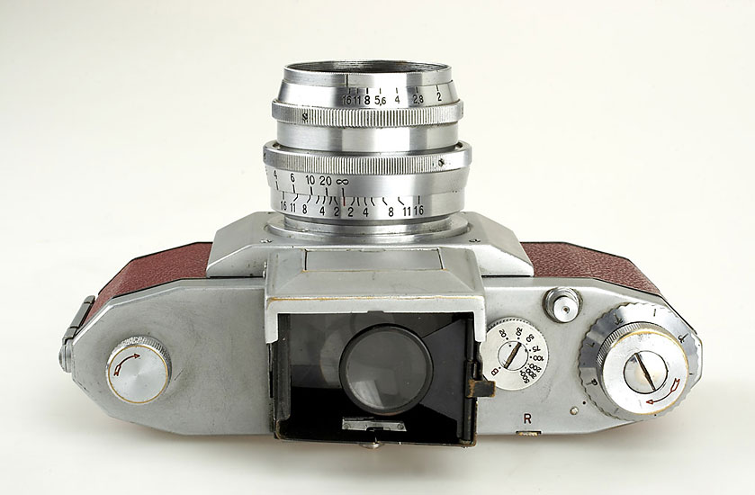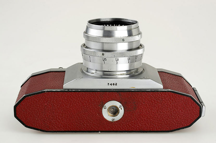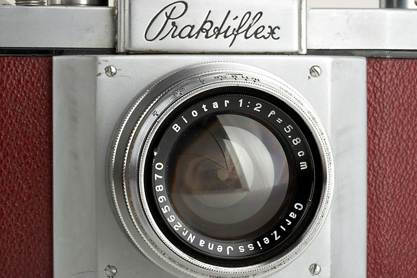 rare Praktiflex (type 074) with original red leather covering, no strap lugs, matching Biotar 2/5.8cm no.2659870, cap