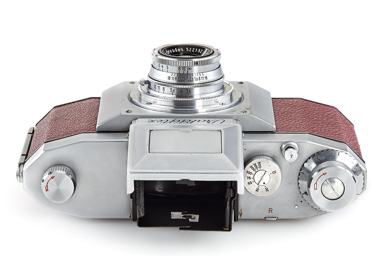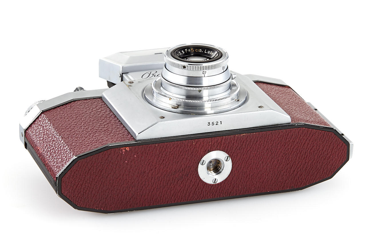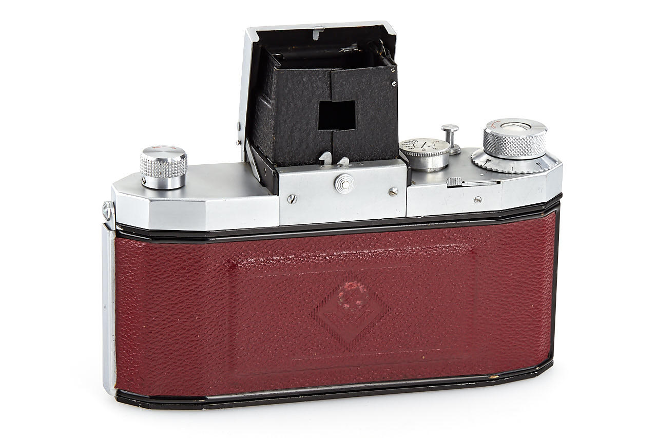 rare Praktiflex (type 074) with original red leather covering, no strap lugs, in excellent condition, with matching uncoated Victar 3.5/5cm no.522192