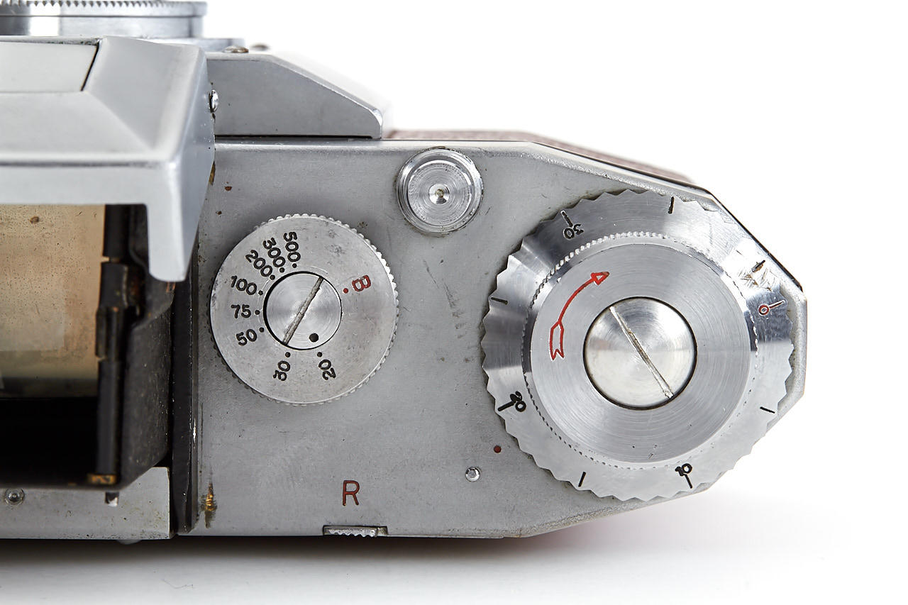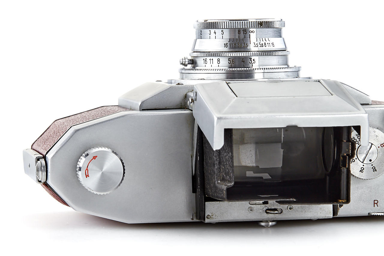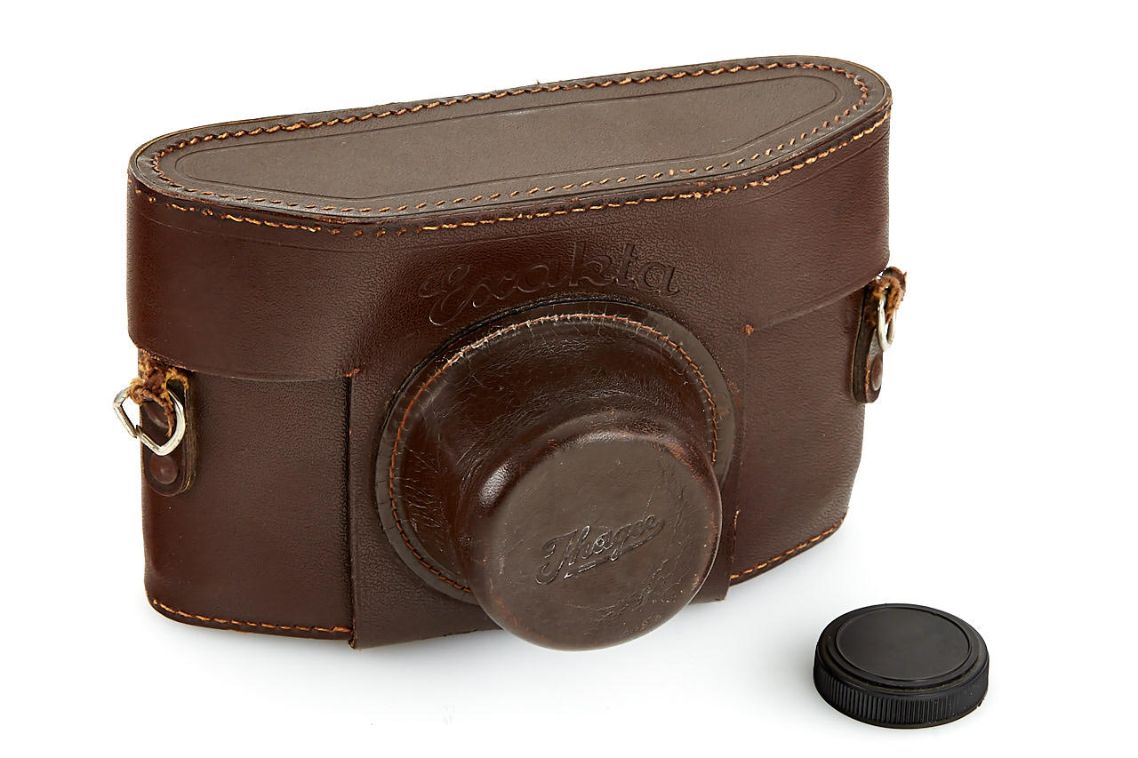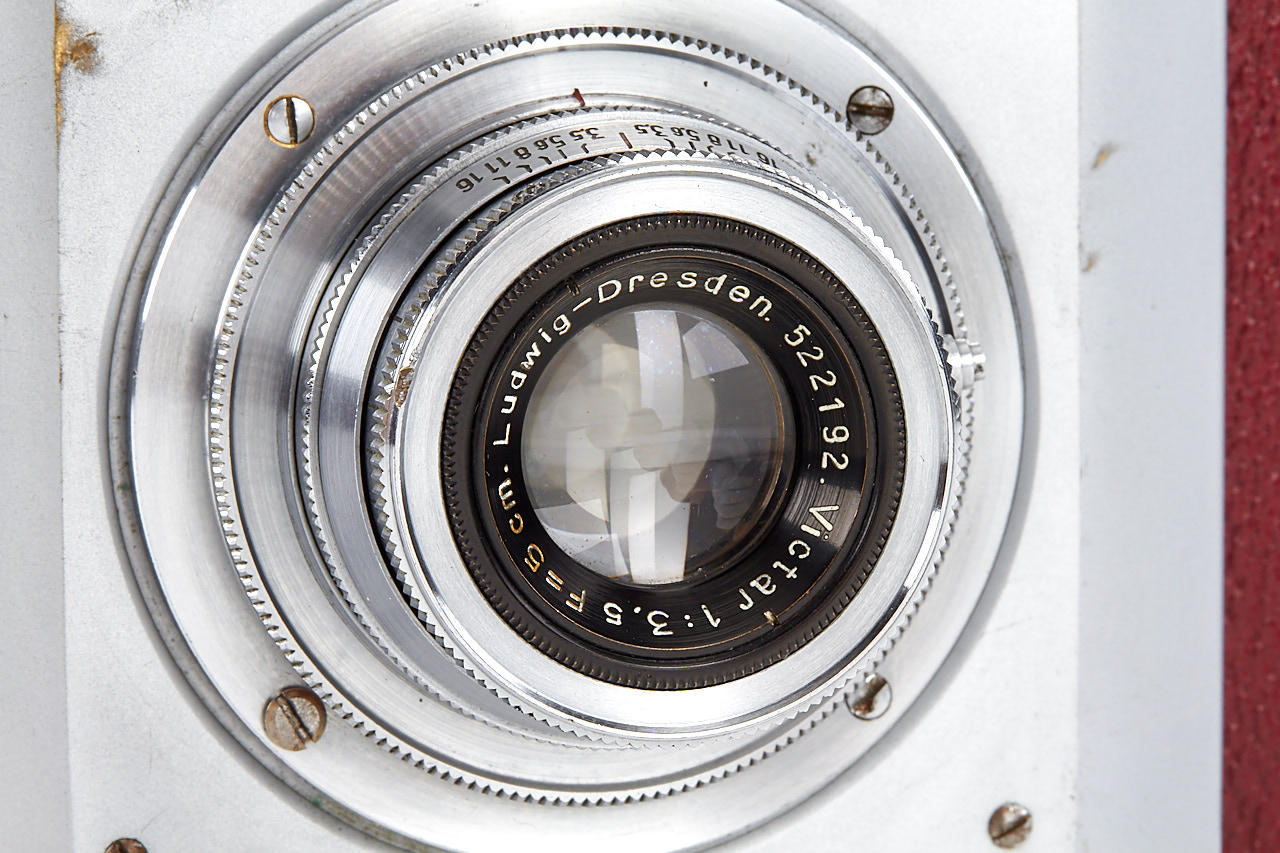 rare Praktiflex (type 074) with original red leather covering, no strap lugs, in excellent condition, with matching uncoated Victar 3.5/5cm no.522192