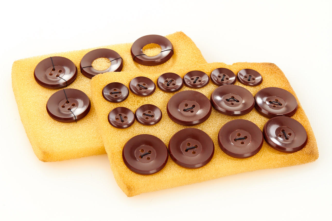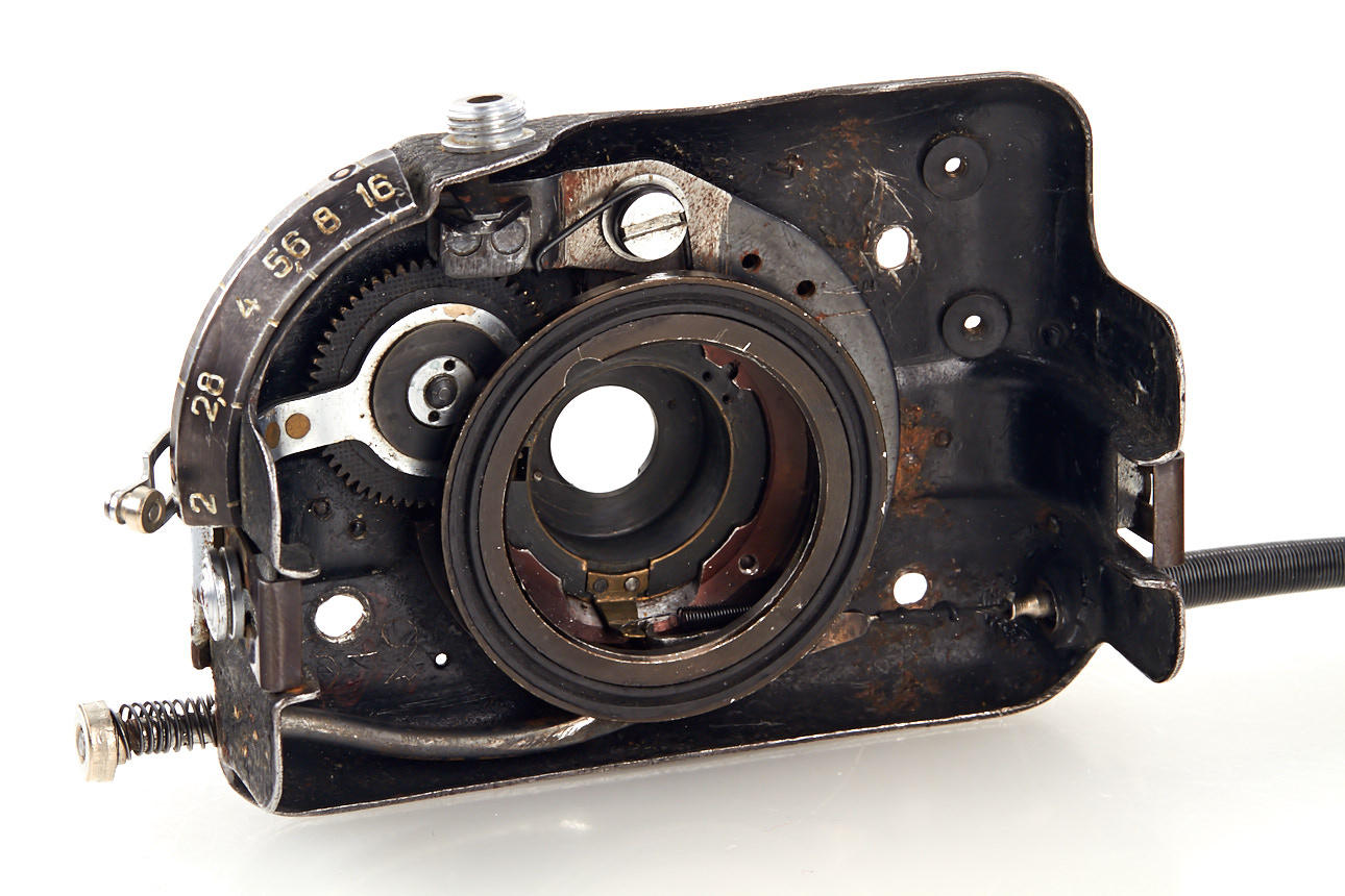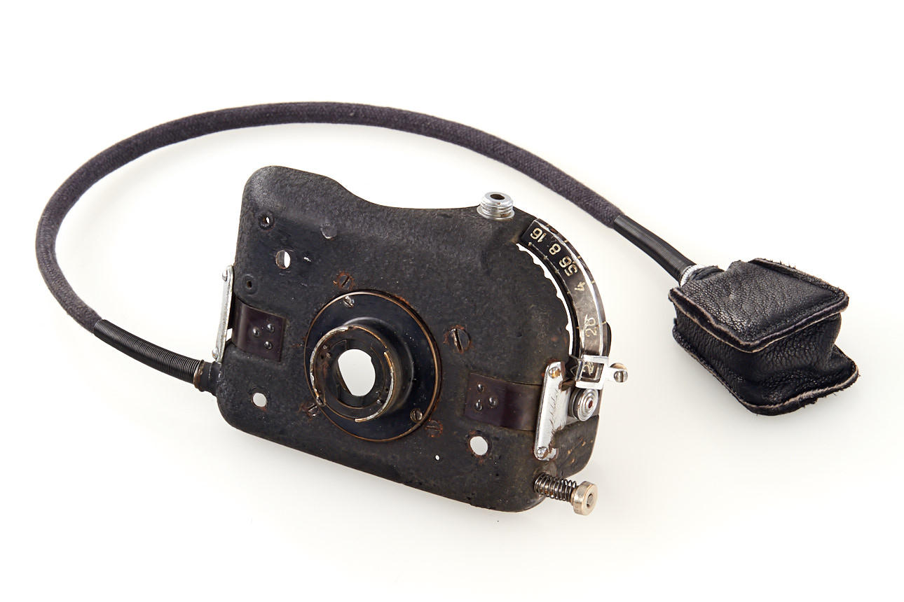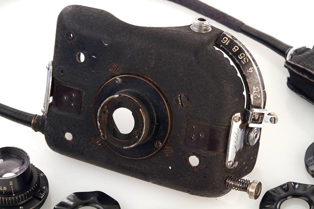 original unused set made for Russian Secret Service, consisting a mounting device for F-21 camera (with special shutter release to be hidden in a coat pocket), prepared black knobs, 19 brown coat knobs (two of them with opening for shutter)