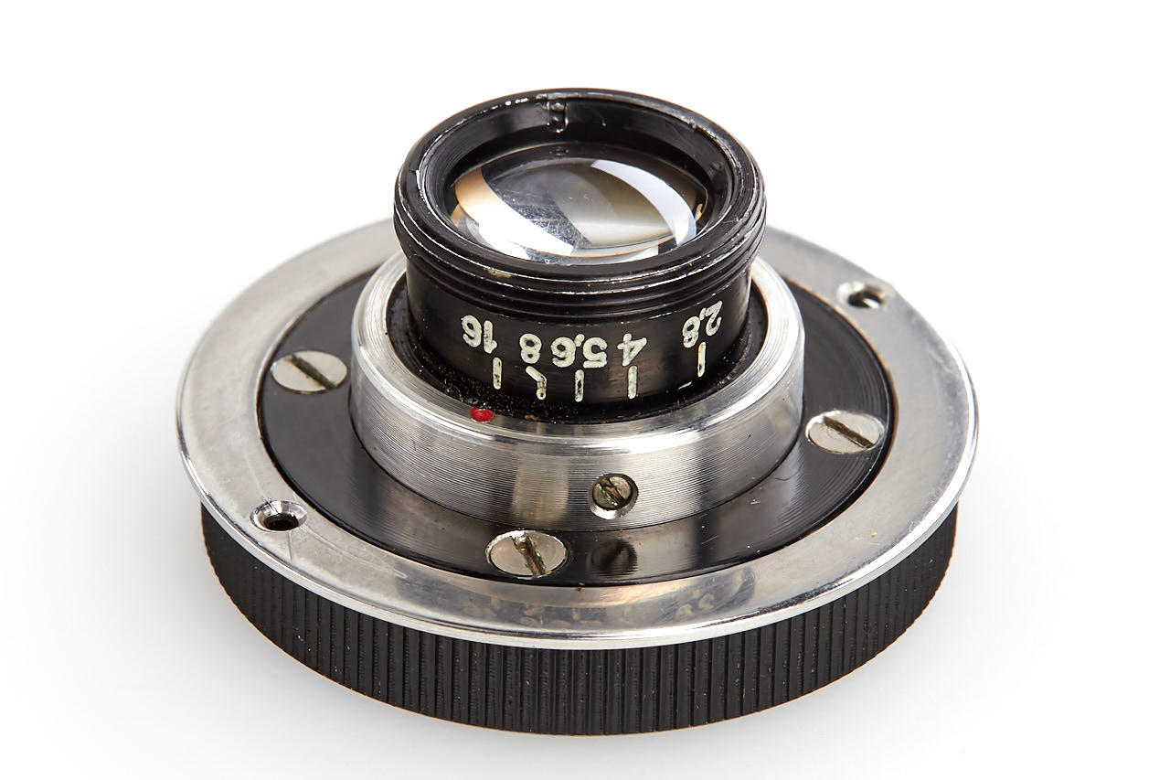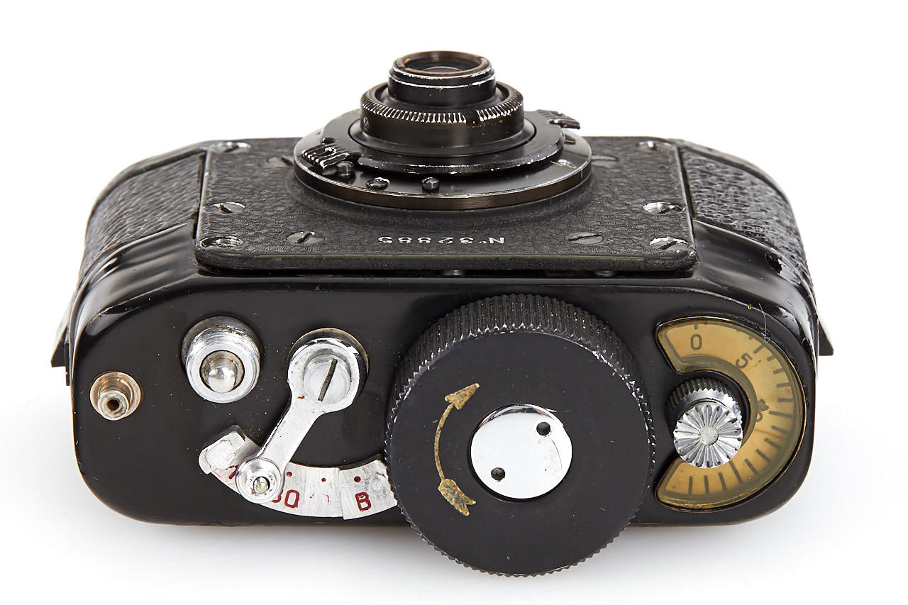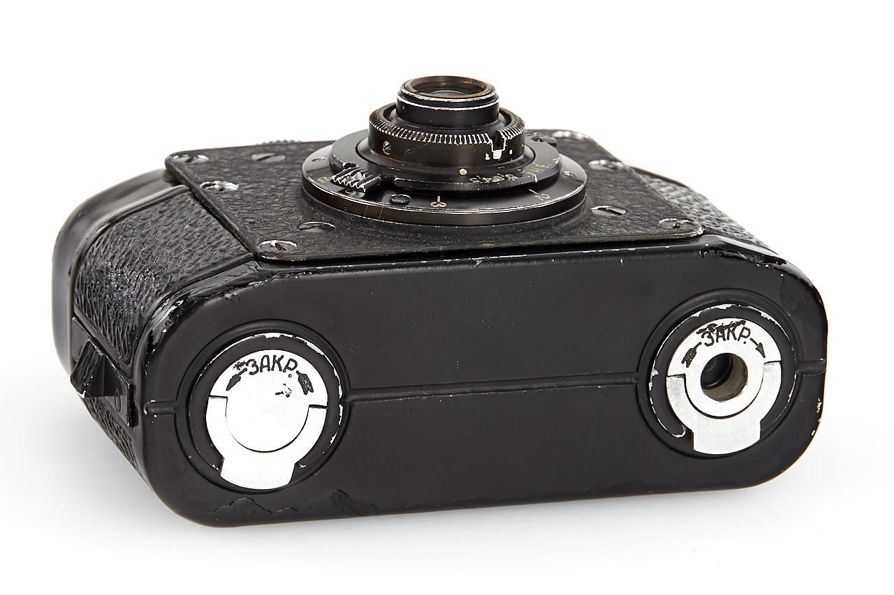 clockwork motorized spy camera made for the Russian secret service, with f:3.5 lens, additional fast 2.8/28mm lens, film spool, special wire release
