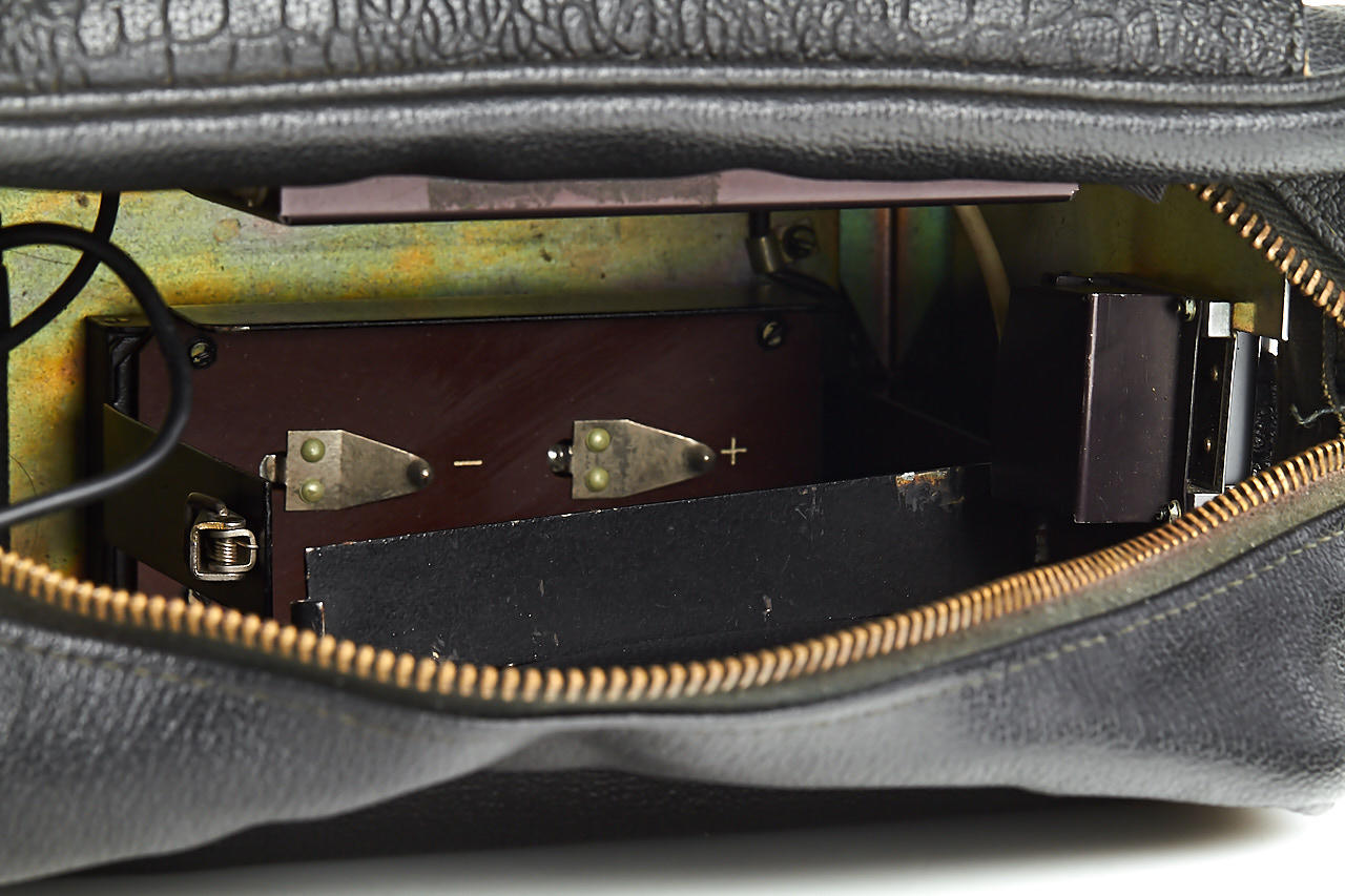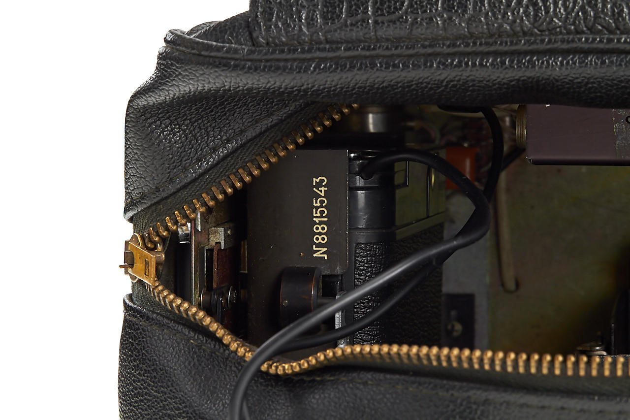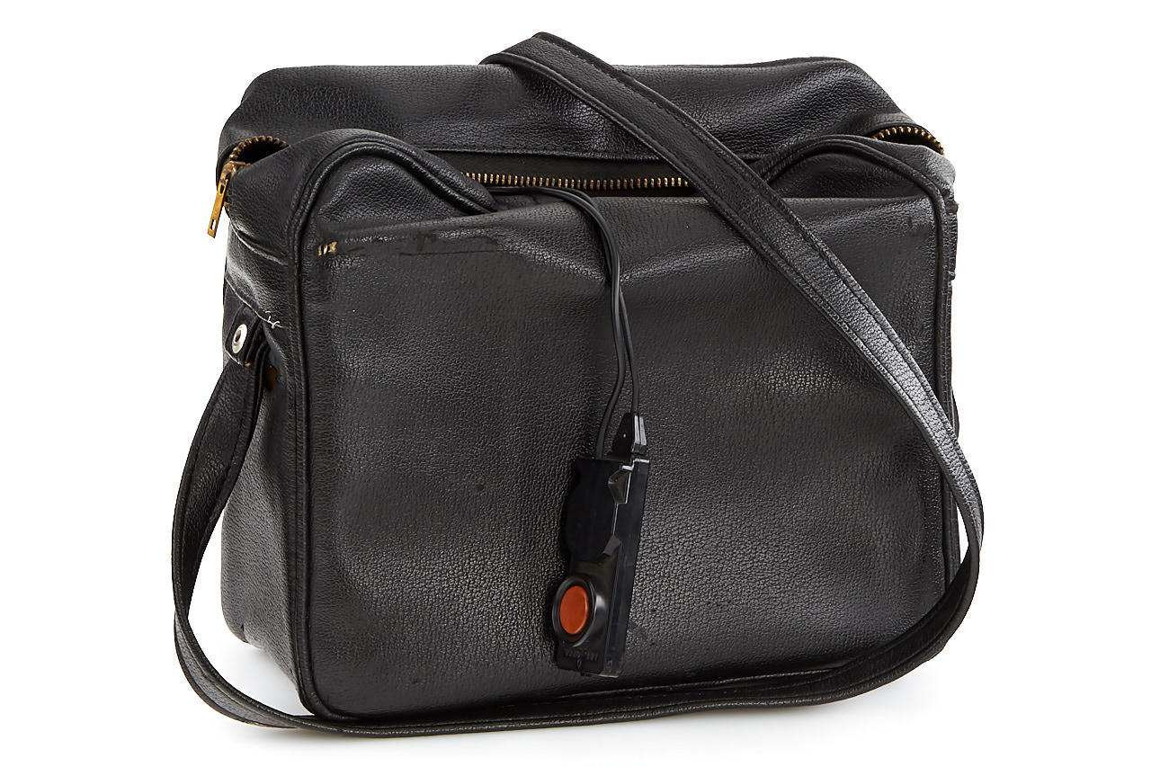leather shoulder bag with built-in Neozit camera no.86073, takes pictures through a hole on the side of the bag and is operated by pushing a hidden knob on the other side of the bag or by using an included cable release, a highly sophisticated design and an original spy outfit, incl. two film cassettes
