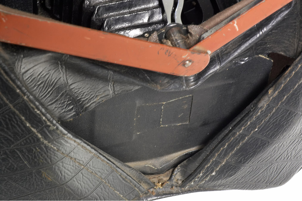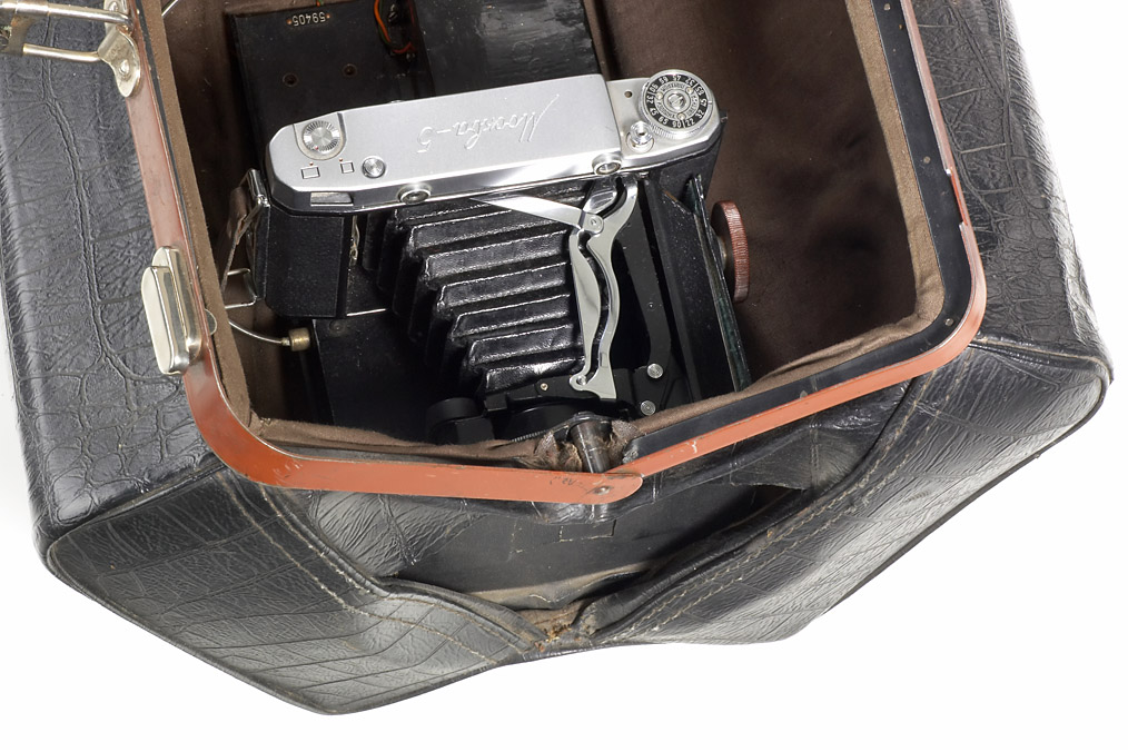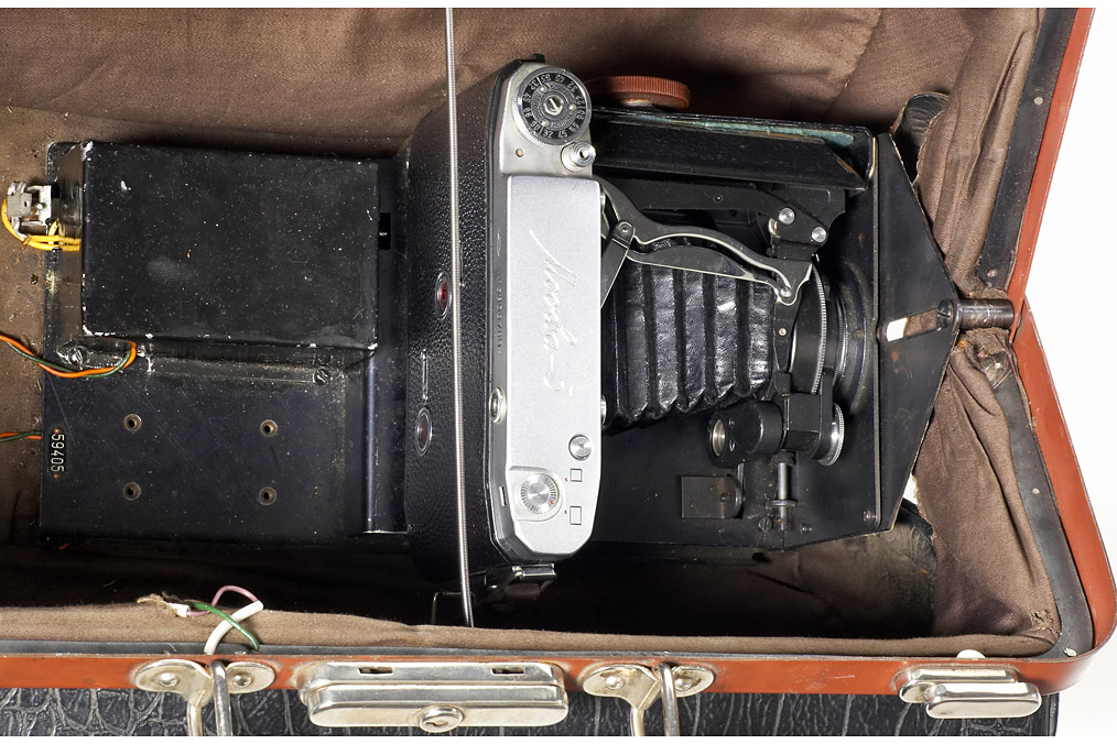 KGB Spy camera outfit built into a doctor's bag. This remarkable spy outfit dates from the late 1950s and uses a Moskwa-5 camera (Zeiss Super Ikonta copy). It takes pictures through an ingeniously concealed hole in the side of the bag. Electric release, perfectly hidden in the bag's handle. As the Moskwa was a very conventional camera without a motor drive, its central shutter had to be cocked before the being released, this is done by pulling a small steel cord next to the handgrip. A very unusual design. Comes with a photocopy of the original (Russian) instructions.