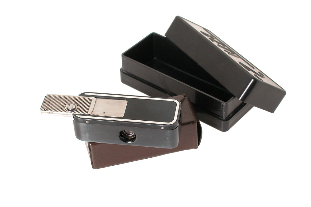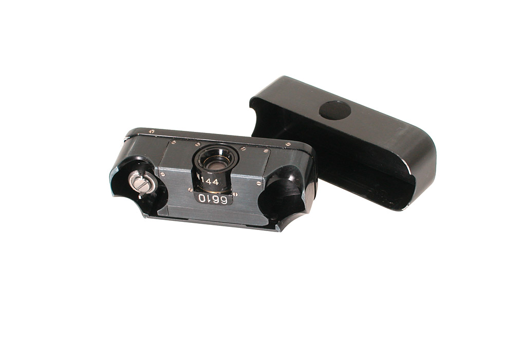 for Minox film, an unbelievably well made example of a clandestine camera for one of the eastern secret services, probably the KGB. The camera has a body milled from solid metal to extremely fine tolerances and uses a coated six-element double Gaussian wide angle lens with 65 degrees of view. Single-speed (about 1/90) focal-plane shutter of all metal design. The film is transported and the shutter cocked by sliding a chrome plated tab on the top of the camera. Originally a 115cm thinbase polyester film strip in two different cassettes was used for about a hundred pinpoint sharp images 8x9 mm. No finder. Focus fixed at infinity, large depth-of-field. Only very few of these cameras have been located, all serial numbers are very close. It comes with the orig. leather case, plastic box