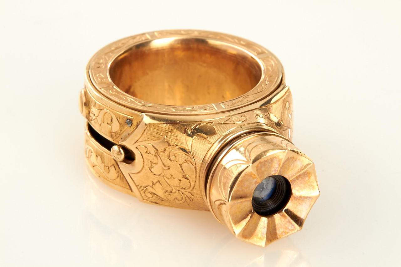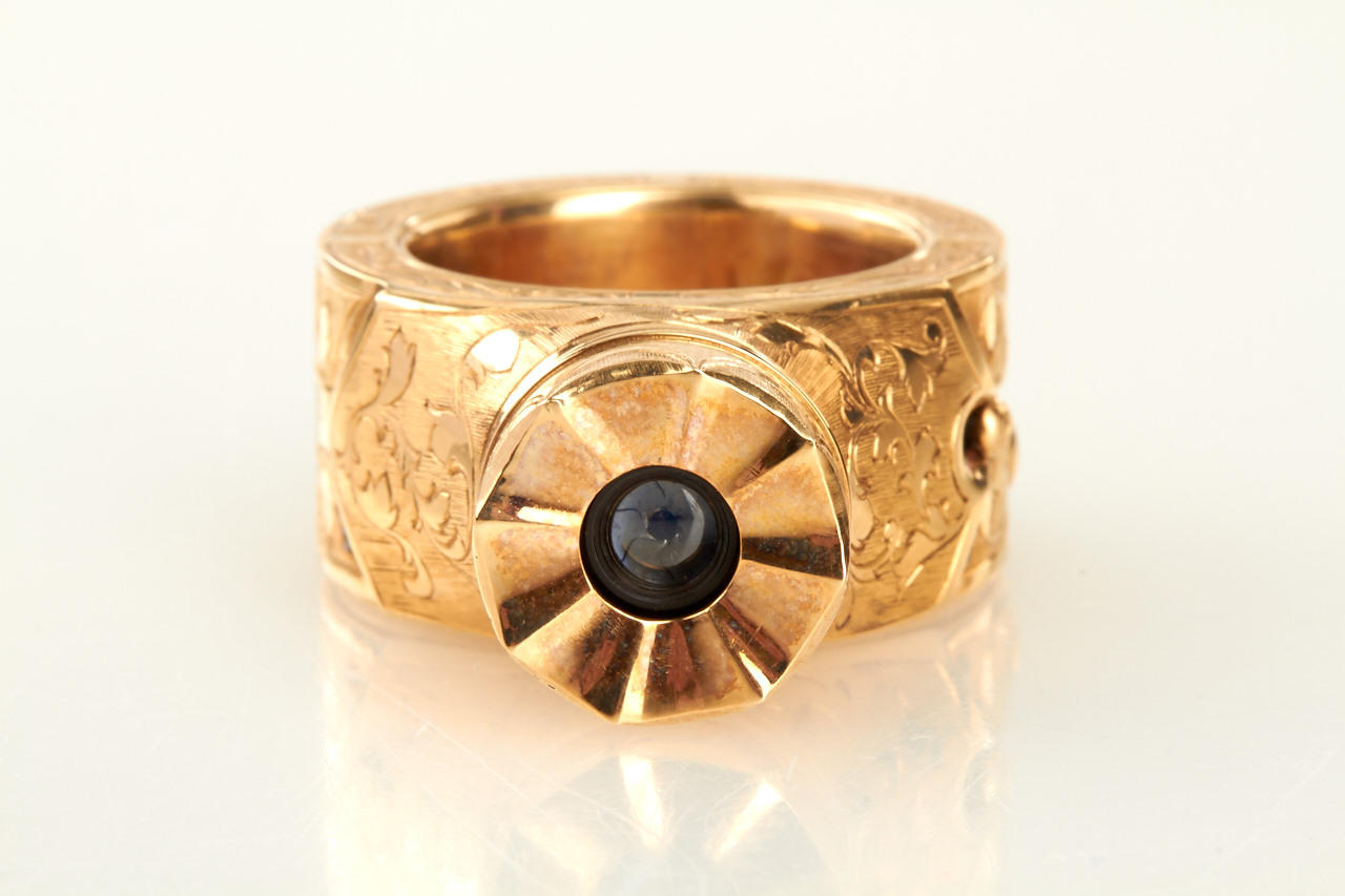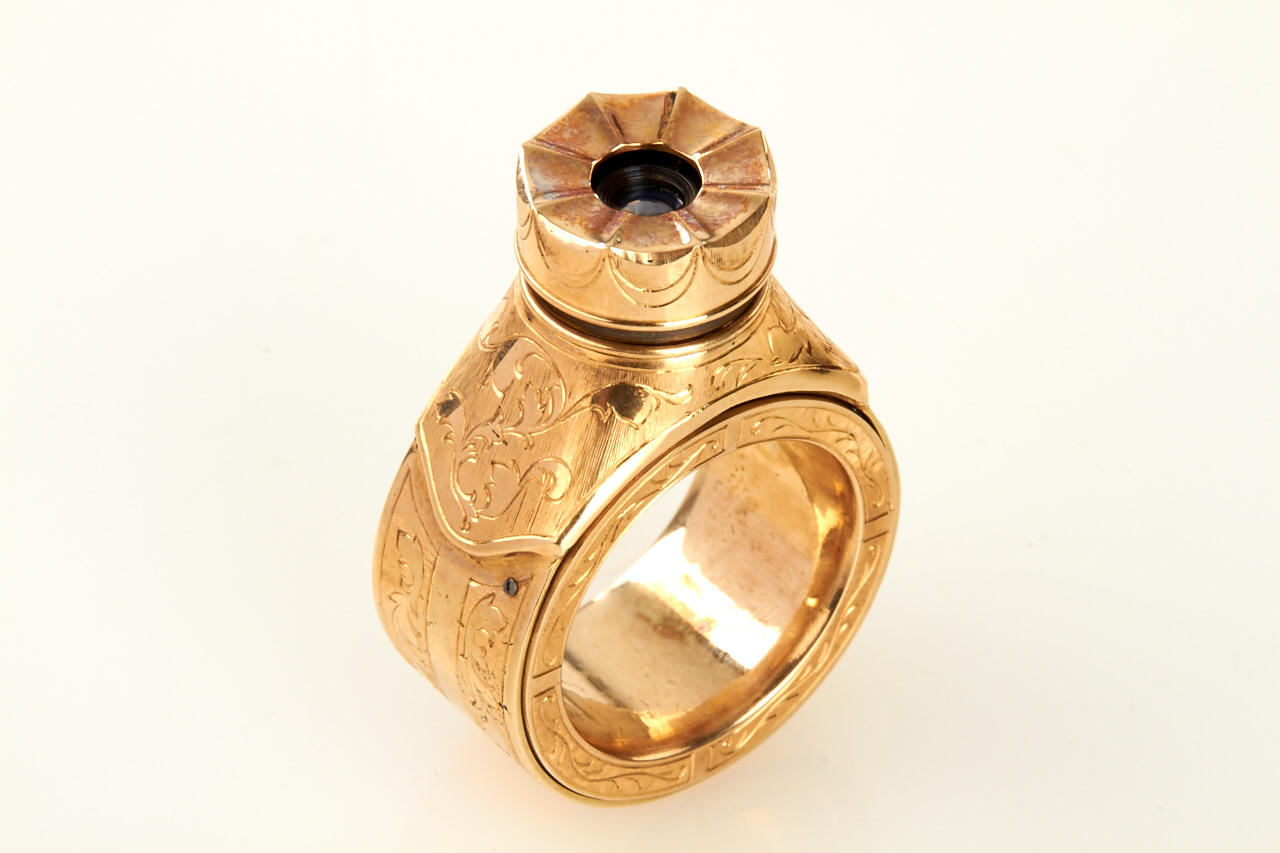 very rare gold-plated ring camera for 8mm film, crown-shaped bezel hiding a lens with variable aperture, working guillotine shutter, only few of these cameras have been discovered, every one in slightly different design