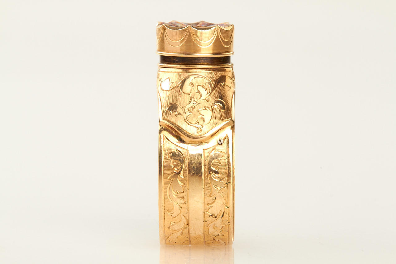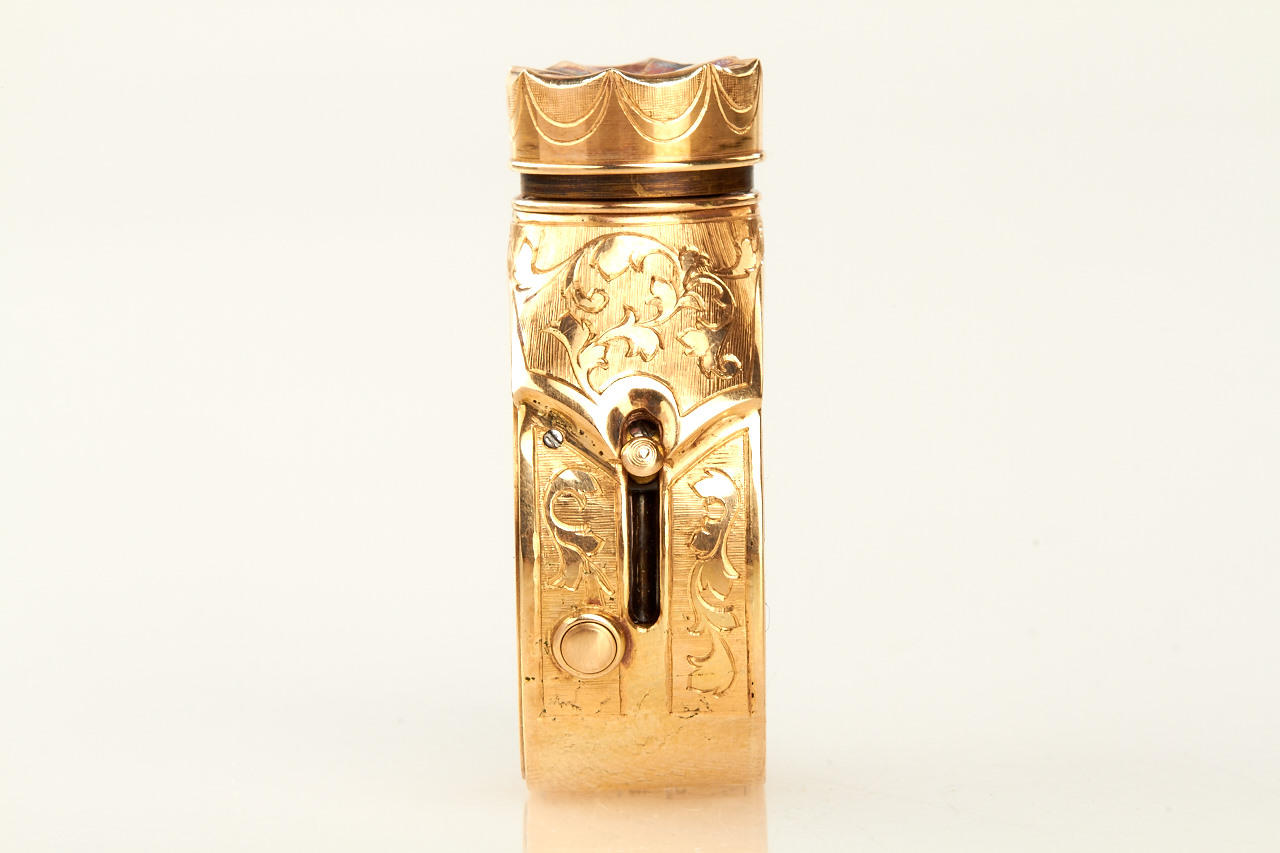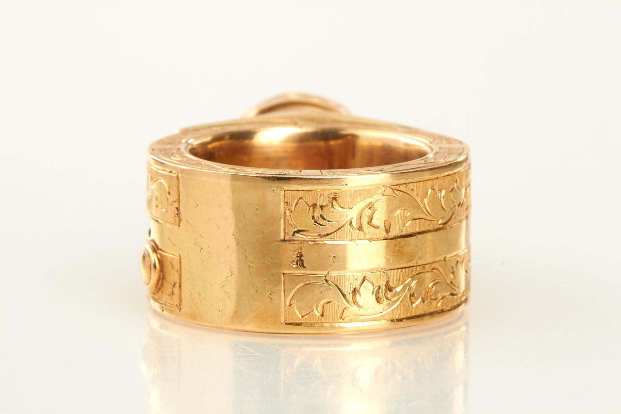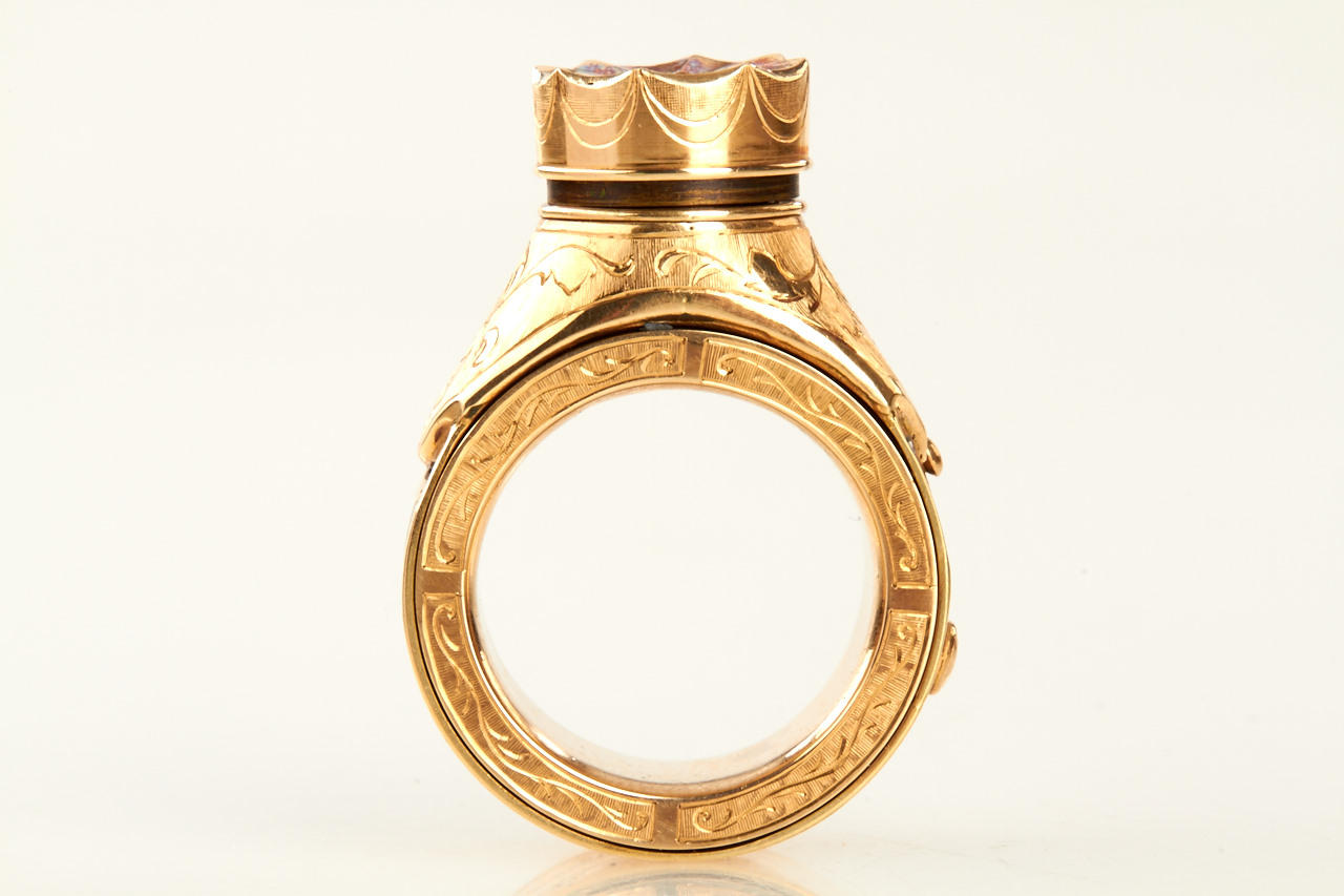 very rare gold-plated ring camera for 8mm film, crown-shaped bezel hiding a lens with variable aperture, working guillotine shutter, only few of these cameras have been discovered, every one in slightly different design
