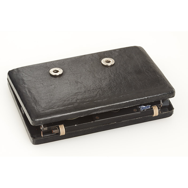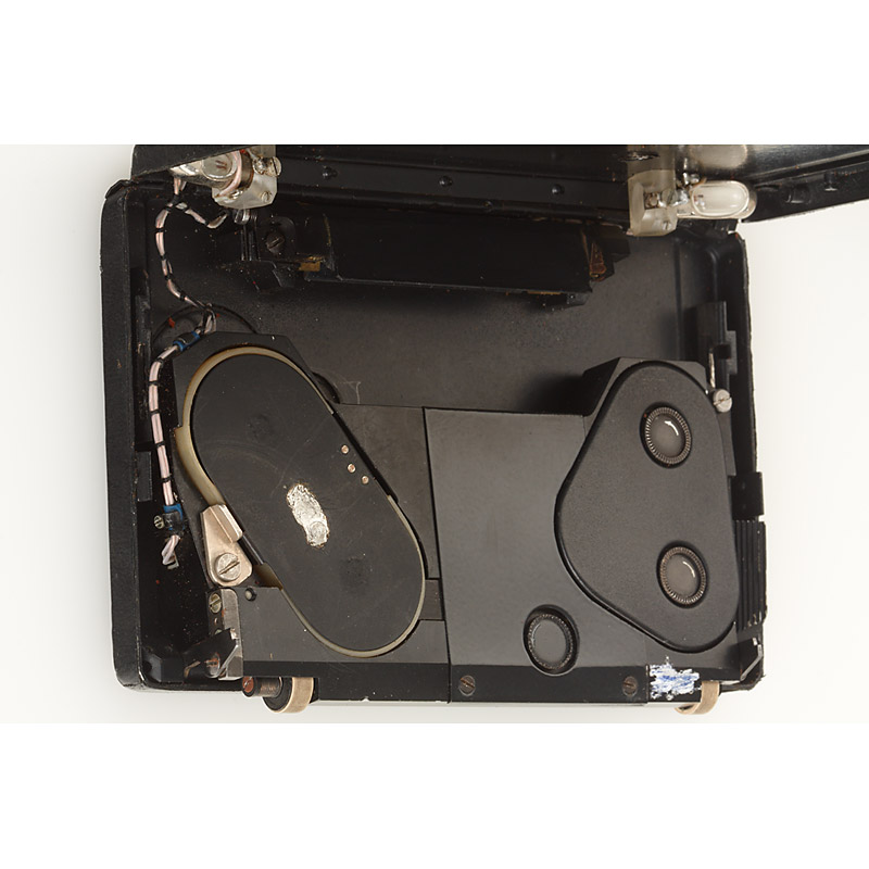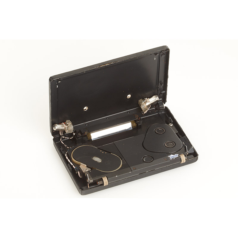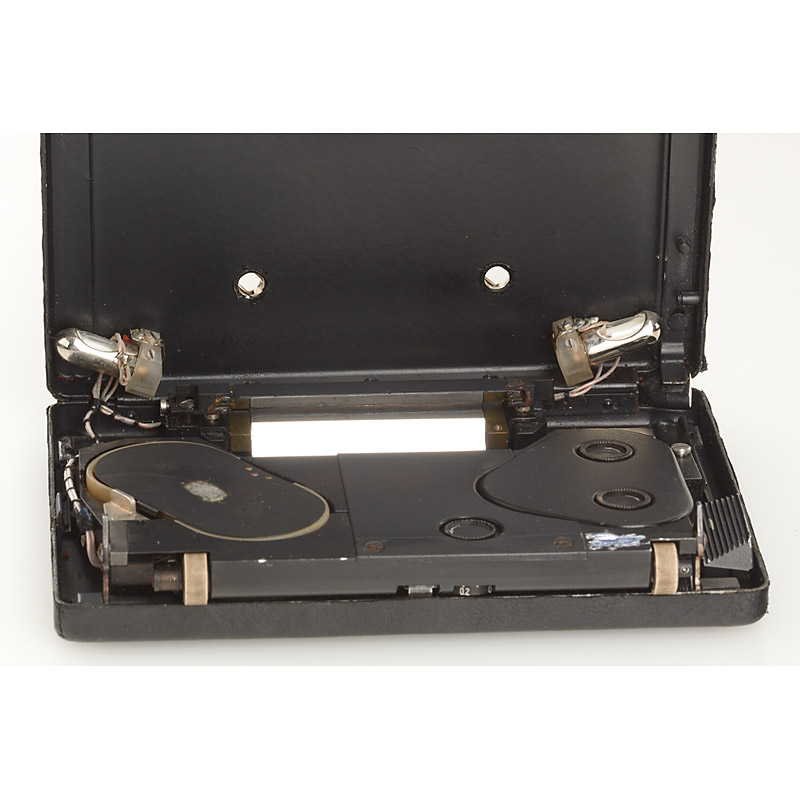 This very rare rollover camera was made in a special workshop of the KMZ combine at Krasnogorsk near Moscow. For copying documents it is rolled over the document left to right at a speed of 20cm/sec by hand and copies a 10cm wide strip of the document to a 8.3mm filmstrip in a special cassette. All serial numbers on the camera, the accessories and the original grey aluminium case were removed. The camera is disguised as a notebook. The camera has its own light source that switches on automatically when the camera is moved across the document. The outfit also comprises a crank operated precision film cutter that cuts two strips of 8,3mm out of a 35mm film. One cassette, charger for button cells (115 and 220V). See Keith Melton 'Ultimate Spy, Expanded Edition', page 100, a quite similar outfit was sold in our last auction (Lot 422)