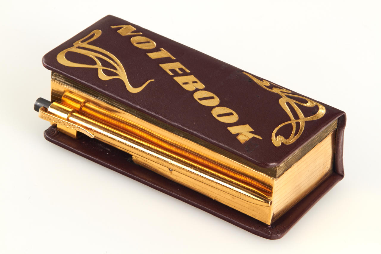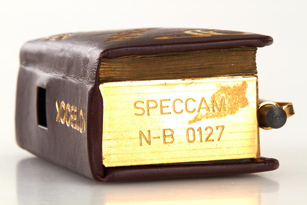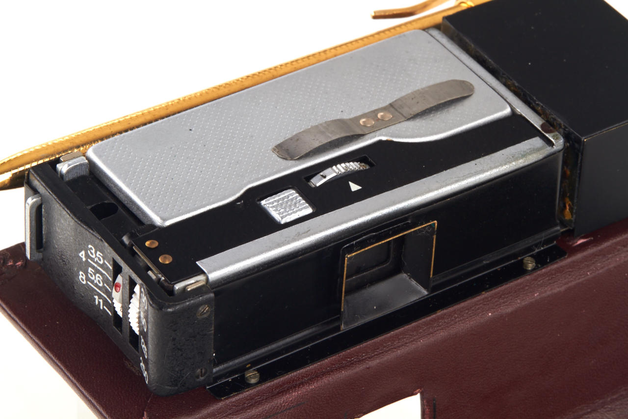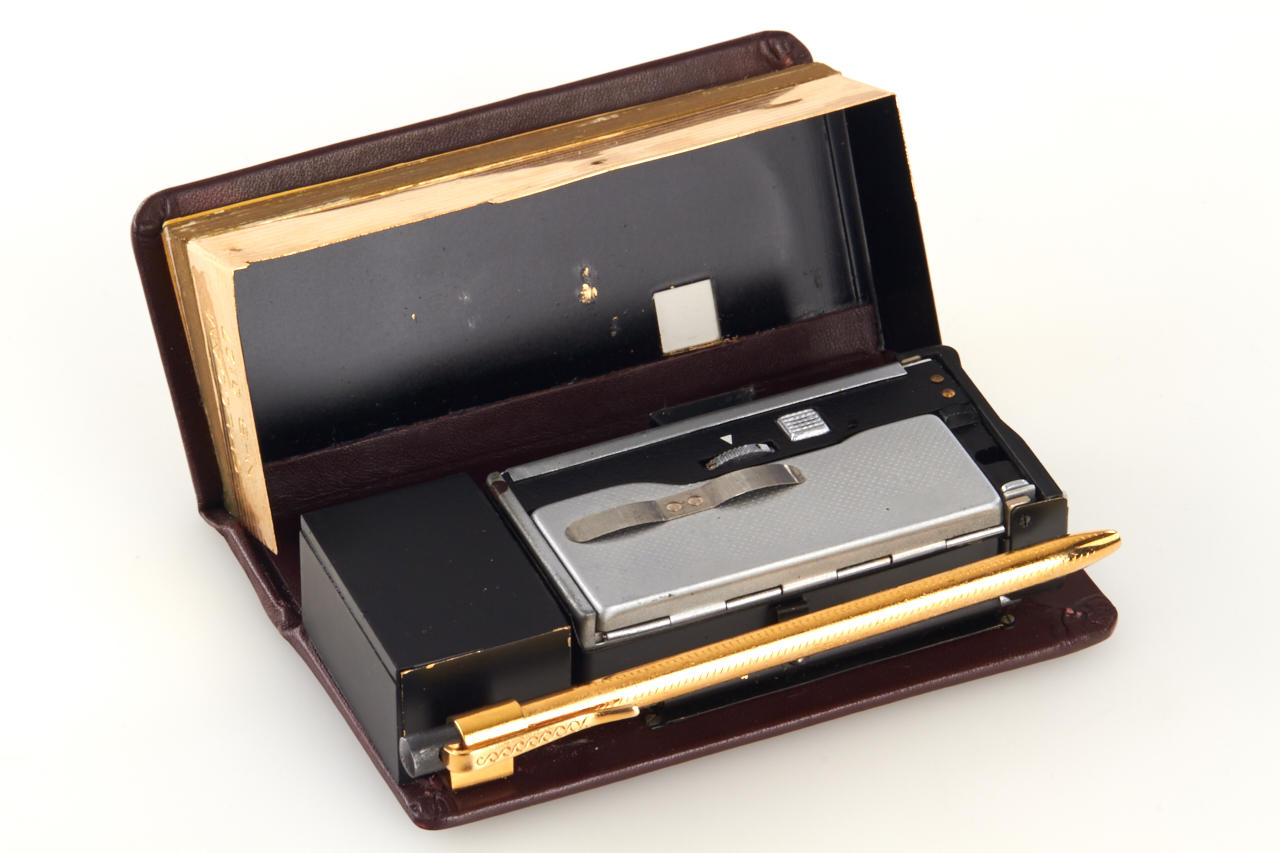 subminiature camera (Kiev 303) for 16mm film in special cassettes (type Minolta 16), housed in a fancy notebook with dark red leather cover with gold trim. The camera is tensioned by sliding the golden “pencil”. Serial number 0127 (other known serial numbers are 0117, 0119 and 0131). These outfits were made in the late 1980s in a small KGB workshop