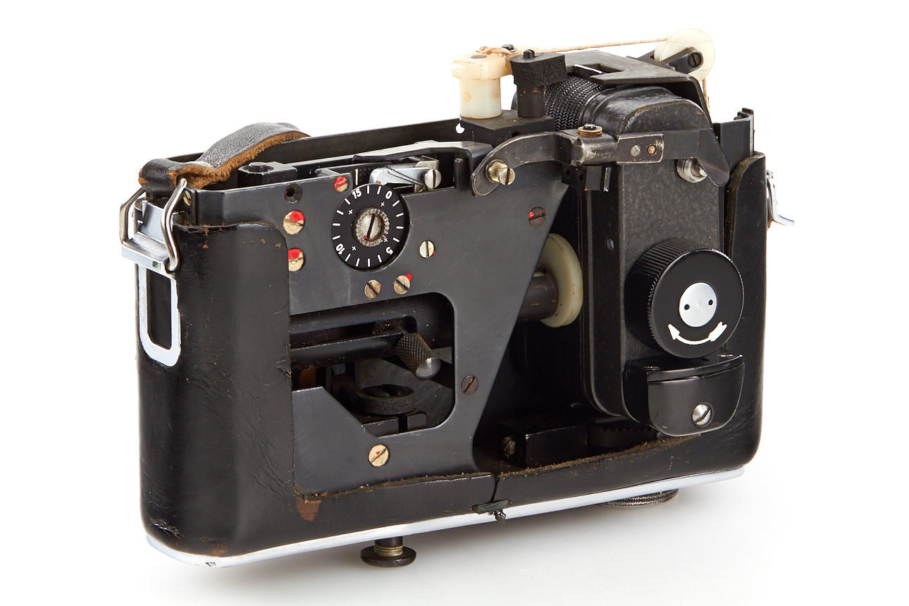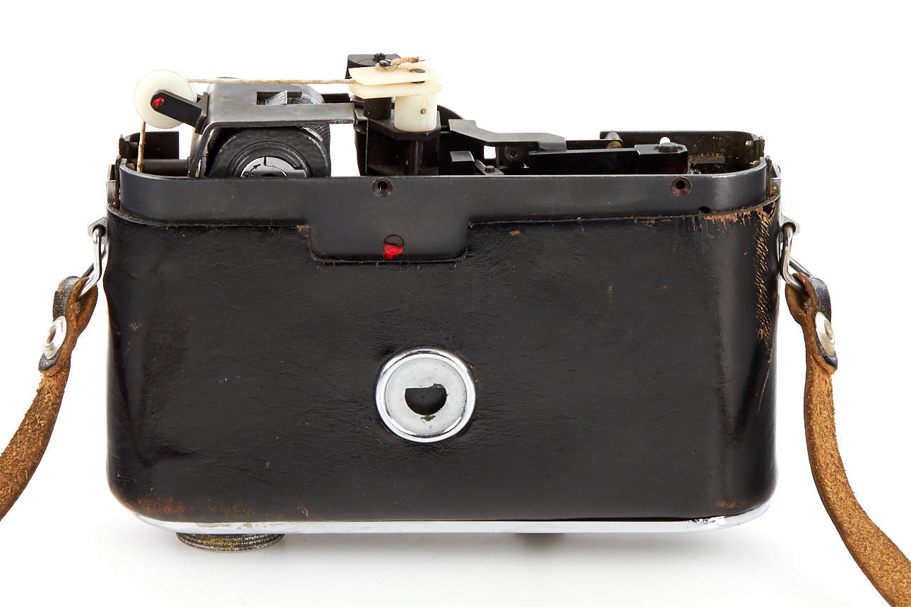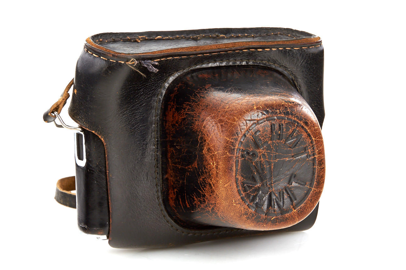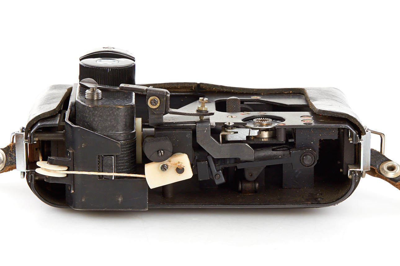 Russian F-21 spy camera hidden inside a Zenit ever-ready case, a built-in sophisticated mechanism allows taking photos through a masked window in the buckle of the strap fitting, shutter release is hidden in the base of the case, in very good working condition