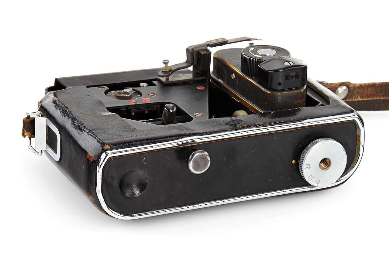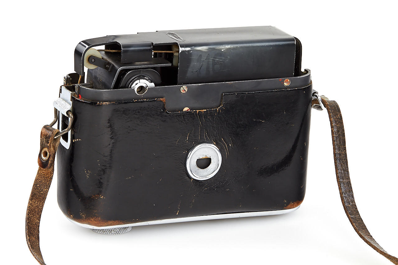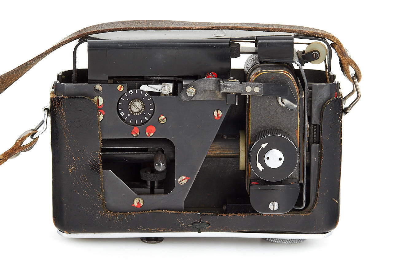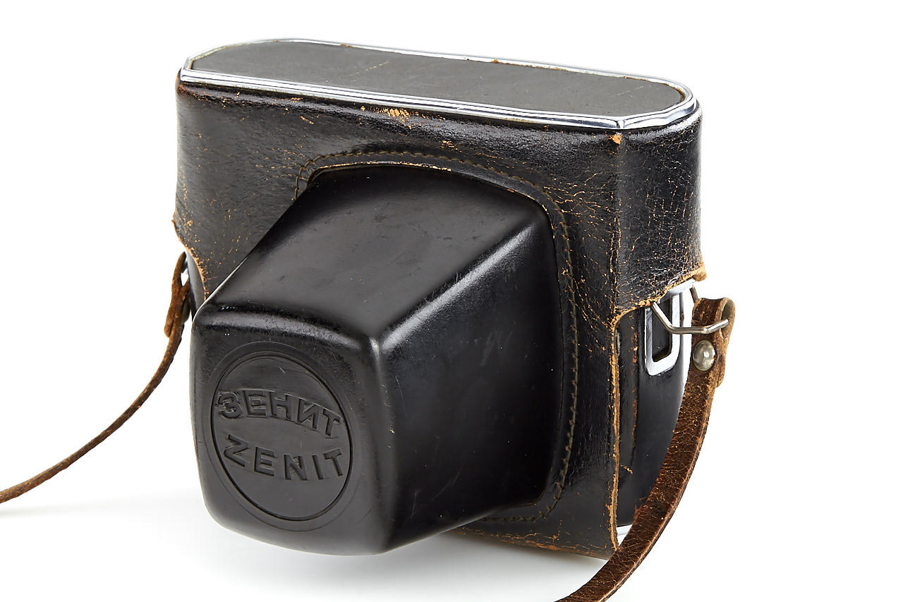 Russian F-21 spy camera hidden inside a Zenit ever-ready case, a built-in sophisticated mechanism allows taking photos through a masked window in the buckle of the strap fitting, shutter release is hidden in the base of the case, in very good working condition