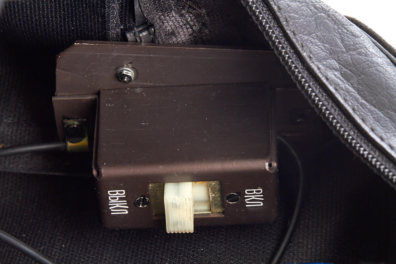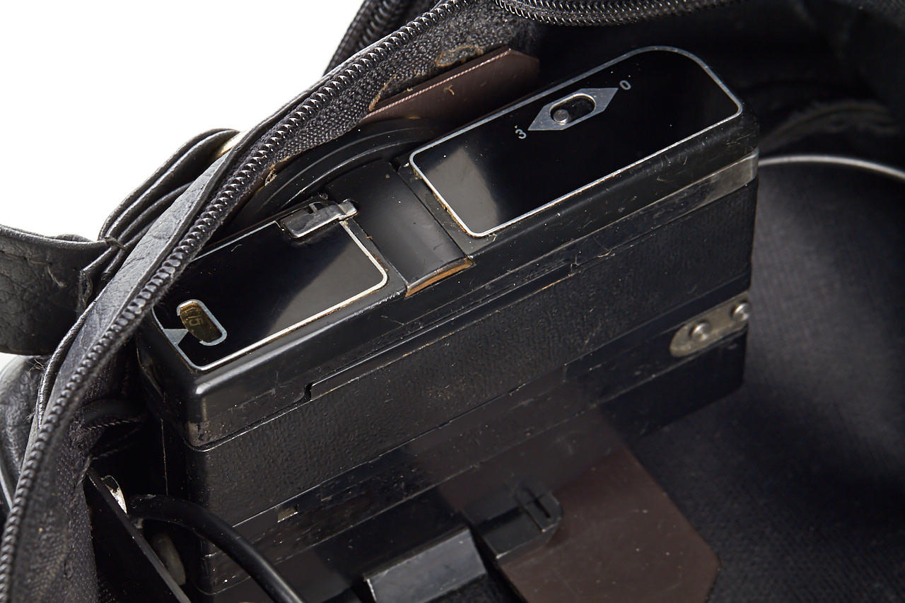 extremely rare original KGB outfit consisting of a motorized Zakhod camera, camouflaged in the form of a black bag, with an (unmarked) lens (probably 2.8/24mm), one electric camera release with battery compartment, another electric release built-in inside of the case, another one underneath the case concealed as one of the feet, several mounting parts and cables for other devices, pictures are taken through a clasp at the side of the bag