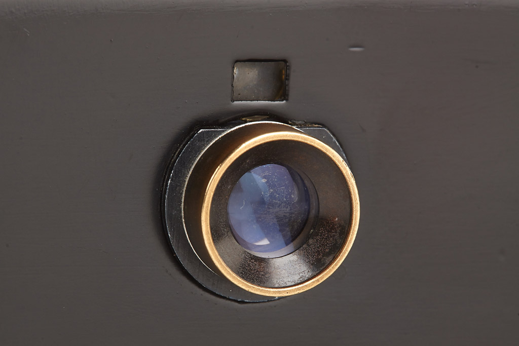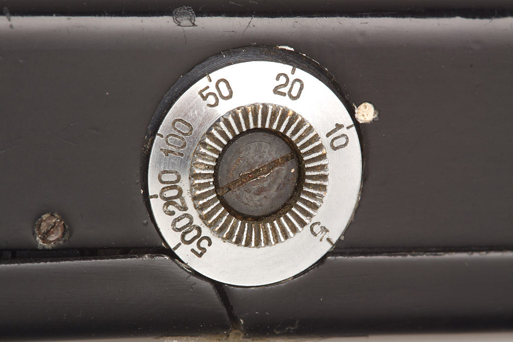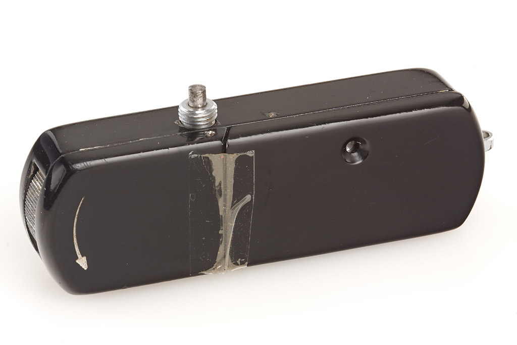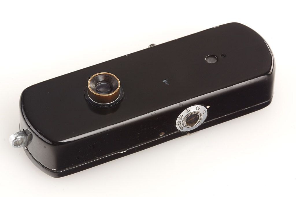 improved model of the Totchka with Galilean finder and slightly altered Industar 3,5/15mm lens, round shutter speed dial (marked 5, 10, 20, 50, 100, 200 and 500). Frame counter with rotating engraved disc under small round hole in front, in original condition (not operable)