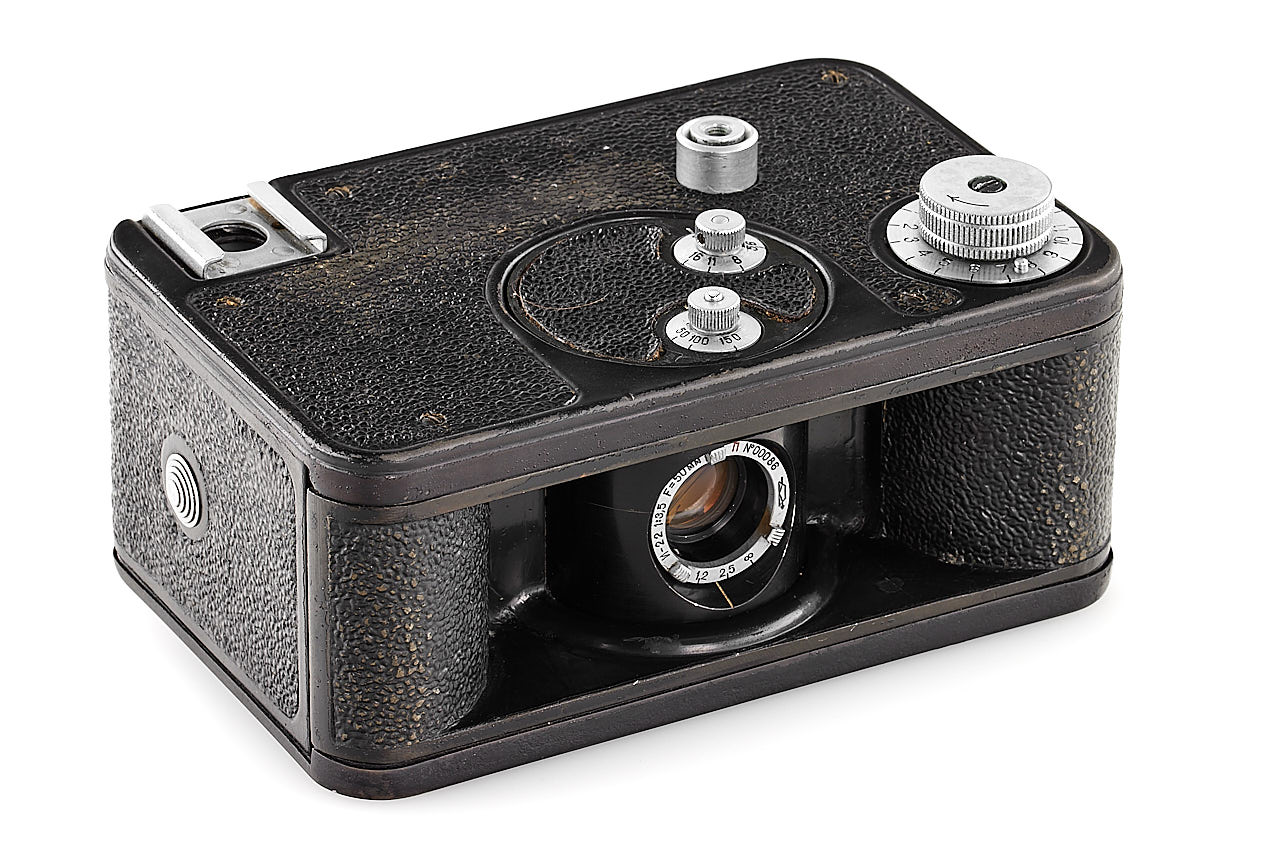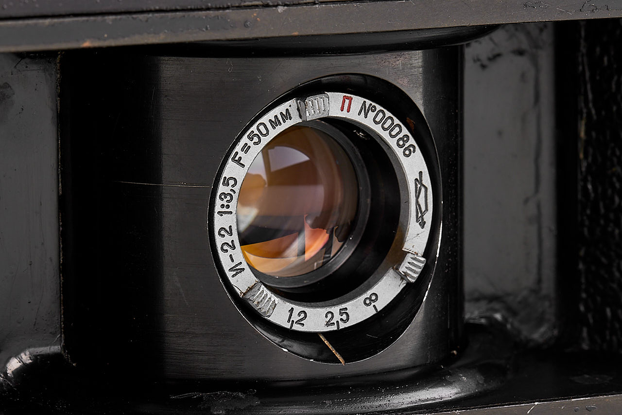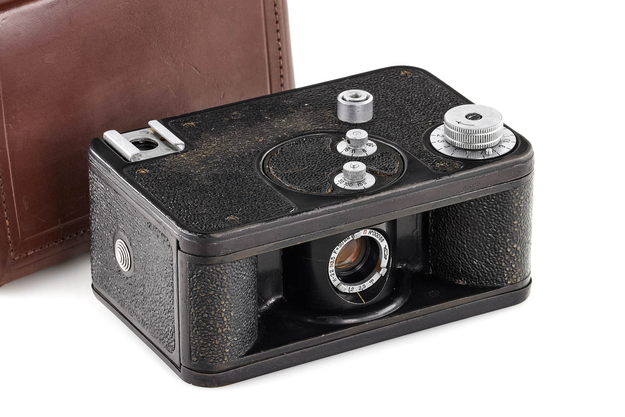 Extremely rare and interesting prototype of the panorama camera KMZ FT-3, only about 100 units were finally produced, the project was abandoned due to too high production costs, for 24x120mm frame on 35mm film, in very good condition, note the absence of nameplate or camera serial number, with Industar-22 3.5/50mm no.00086, rare yellow filter, both spools and original leather case, no external finder.
