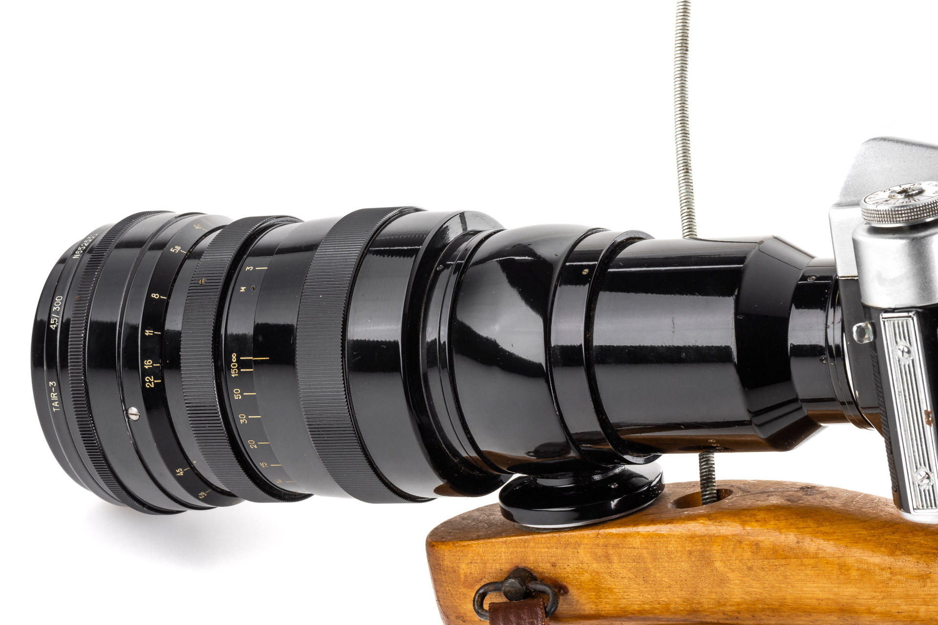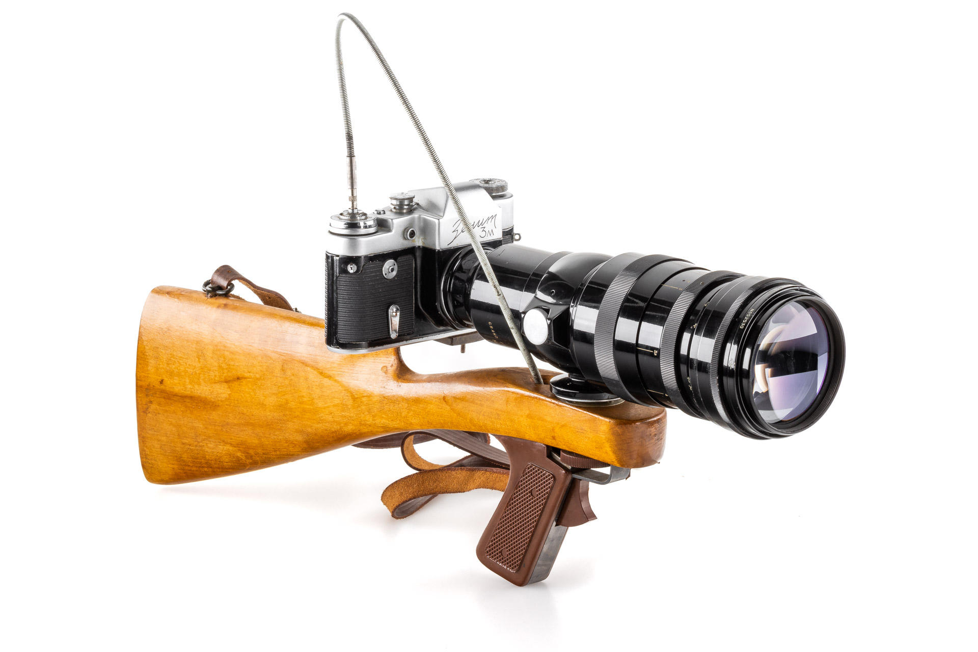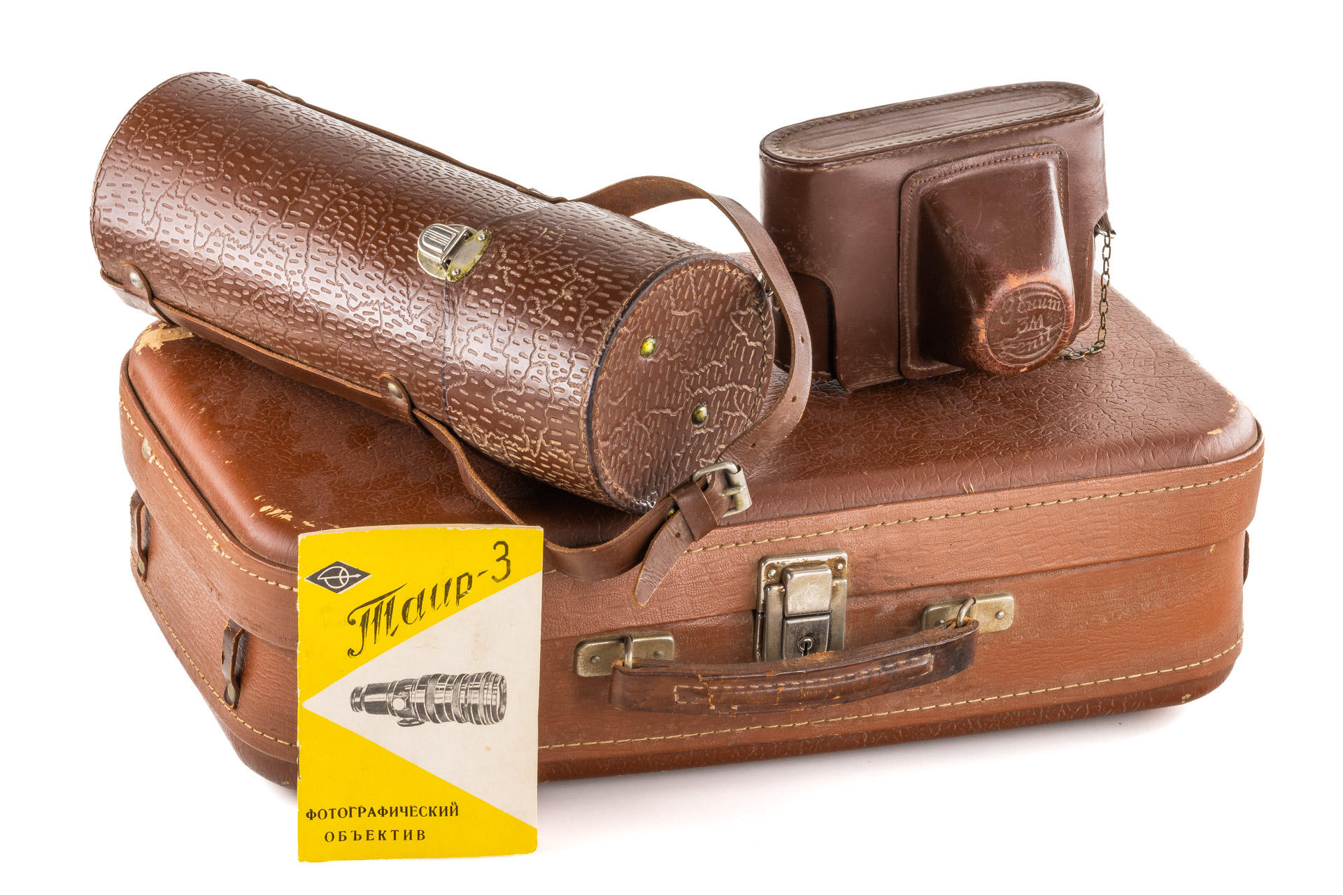 a very rare first version of the Fotosniper outfit, designed to work with SLR cameras, including a black painted, 1965 Tair-3 4.5/300mm no.652530 (M39 mount, with yellow filter, hood and caps), matching Zenit 3m no.65081486, instructions for the lens and a large brown outfit case, this outfit represents a missing link between the war-time FS-2 outfits and much more modern FS-3