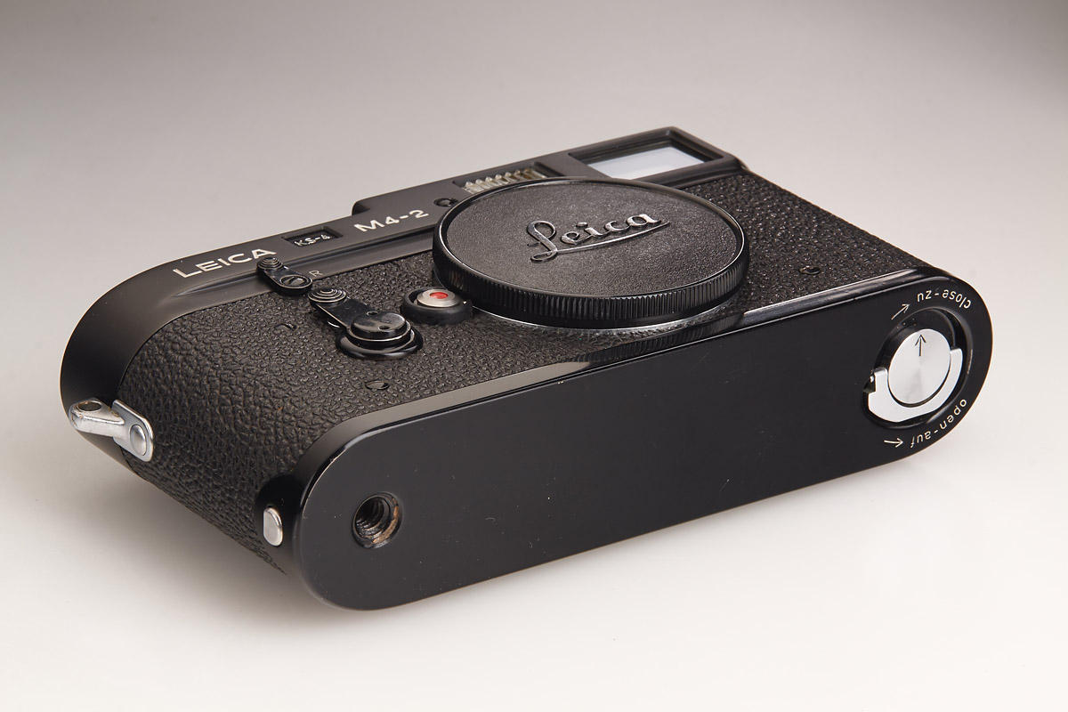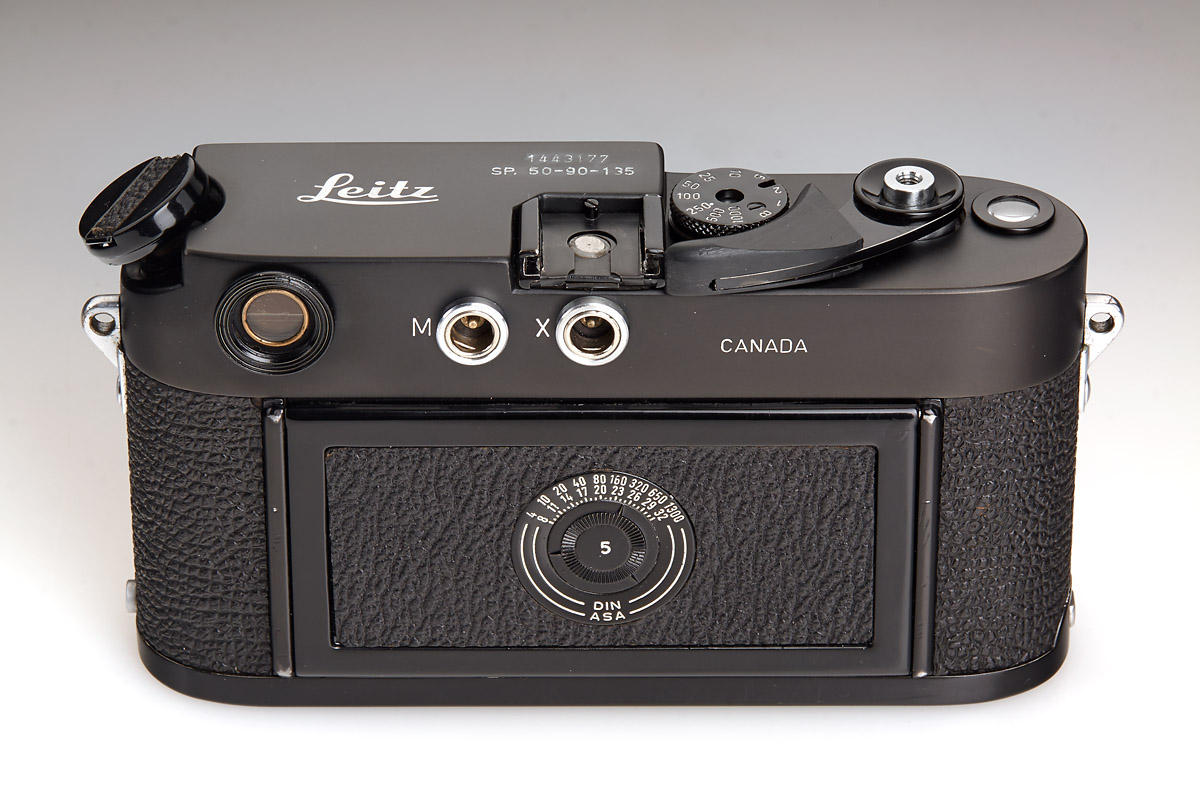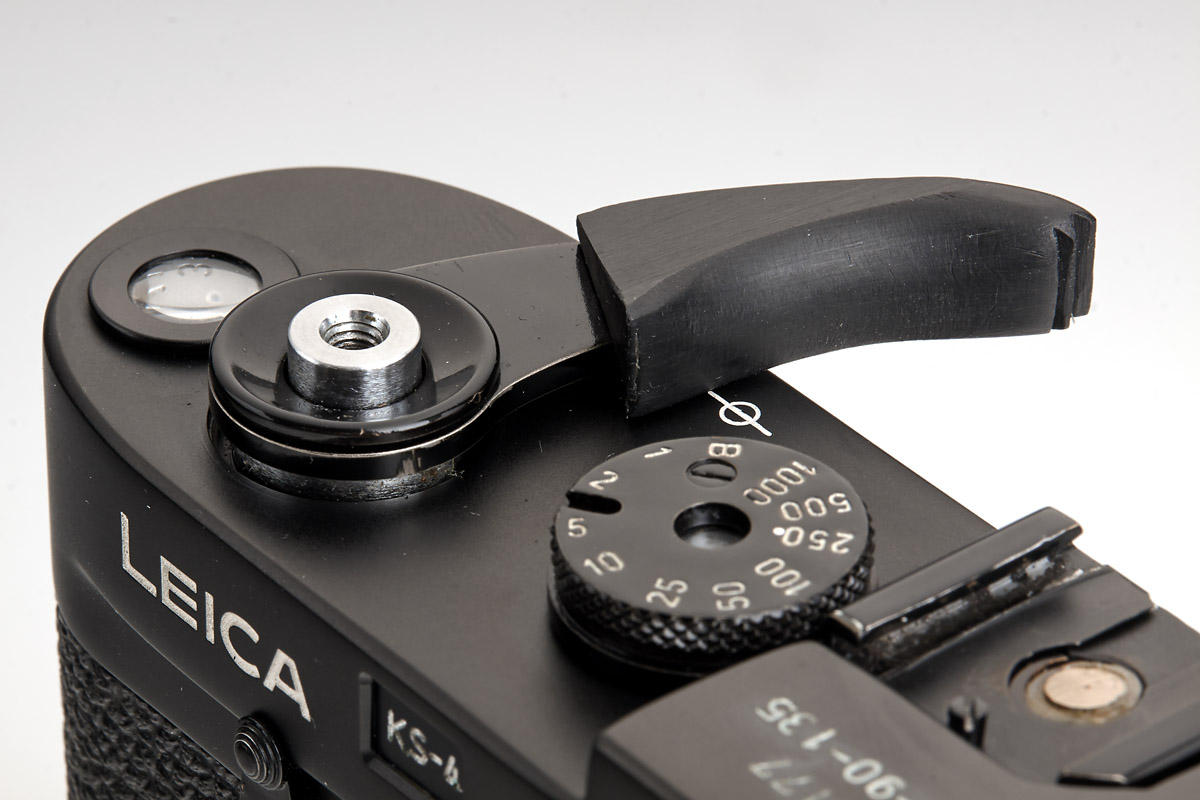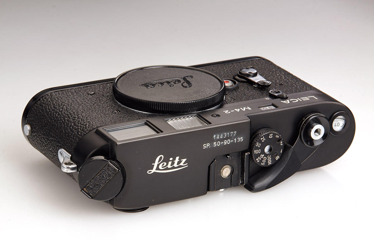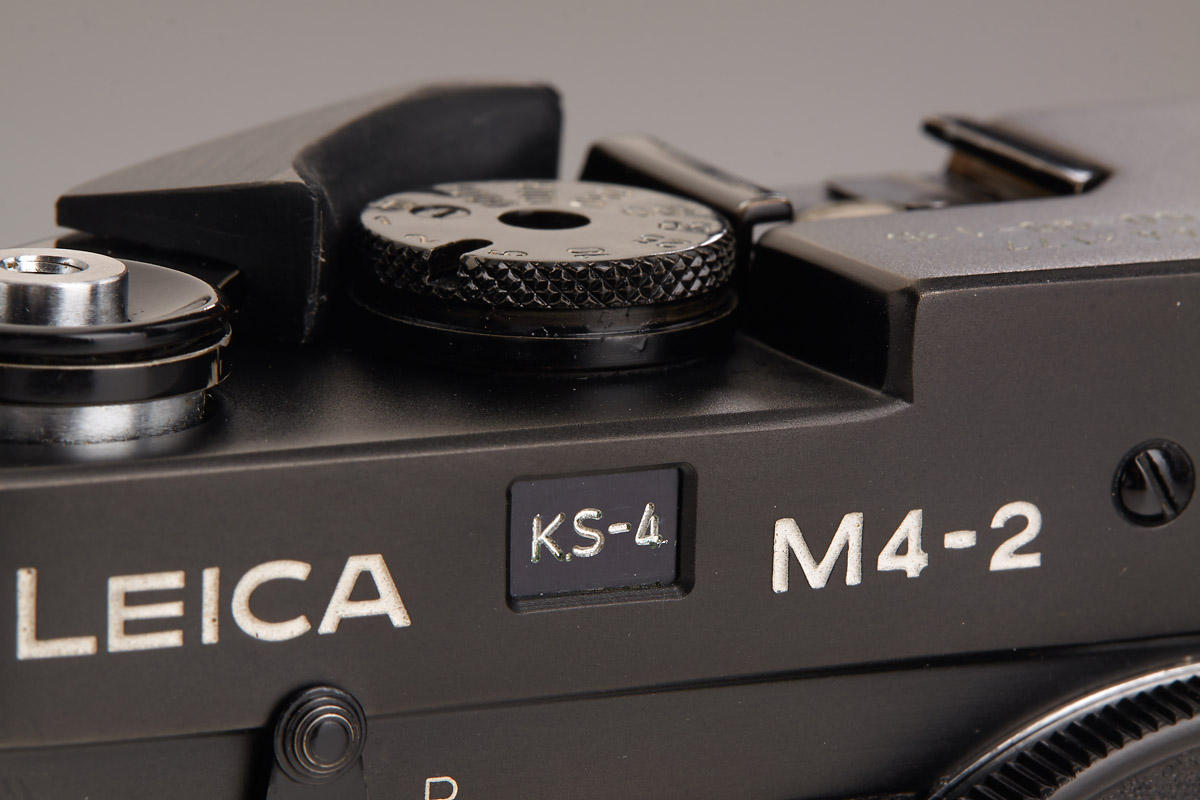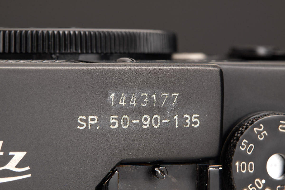 Engraved “SP.50-90-135 1443177” on top plate, “KS-4” on front, “5” on black paint back door; the base plate, rewind knob, speed dial, lever are also finished in black paint. Literature Illustrated in Jim Lager, vol. 1, p. 138 Lager (Volume 1 - Cameras page 138) describes this unique camera as a unusual M Leica with M4-2 top cover, early m3 body housing (double stroke), modified rewind and advance assemblies, old shutter speed sequence, pre-M4 synch. outlets, hot shoe, no rangefinder, but 50, 90 and 135 framelines of M3 viewfinder visible at once. Engraved 'SP.50-90-135 1443177' on top plate, 'KS-4' on front, '5' on black paint back door, also the base plate, rewind knob, speed dial, lever are black paint Jim Lager (Volume 1 - Cameras Seite 138) beschreibt diesen Prototyp als einzigartige Kamera: als ungewöhnliche M Leica mit M4-2 Deckkappe, mit einem frühen M3 Gehäuse (Doppelaufzug), modifizierter Rückspulung und Aufzugsmechanismus, frühes Zeitenrad, vor-M4 Synchroanschlüssen und Zubehörschuh, ohne Entfernungsmesser, aber mit Leuchtrahmen für 50, 90 und 135 mm in M3 Sucher, die alle gleichzeitig sichtbar sind.